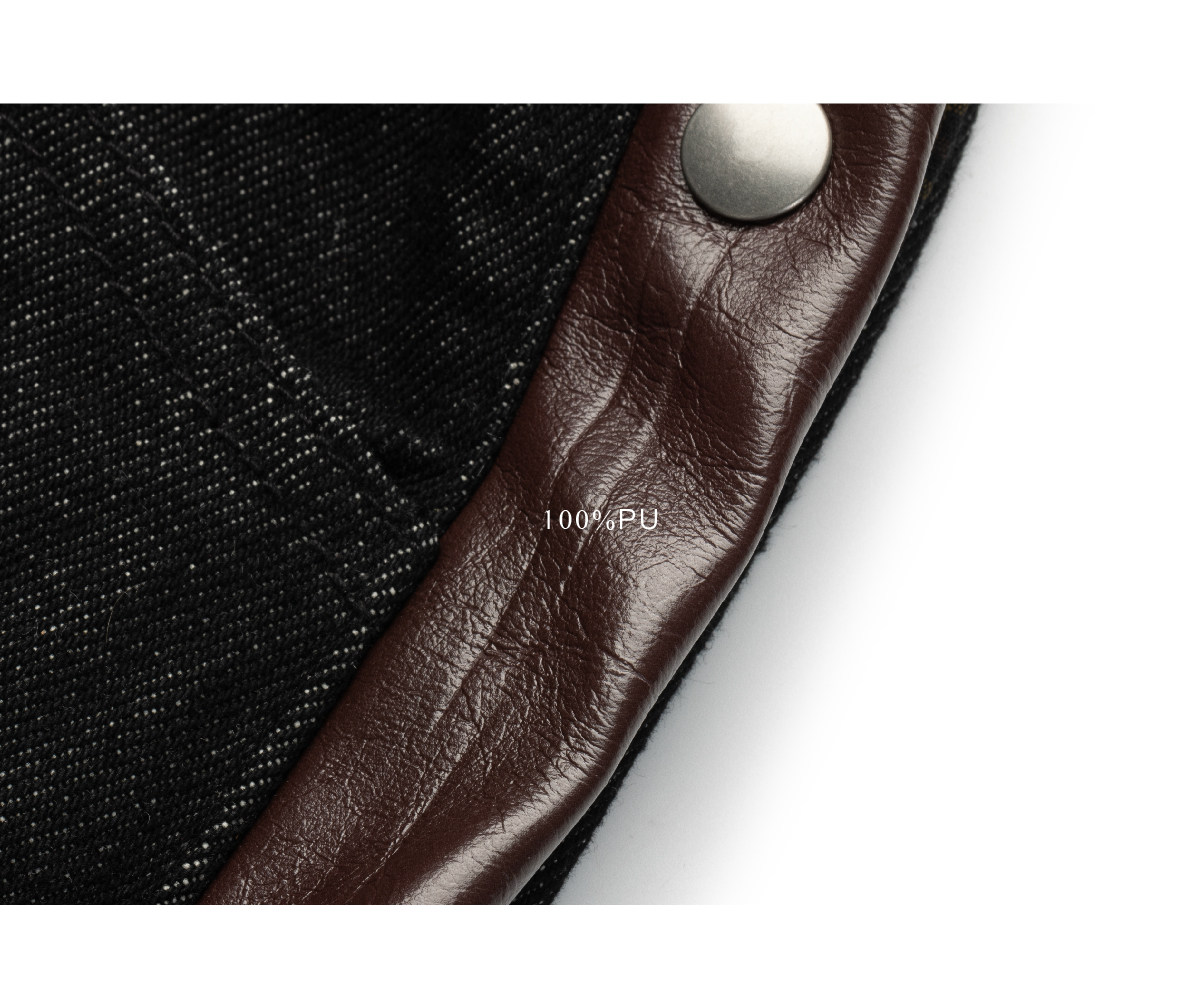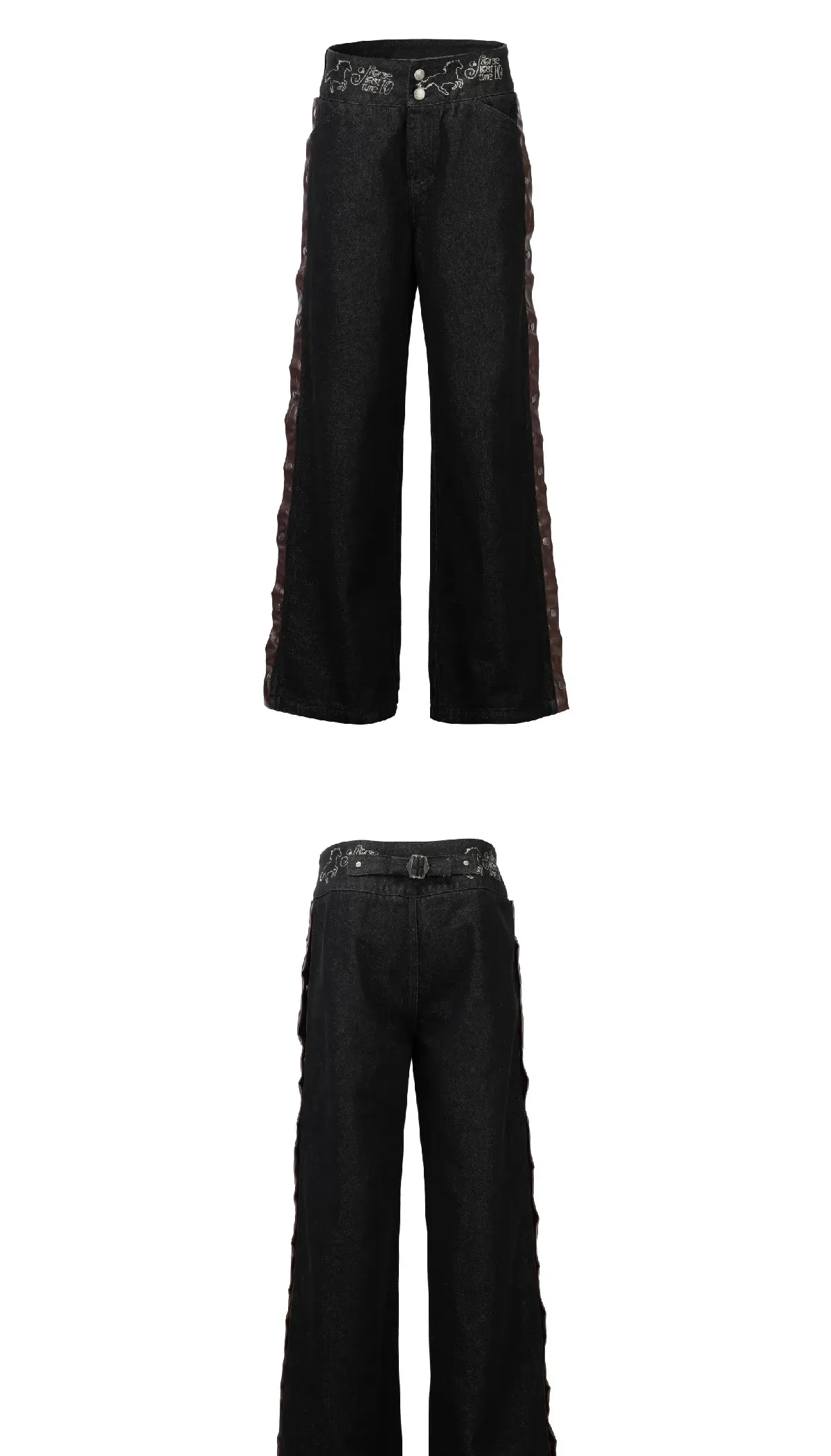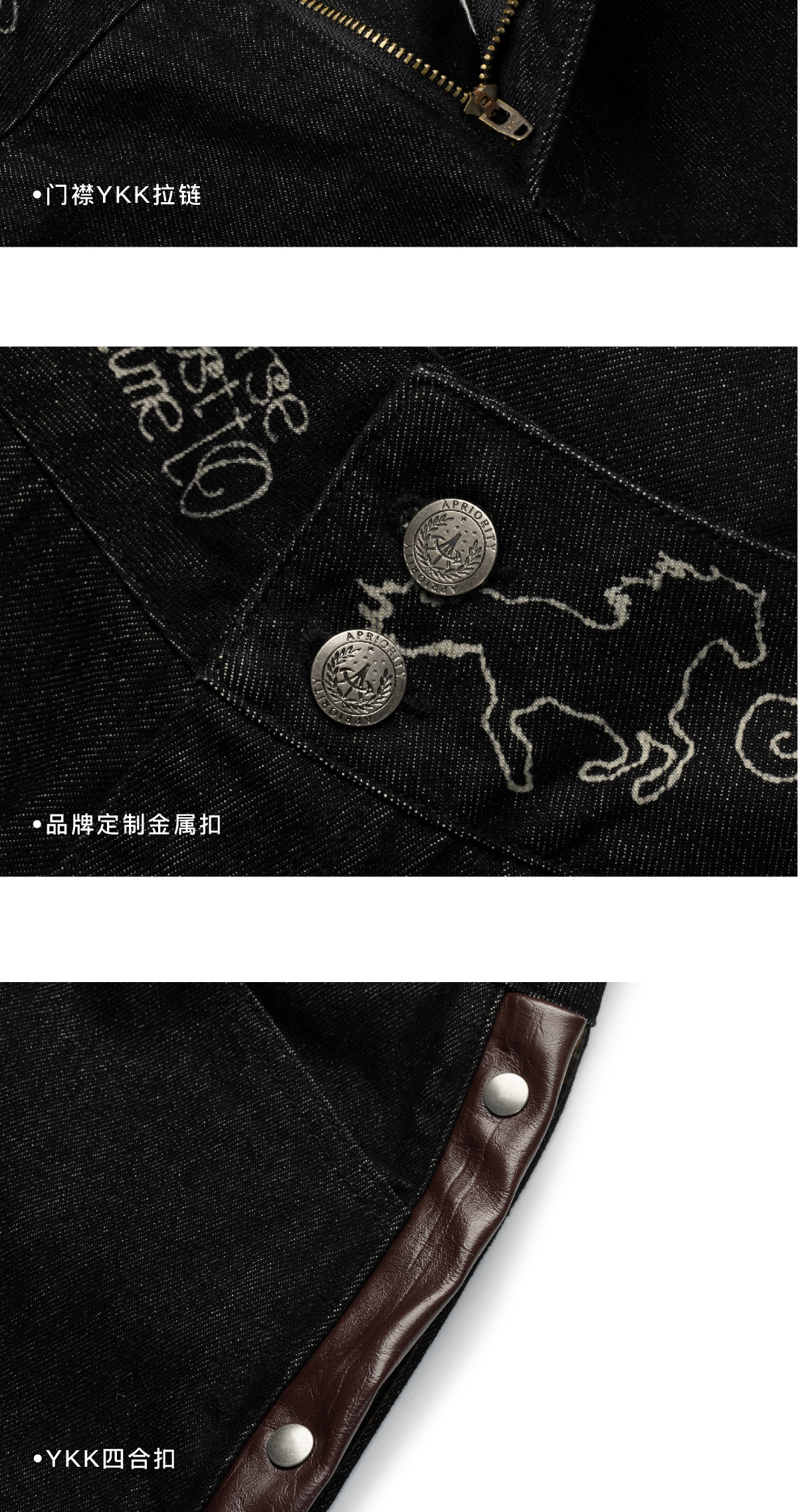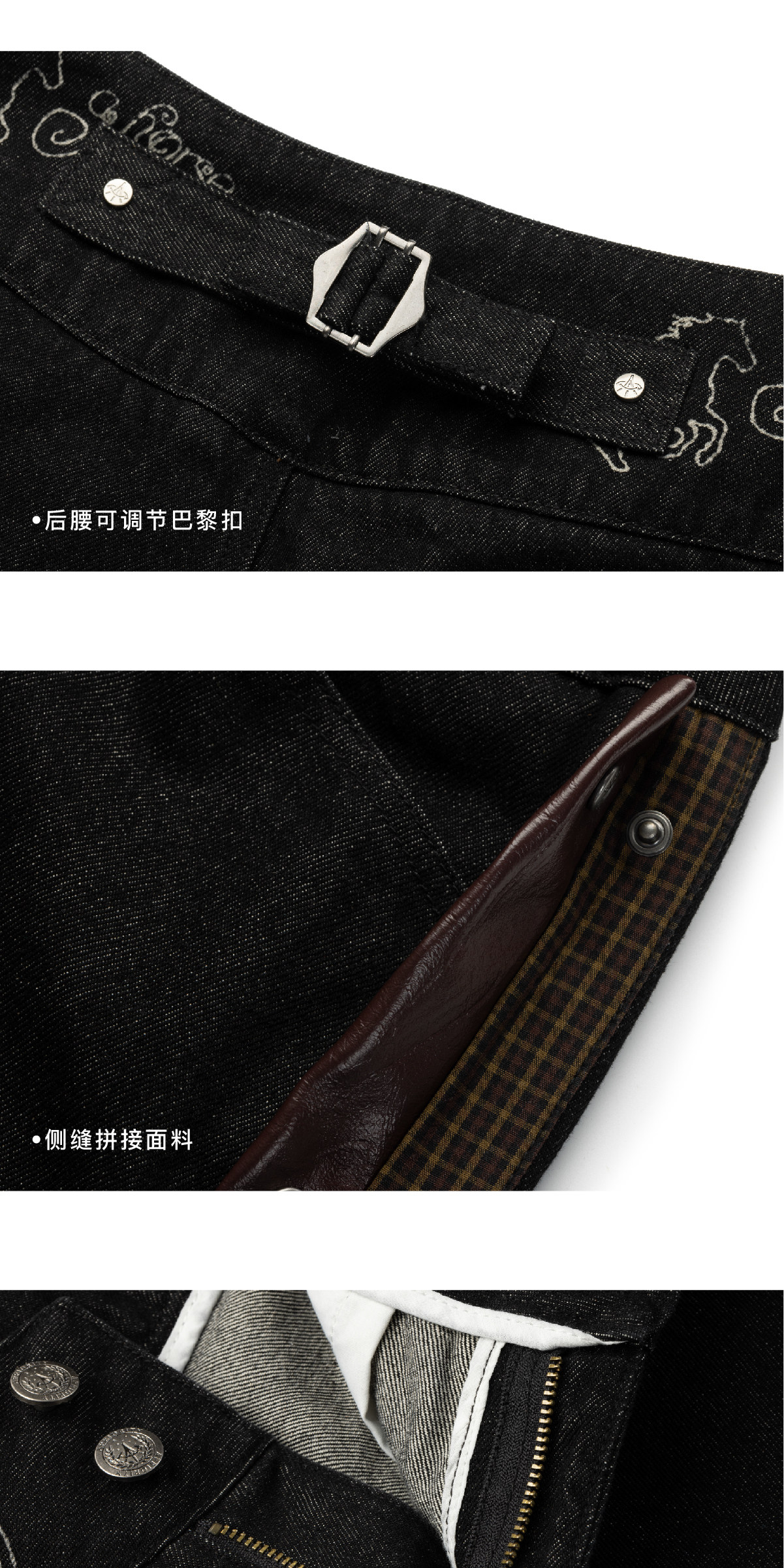 Design Details: Constructed from black raw selvedge denim for a rigid structured silhouette, with waistband featuring bleach-out printing of original graphic design, adjustable back Paris buttons in gunmetal black at the rear waist, side seam splicing that reveals burgundy leather and hidden check-pattern fabric underneath, brand-custom snap buttons in aged antique silver, and YKK zipper fly closure.