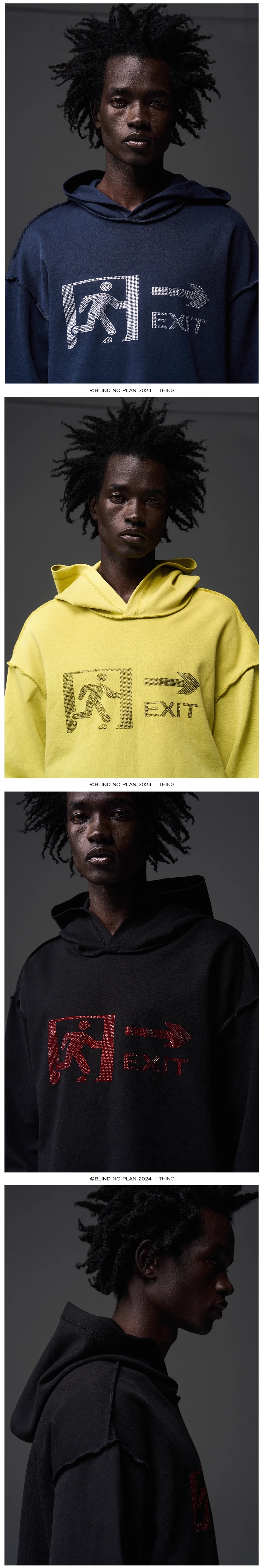 Design Details: The print features the iconic "EMERGENCY EXIT" logo with rhinestone embellishments to enhance the visual effect. Reverse seam pressing technique is applied at the joints of the garment.