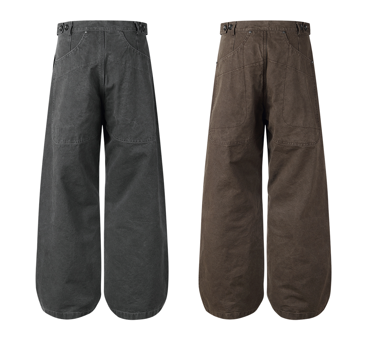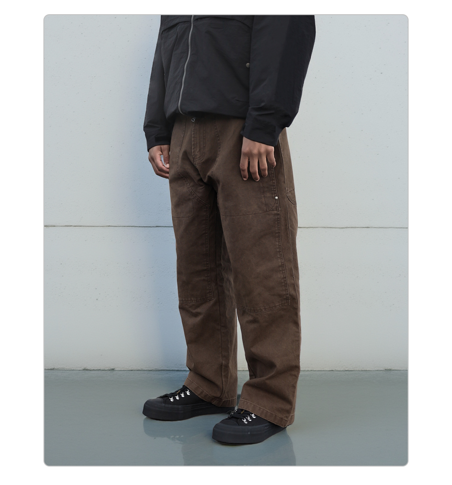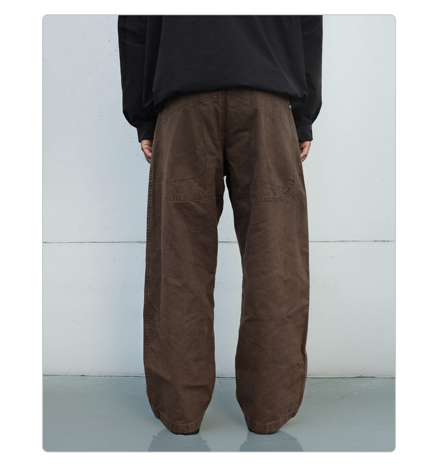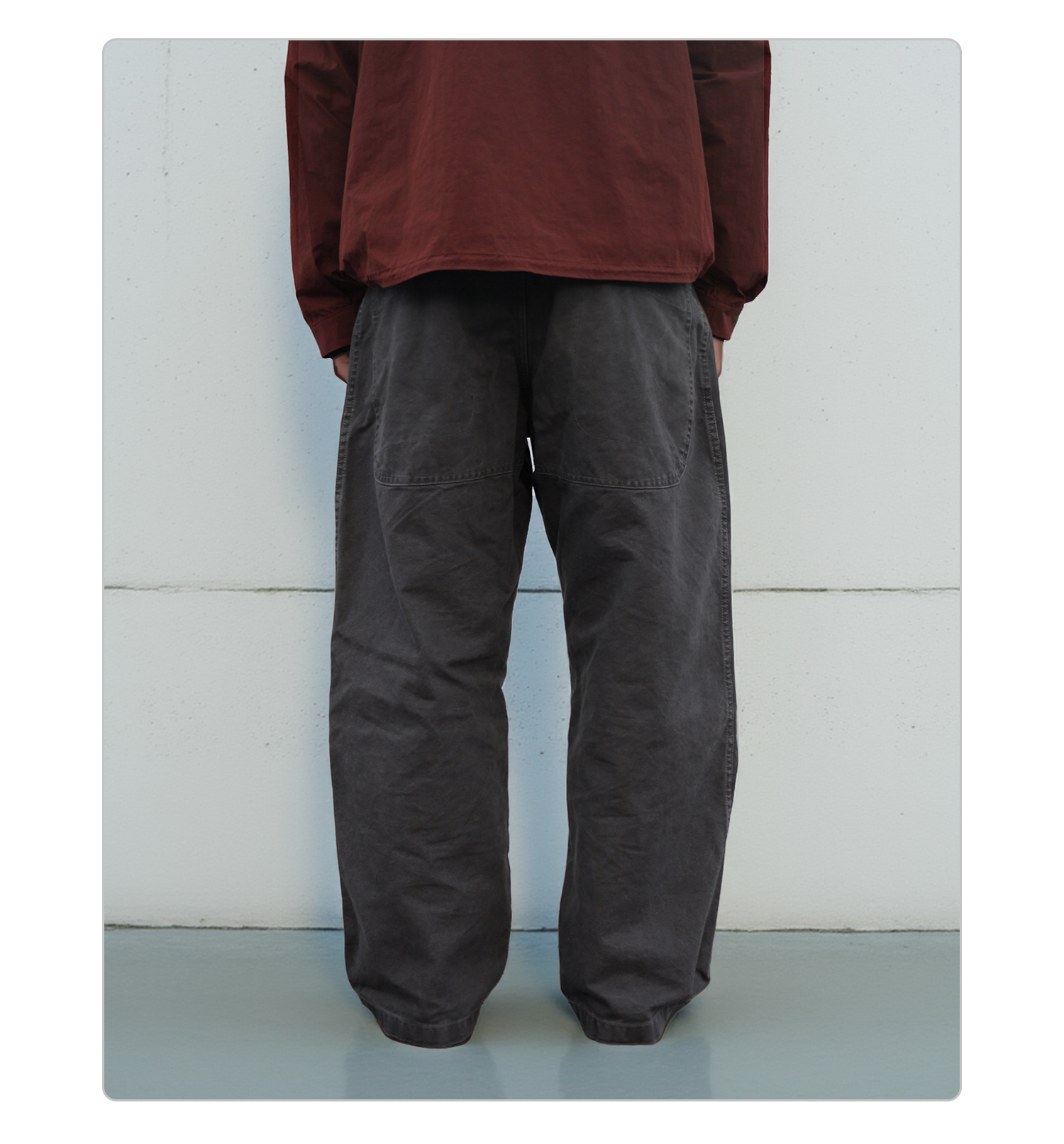 - The “Hunting” lumber pants draw inspiration from the concept of “reborn from old times,” featuring a washed-distressed process that gives the garment a unique aged character. The fabric undergoes multiple stone-wash and enzyme-wash treatments, resulting in a soft, faded vintage tone and an old-item-like hand feel. Structural paneling is applied at the thighs and back waist, with exposed stitching that echoes the utilitarian aesthetic of early workwear. The overall silhouette maintains the classic loose profile and tool loop of traditional lumber pants. This is a piece that carries its own story—merging rugged labor heritage with contemporary deconstruction design.