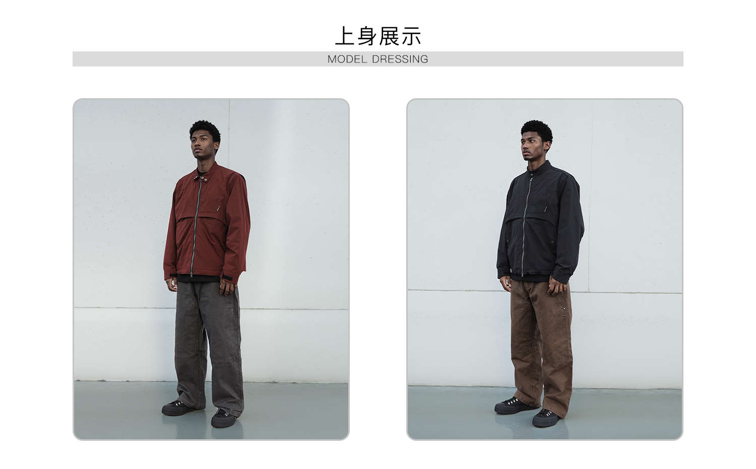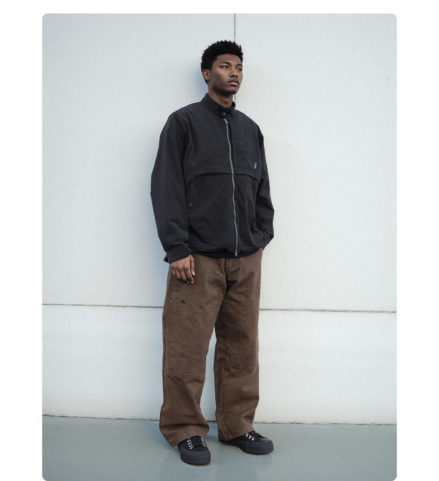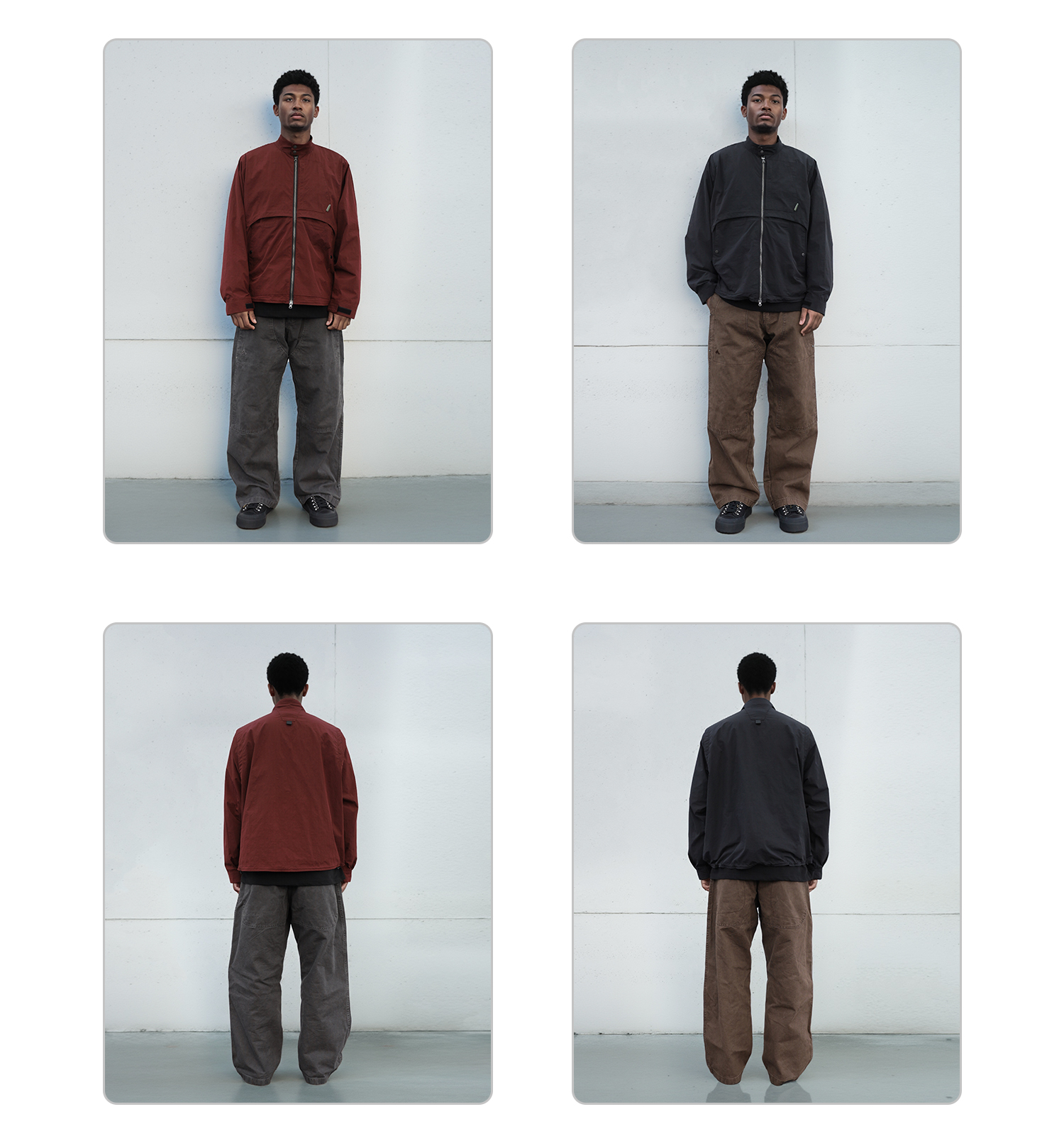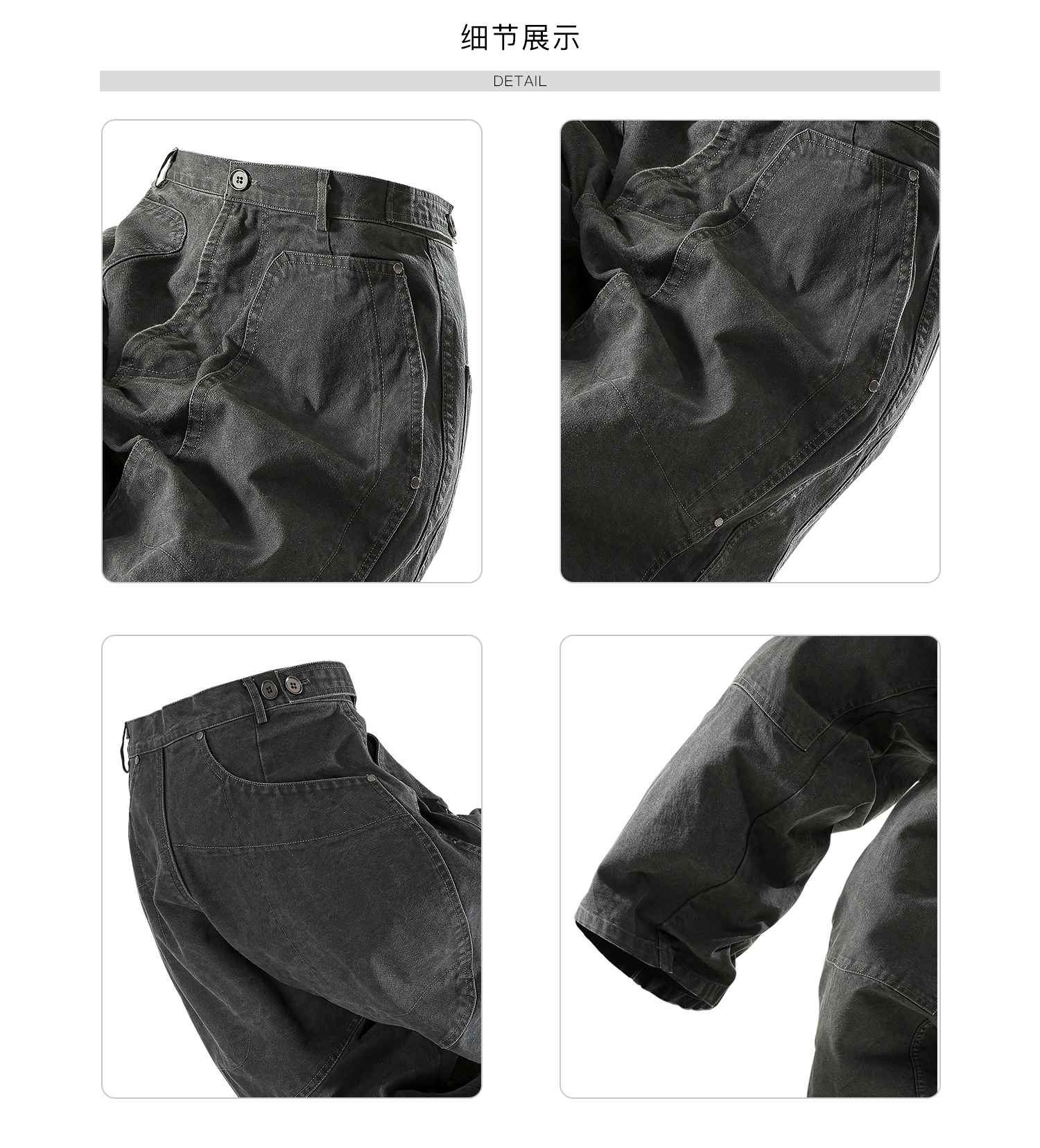- The “Hunting” lumber pants draw inspiration from the concept of “reborn from old times,” featuring a washed-distressed process that gives the garment a unique aged character. The fabric undergoes multiple stone-wash and enzyme-wash treatments, resulting in a soft, faded vintage tone and an old-item-like hand feel. Structural paneling is applied at the thighs and back waist, with exposed stitching that echoes the utilitarian aesthetic of early workwear. The overall silhouette maintains the classic loose profile and tool loop of traditional lumber pants. This is a piece that carries its own story—merging rugged labor heritage with contemporary deconstruction design.