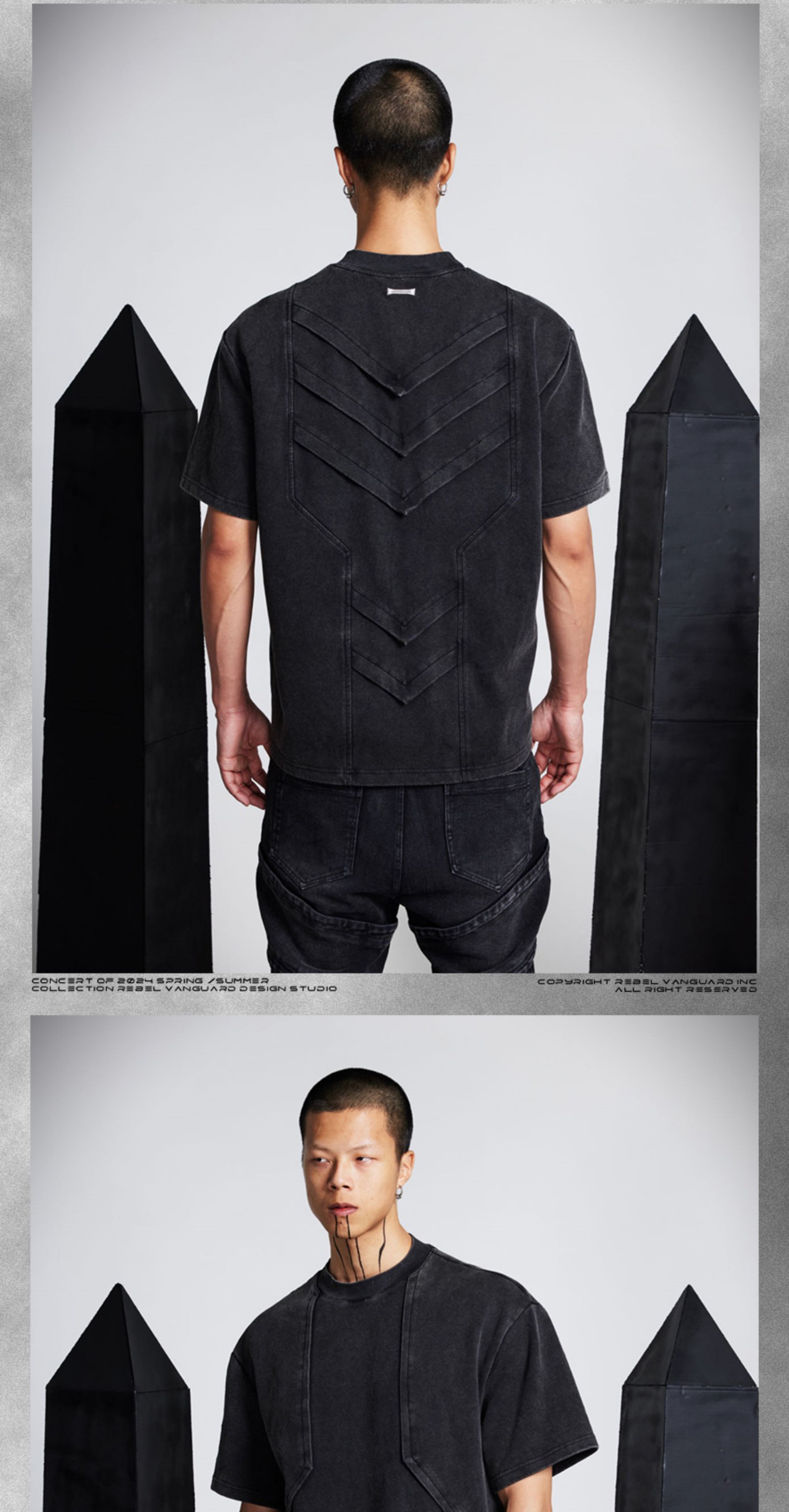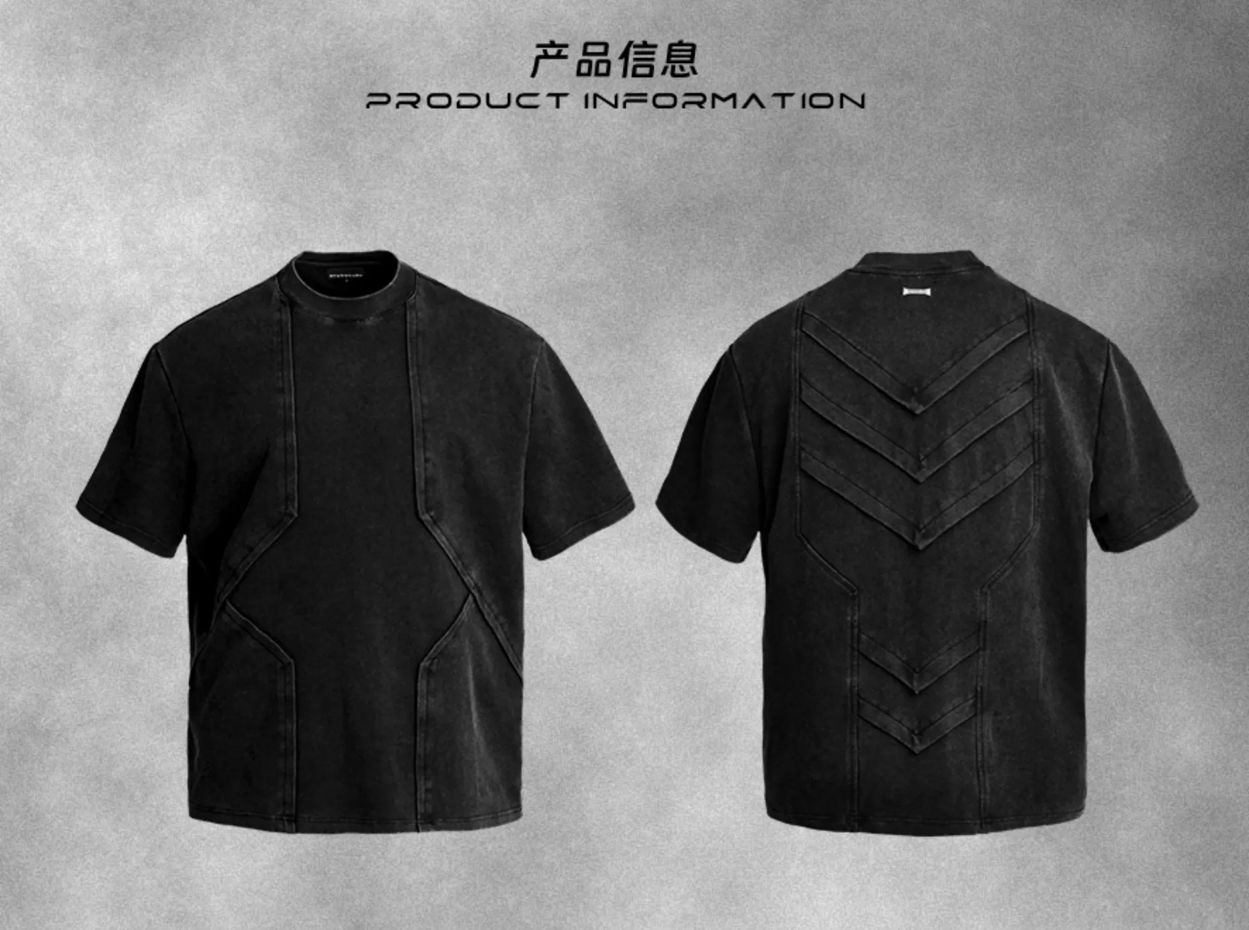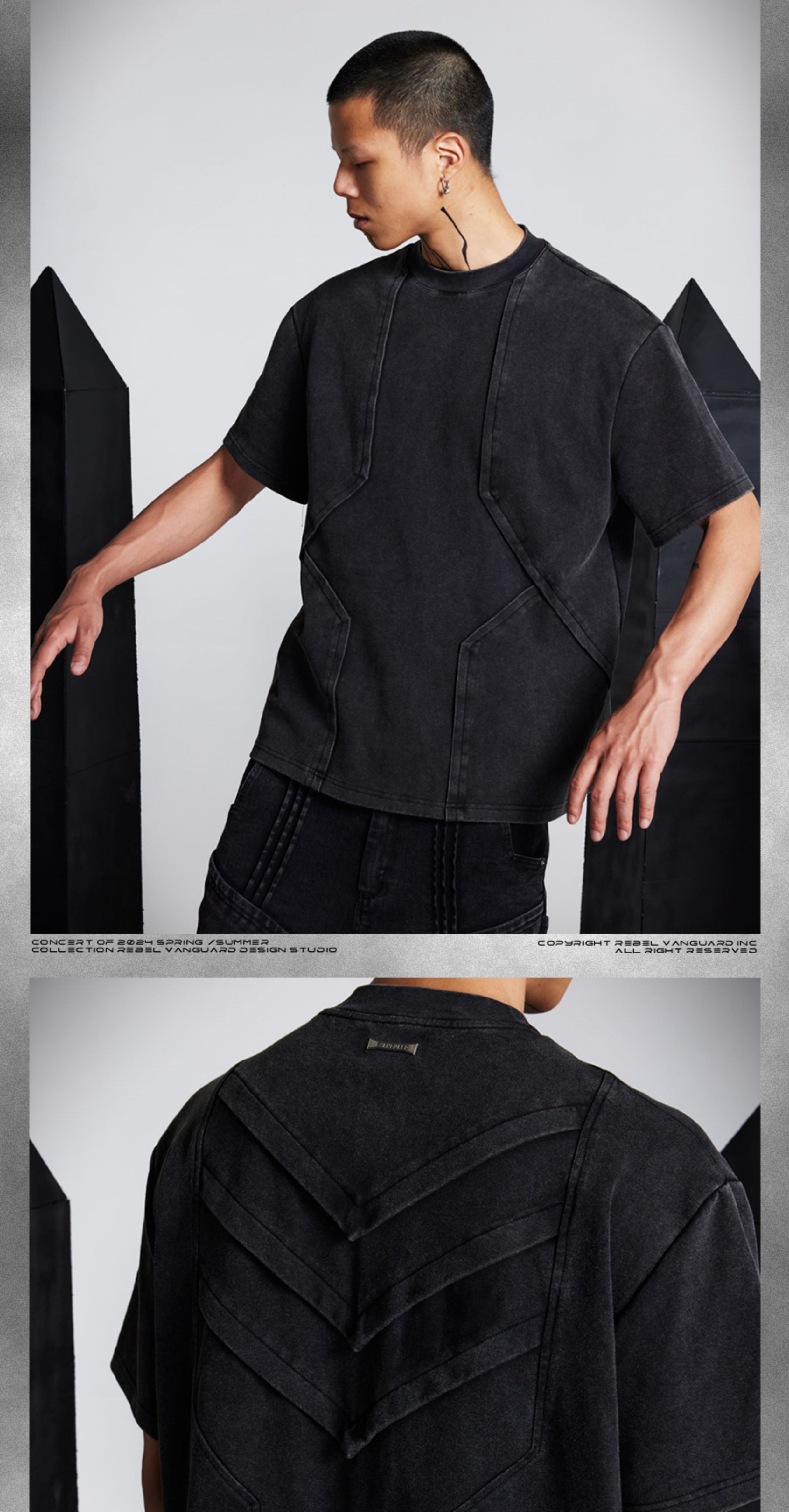 - Crafted with a washed and distressed finish, this T-shirt features front and back pleated flap panels arranged in a geometric layered structure reminiscent of armor scales. The design showcases a three-dimensional silhouette with a bold architectural aesthetic, enhanced by a custom irregular metal nameplate on the back for a refined, futuristic touch.