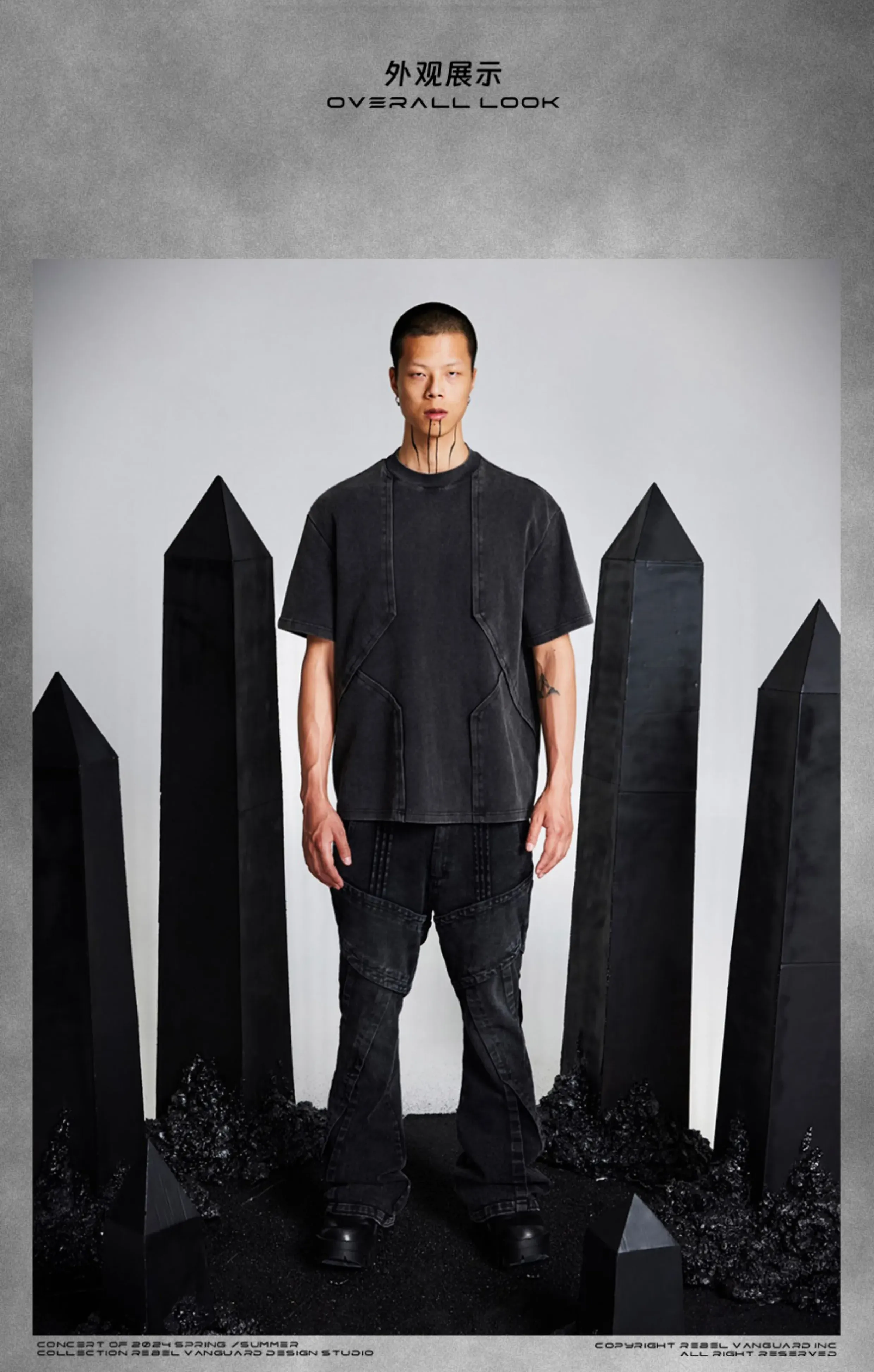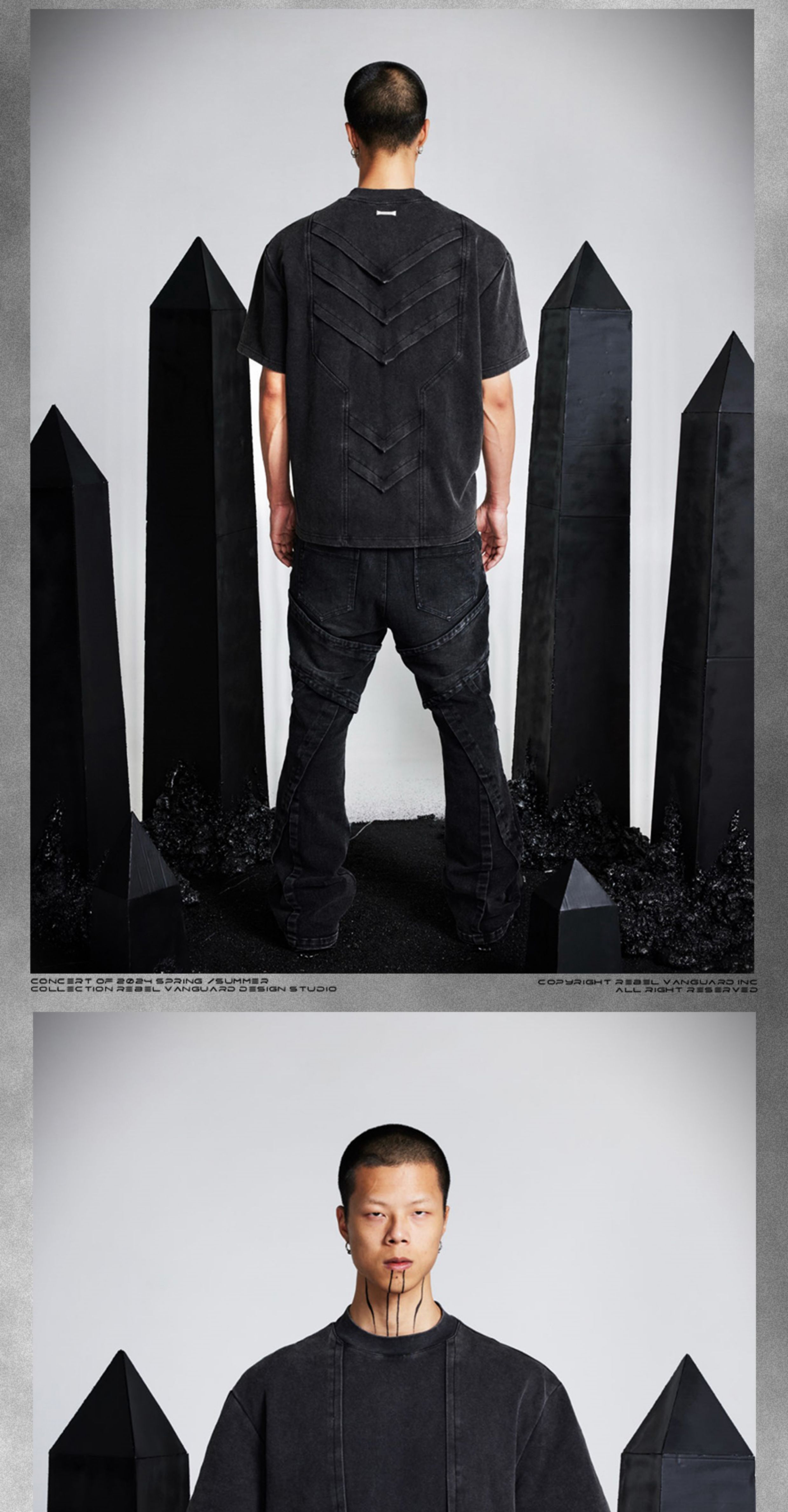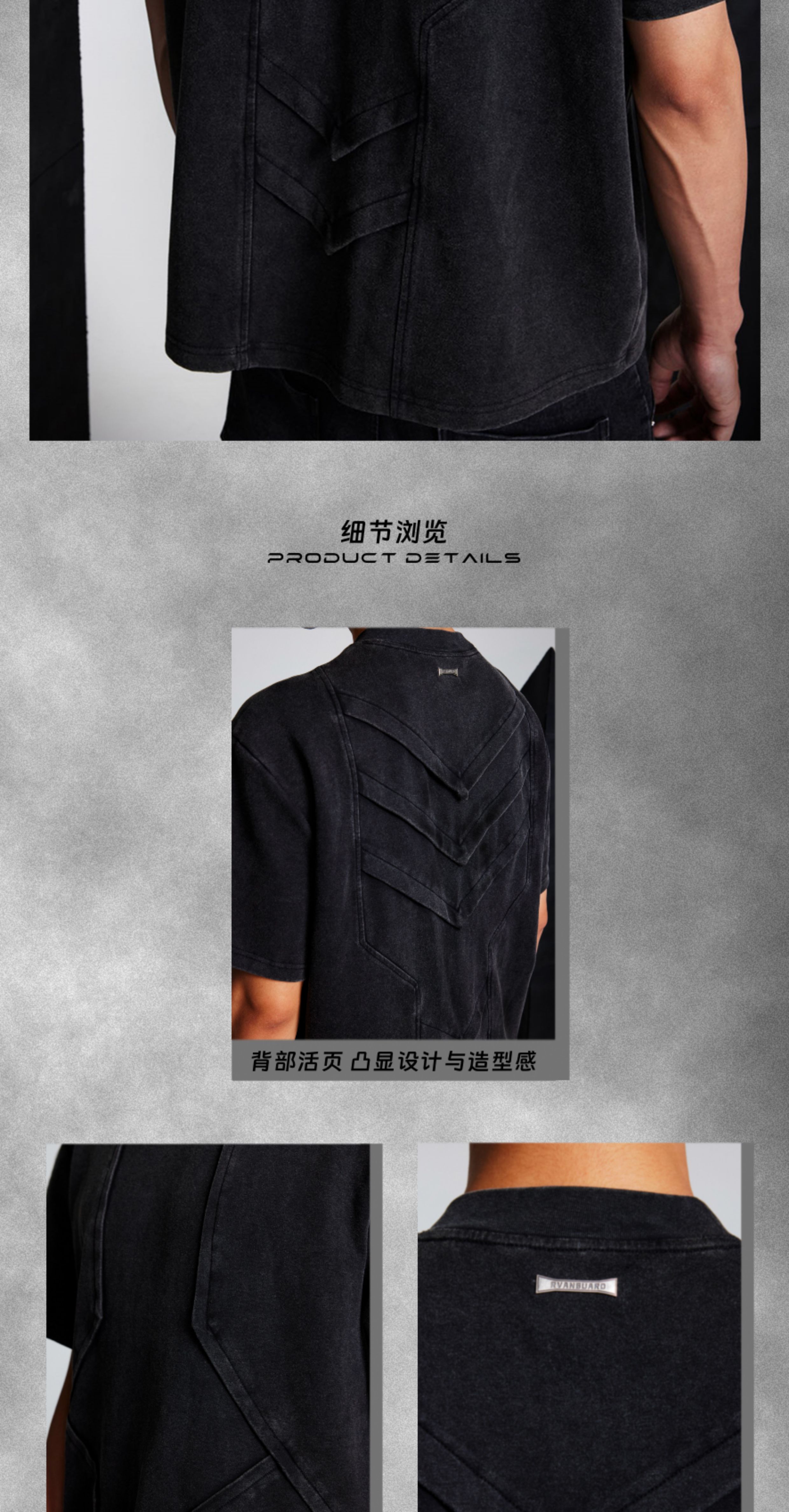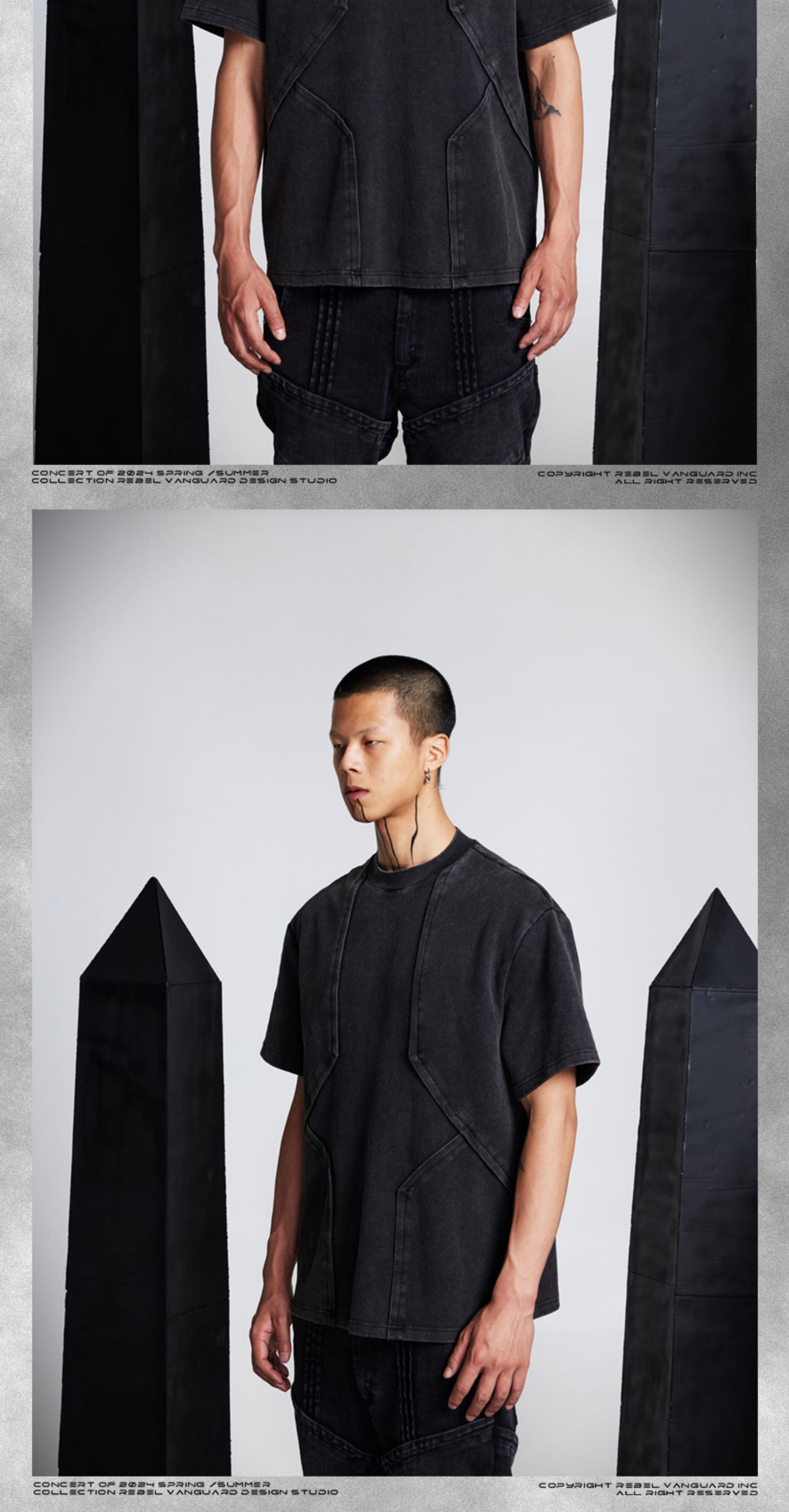 - Crafted with a washed and distressed finish, this T-shirt features front and back pleated flap panels arranged in a geometric layered structure reminiscent of armor scales. The design showcases a three-dimensional silhouette with a bold architectural aesthetic, enhanced by a custom irregular metal nameplate on the back for a refined, futuristic touch.