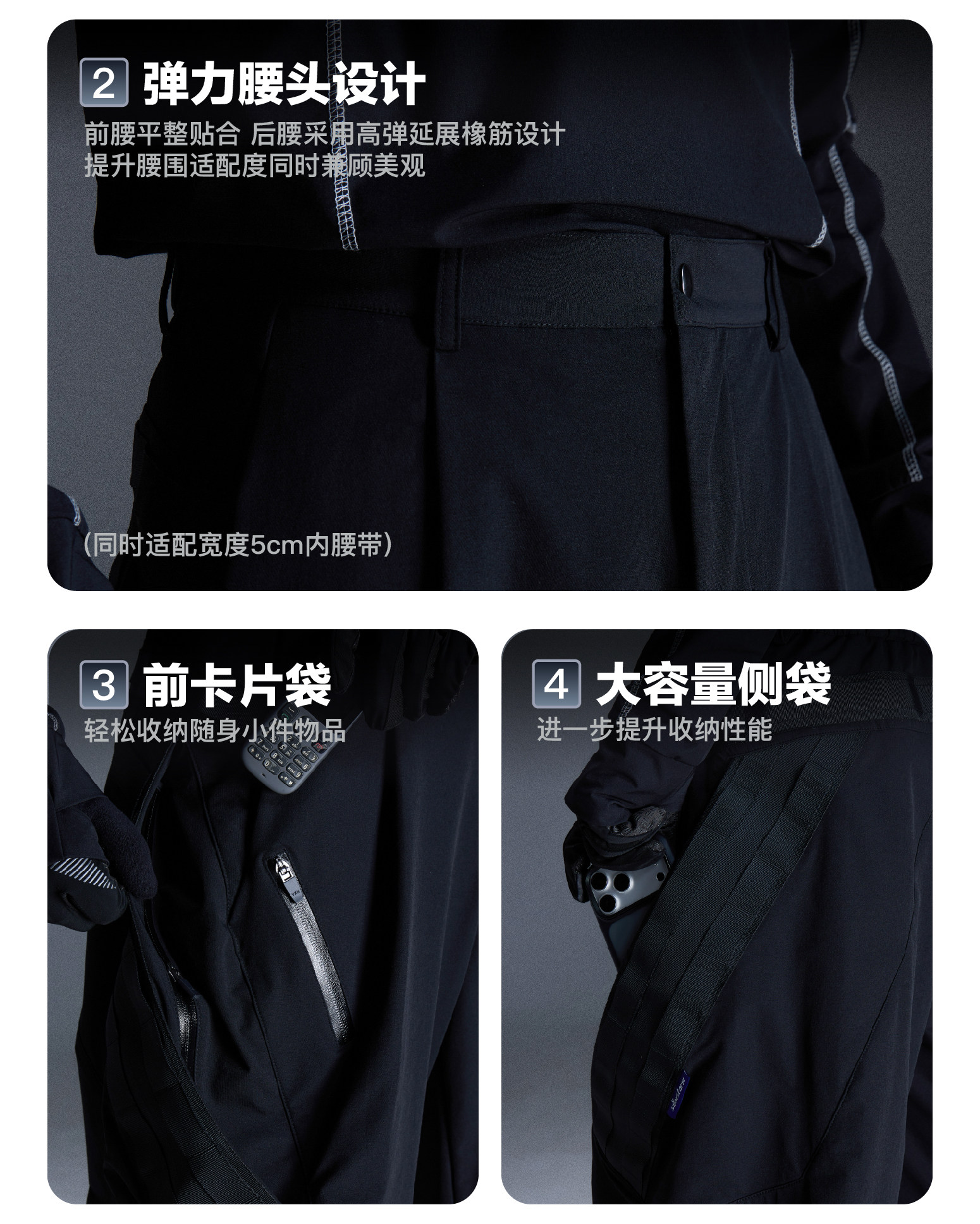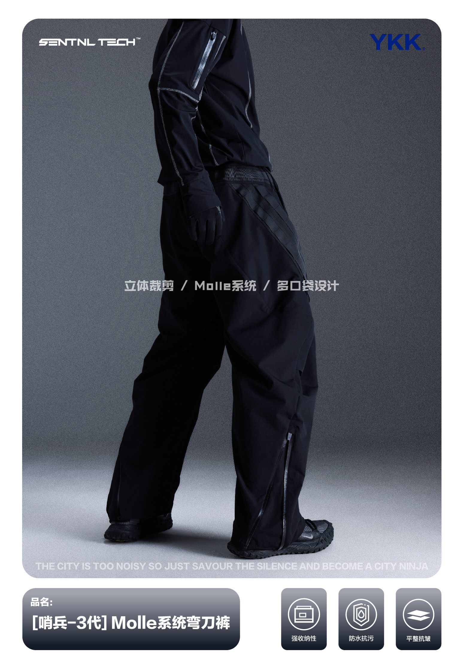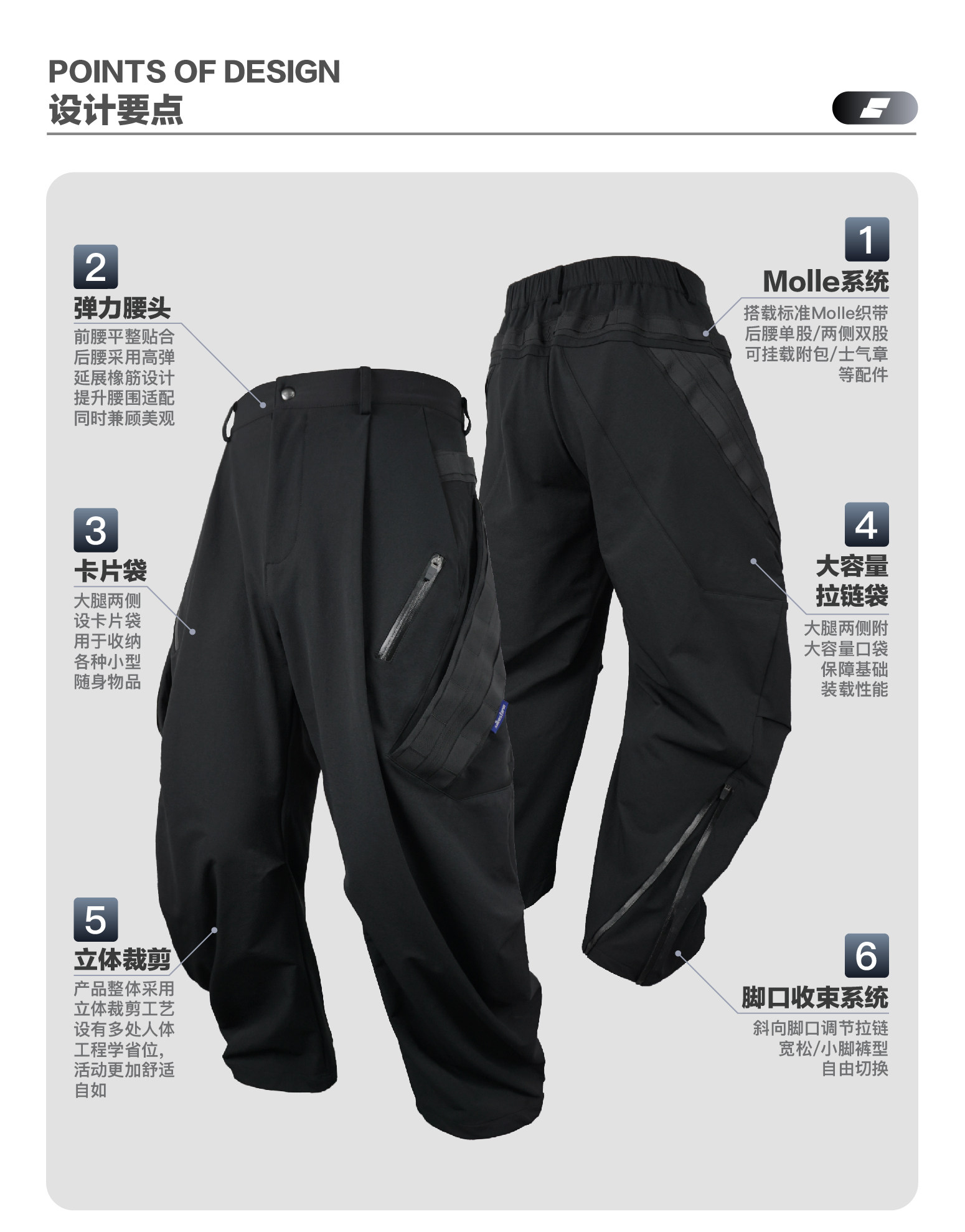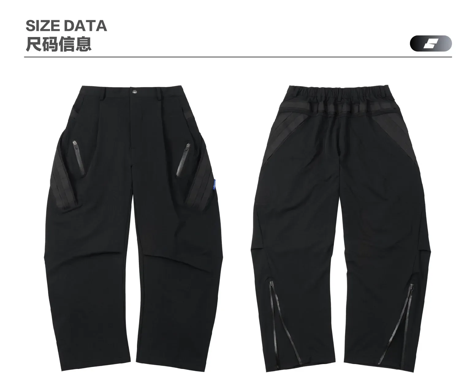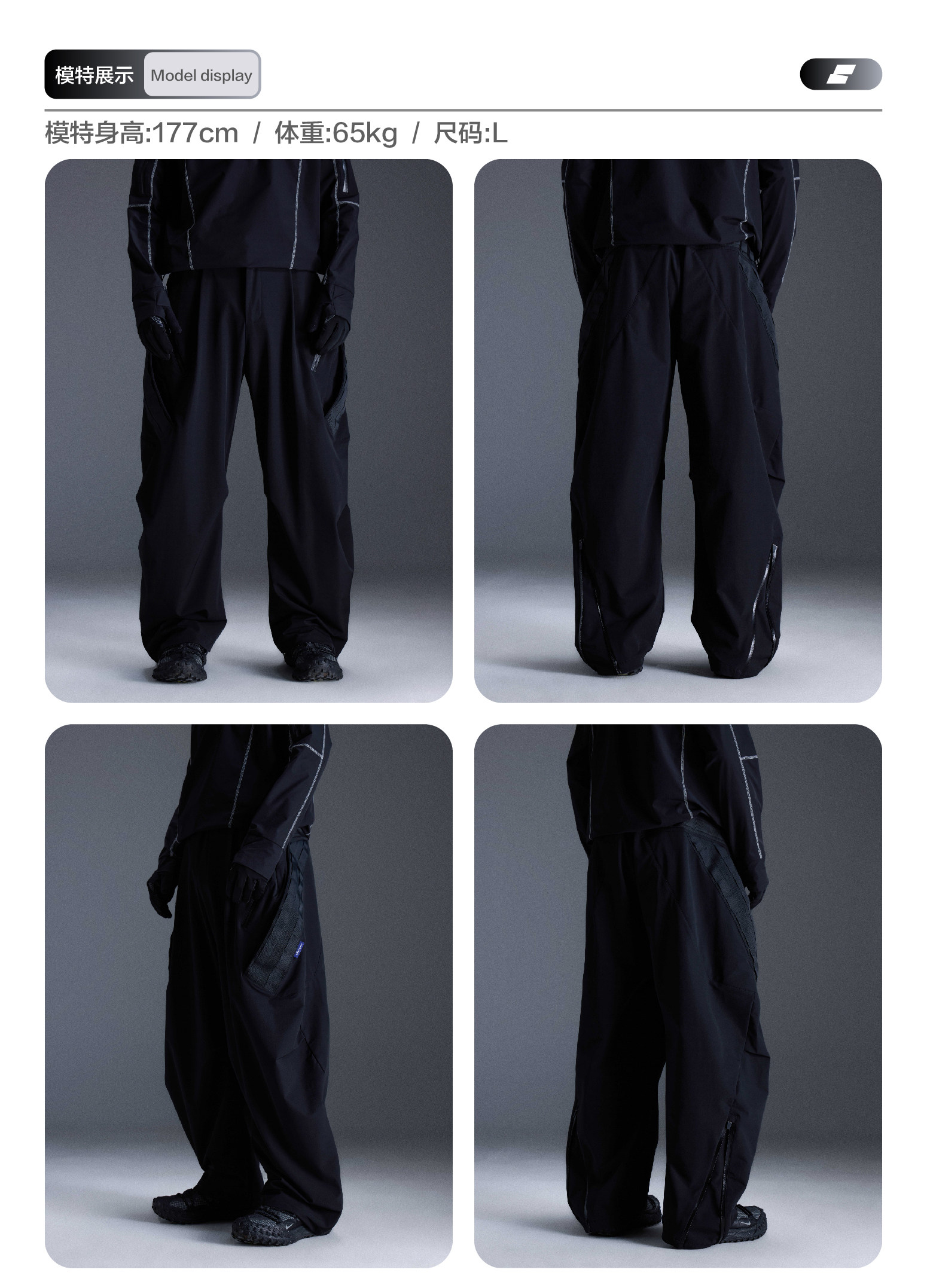 3D Tailoring: Ergonomic darts for optimized silhouette and unrestricted movement. Features vertical waterfall pleats on front, offset slanted side seams, and horizontal knee articulation pleats.