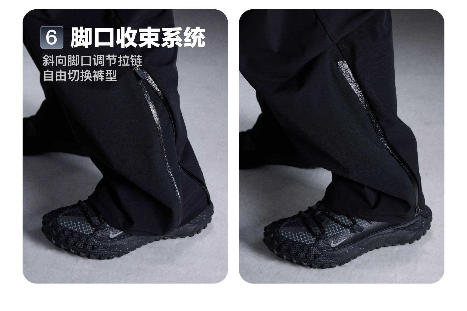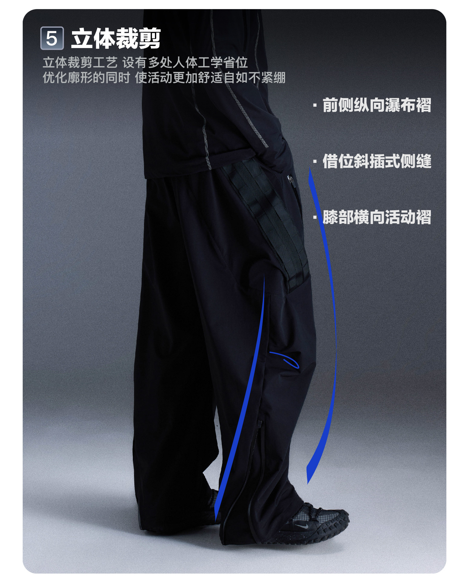 Hem Cinch System: Diagonal ankle adjustment zippers allow silhouette transformation.
