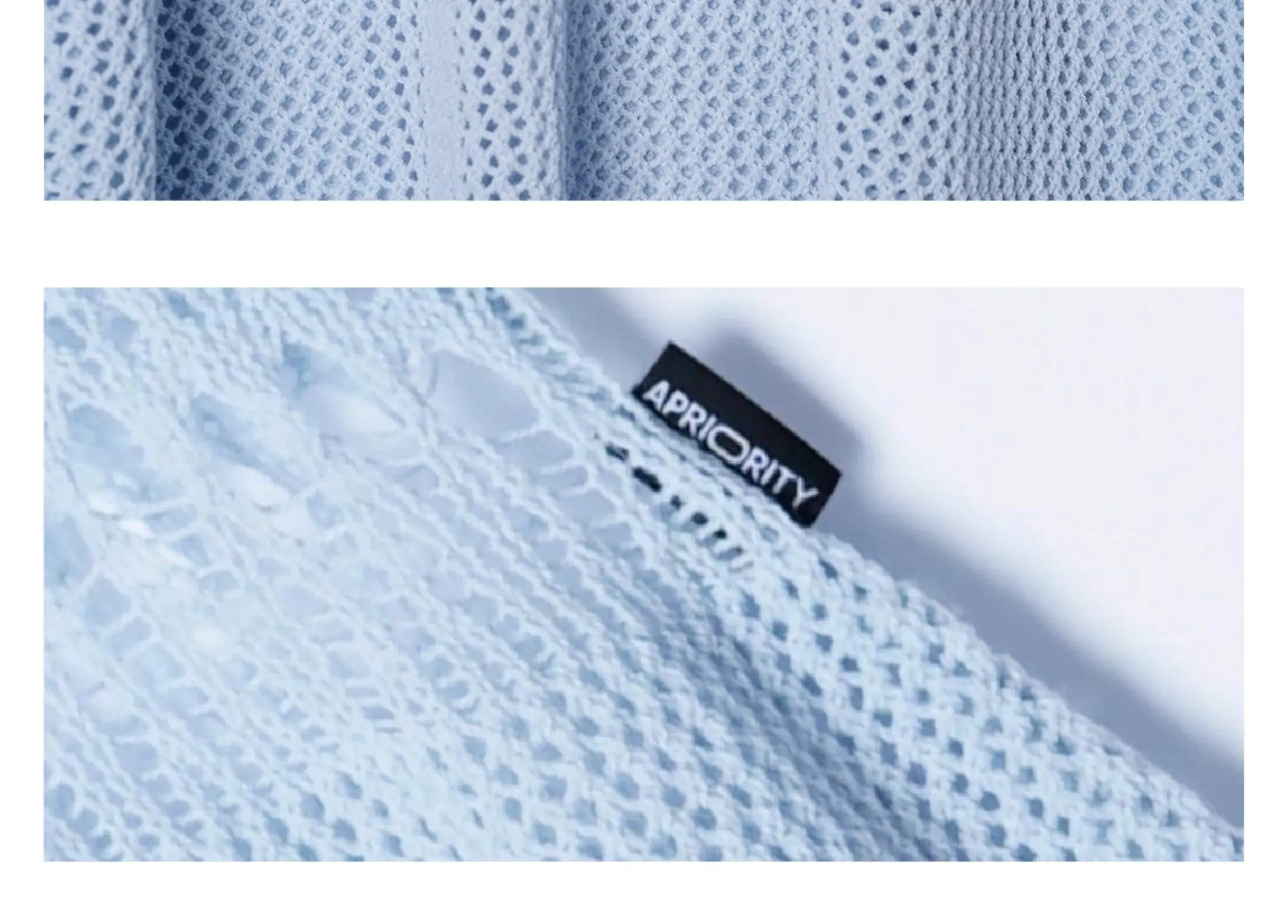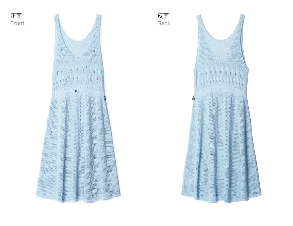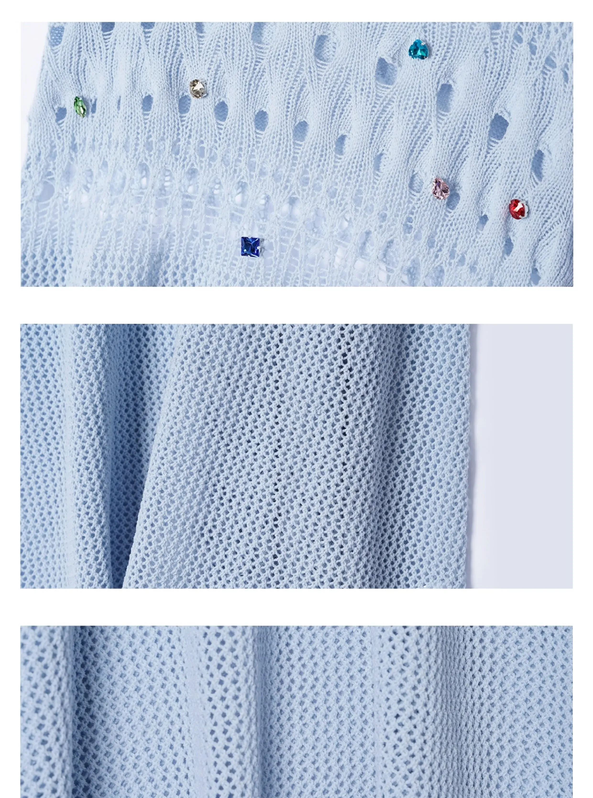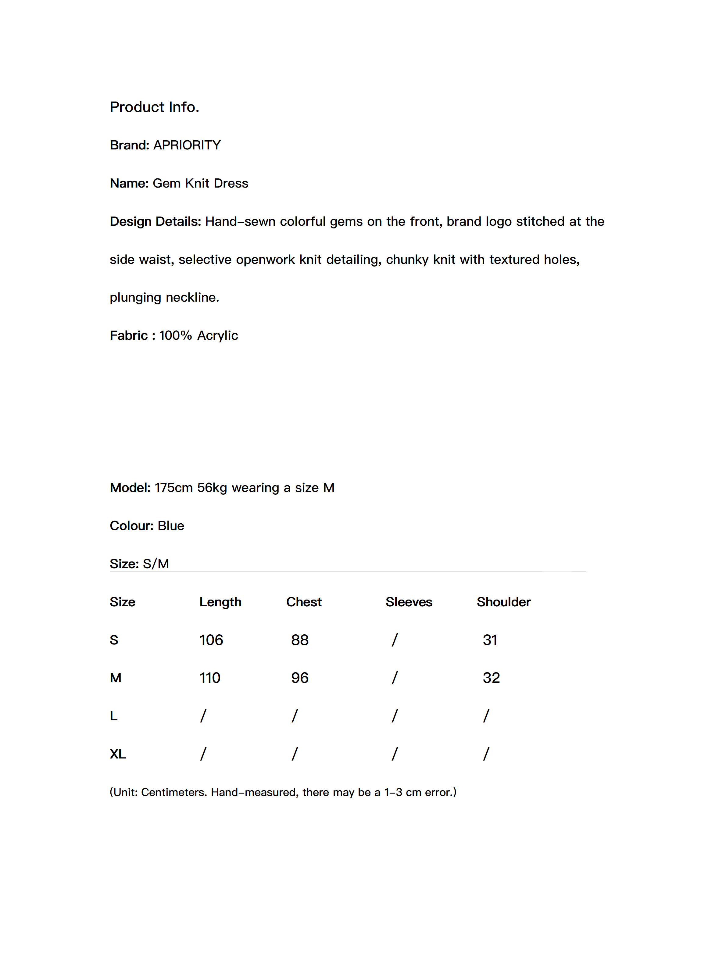 Hand-sewn colorful gems on the front, brand logo stitched at the side waist, selective openwork knit detailing, chunky knit with textured holes, plunging neckline.