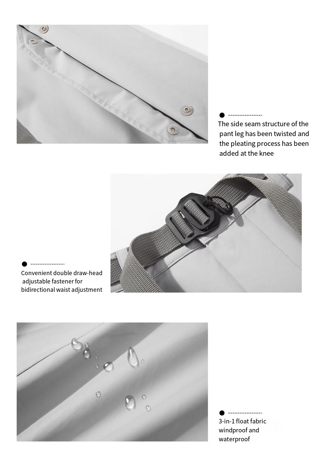 - 3-in-1 float fabric, wind proof, fabric texture is delicate and smooth, with a sense of science and technology. Convenient double pull head adjustment buckle, can adjust the waist circumference in both directions, the big leg is geometric hidden buckle cover, the side seam structure of the pant leg has been twisted, and the pleating process is added at the knee, so that the overall three-dimensional of the pant leg has a structure.