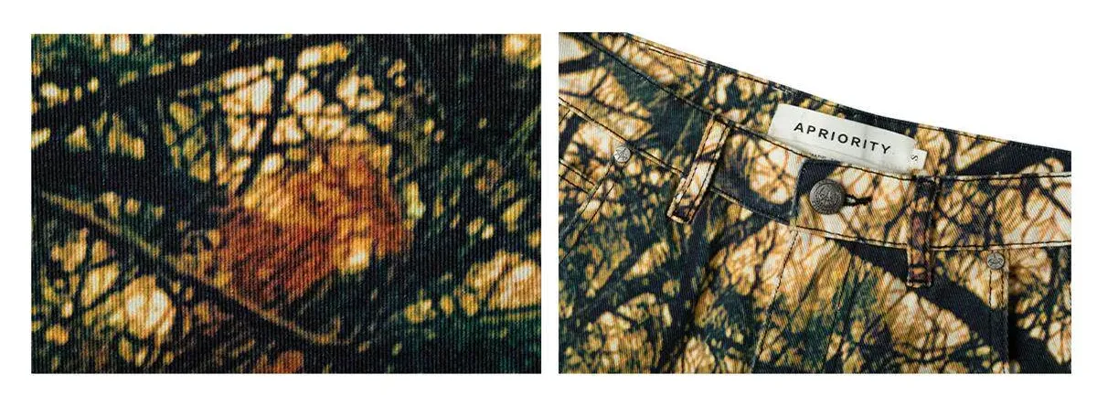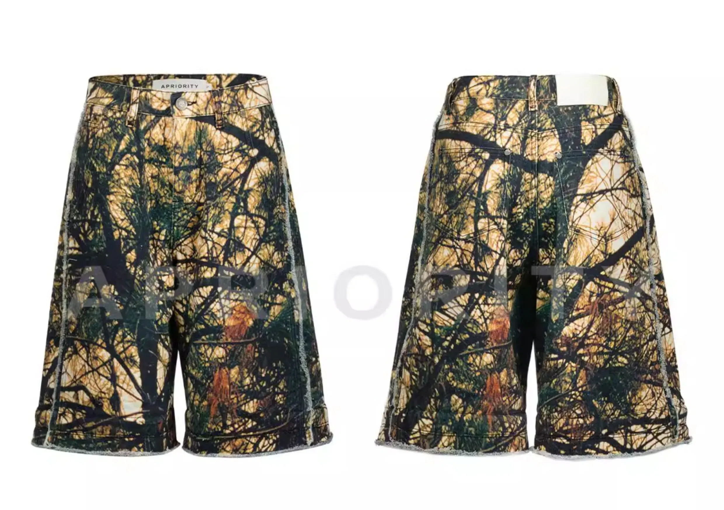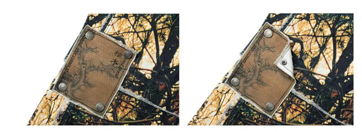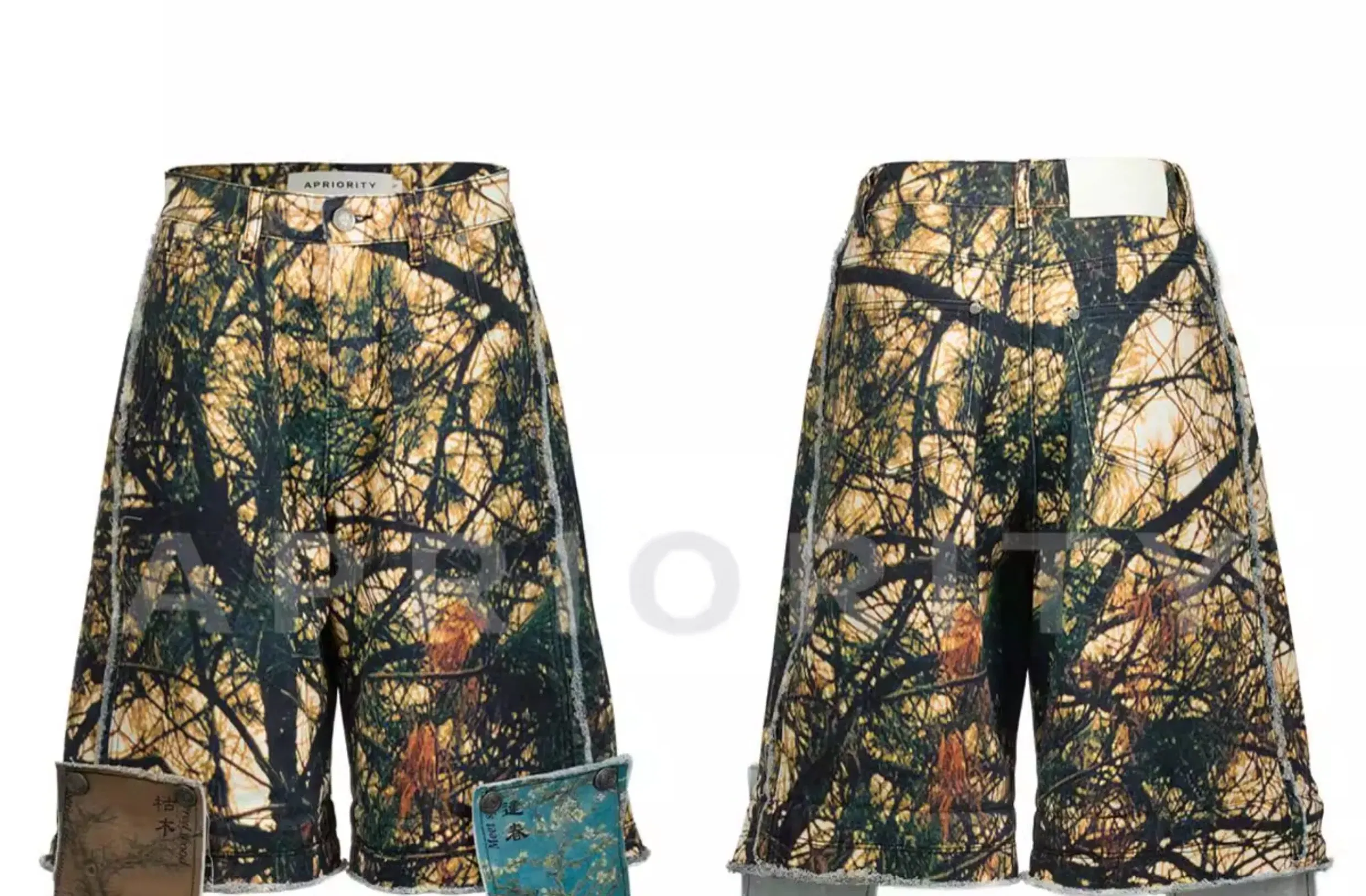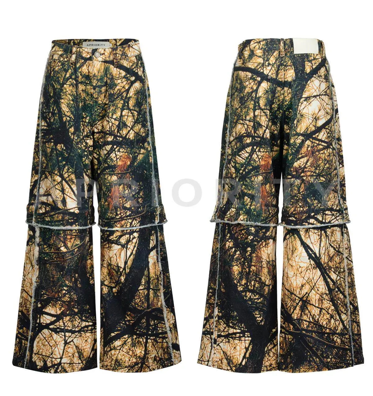 Design Details: Original photographic tree print; custom metal buttons at waist. Oil painting/Chinese painting print with frayed detachable patch; brushed structural seam lines throughout. Total of 9 custom metal buttons; 8 YKK hidden buttons; YKK fly zipper. Detachable two-way design can be unzipped into shorts. Custom genuine leather patch sewn at back waist. Full-body digital print with registered placement. Custom metal rivets hand-hammered for reinforcement.