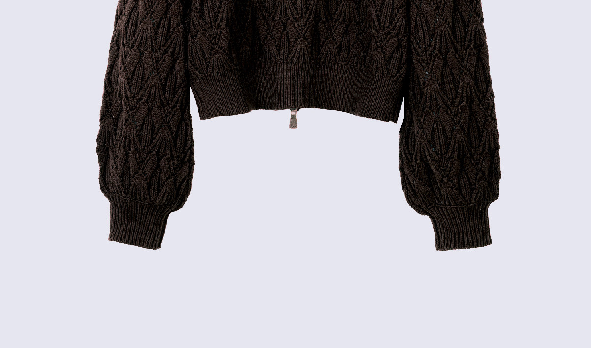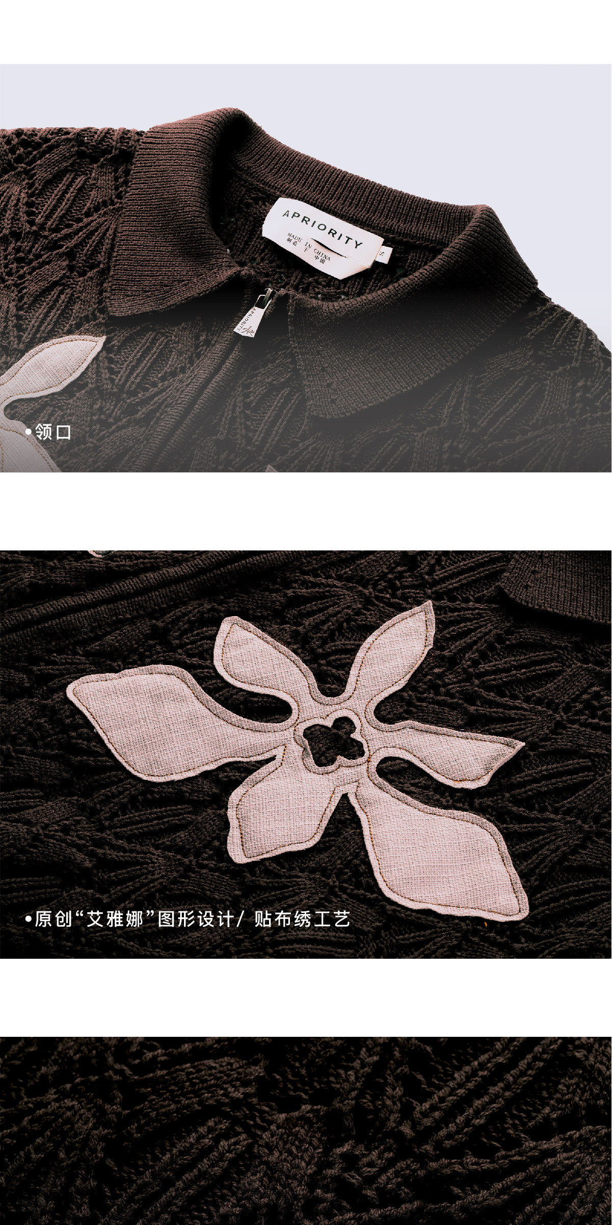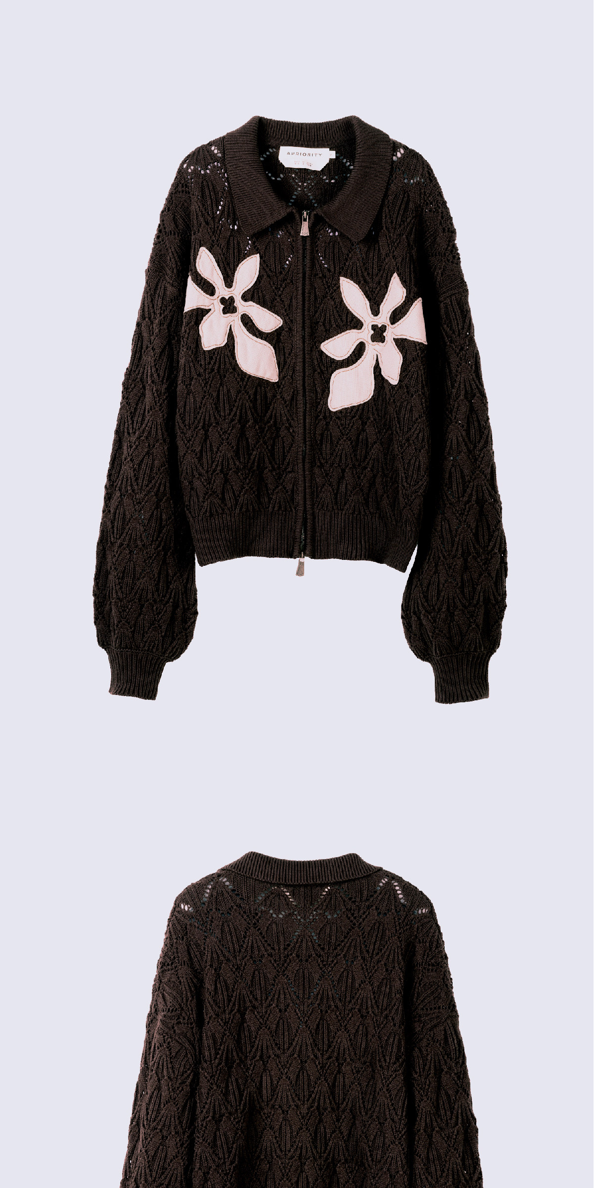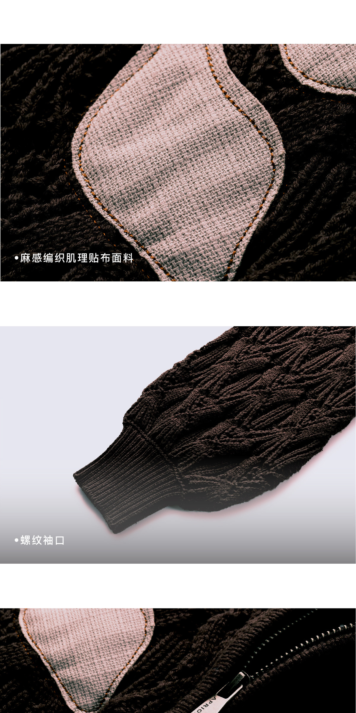 Design Details: Crafted from acrylic-cotton blend yarn with openwork knit pattern. Features original "Aiyana" graphic design using hemp-texture woven appliqué fabric with appliqué embroidery technique, and custom metal zipper pull.