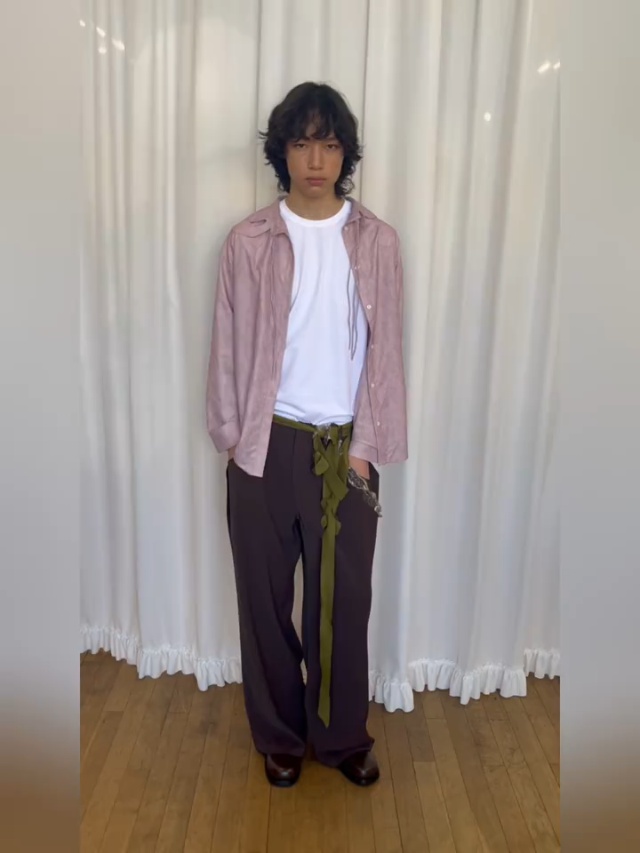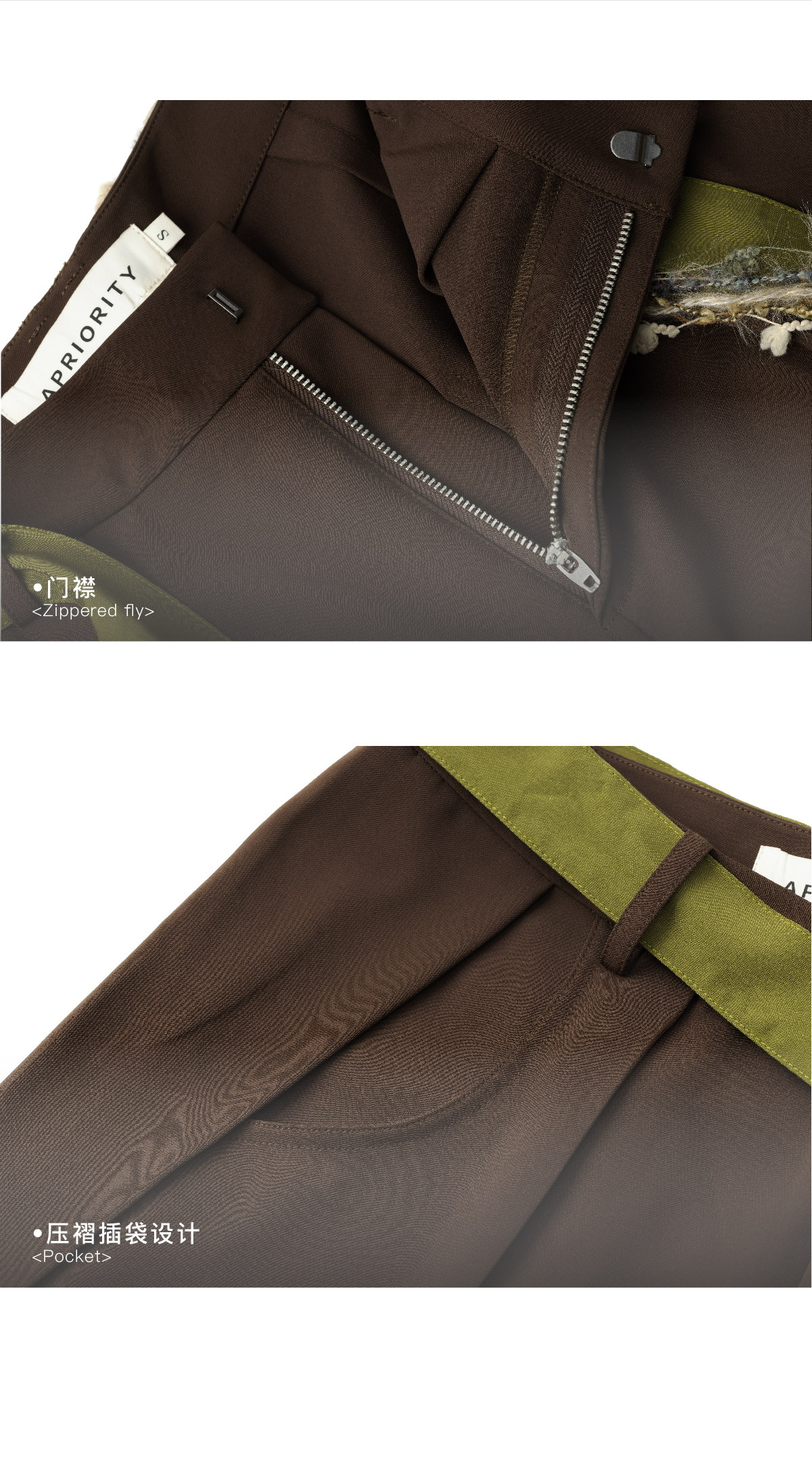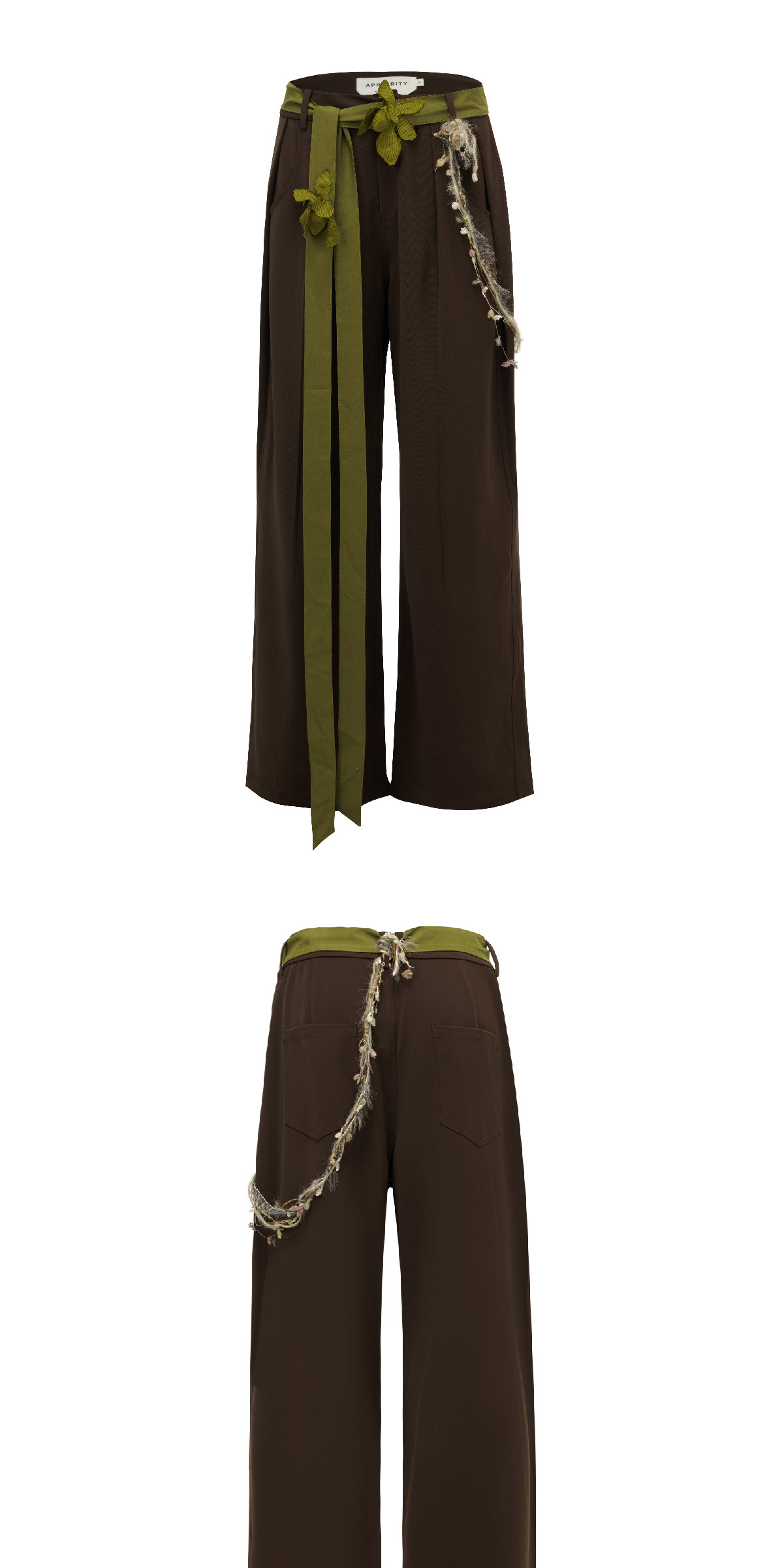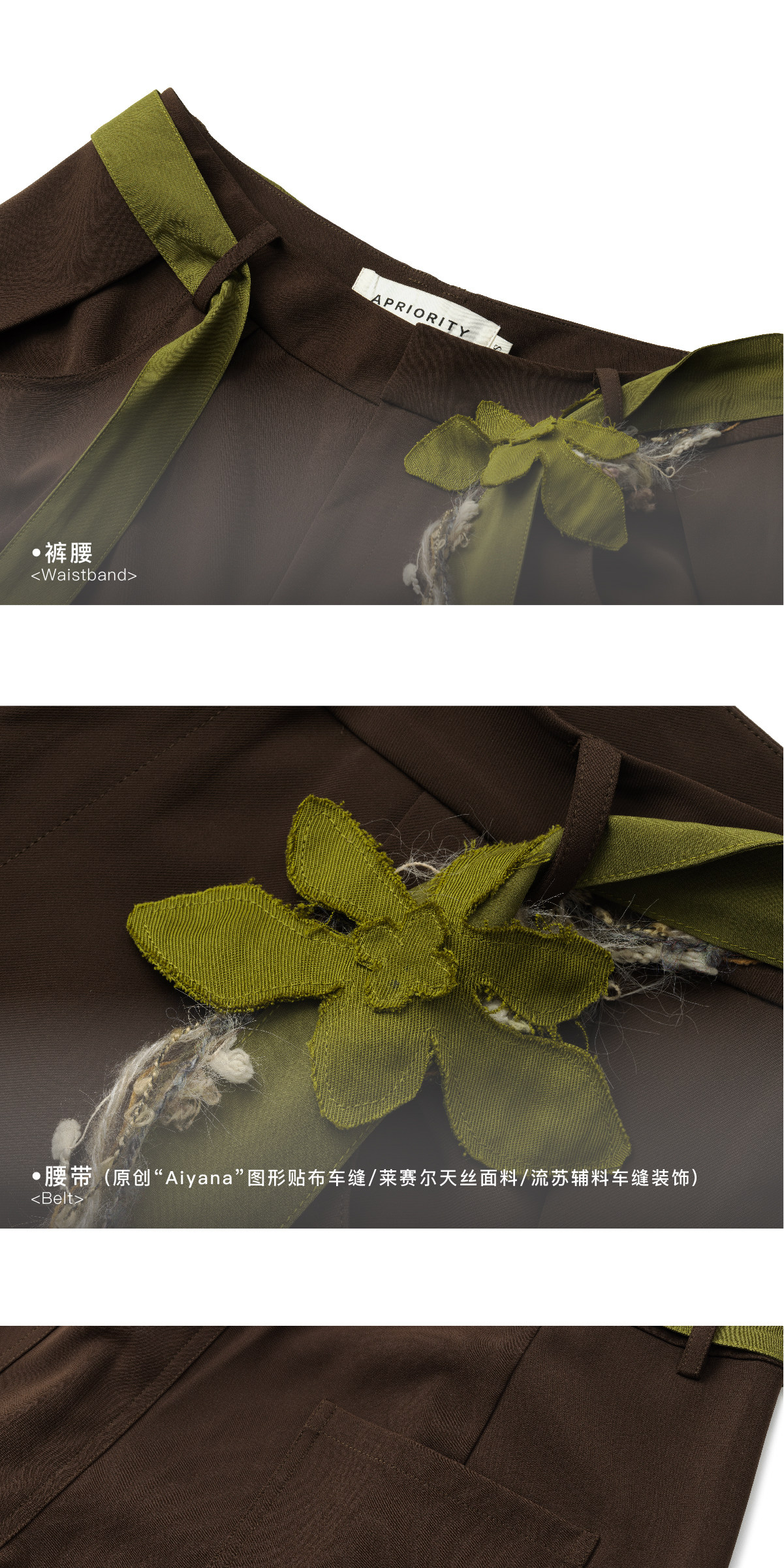Design Details: Original graphic patch sewn onto Tencel lyocell fabric waistband design; pleated cut design. Fringe trim sewn on as decorative detail; Morgans silk-like draping fabric.