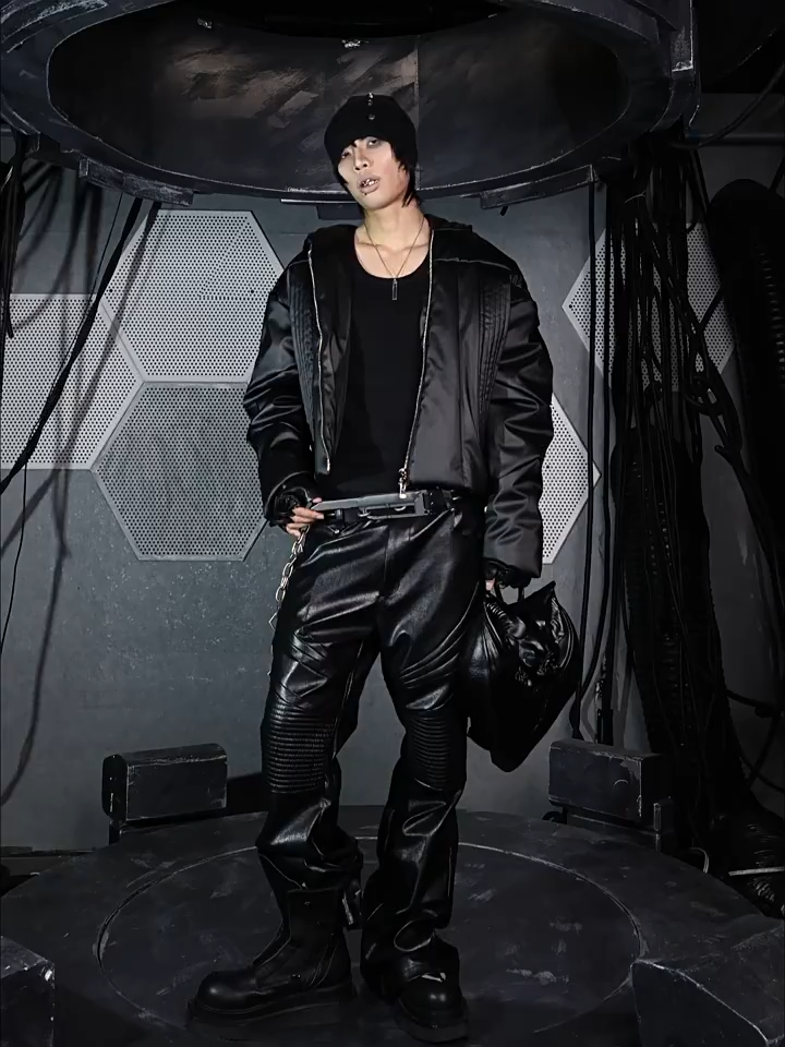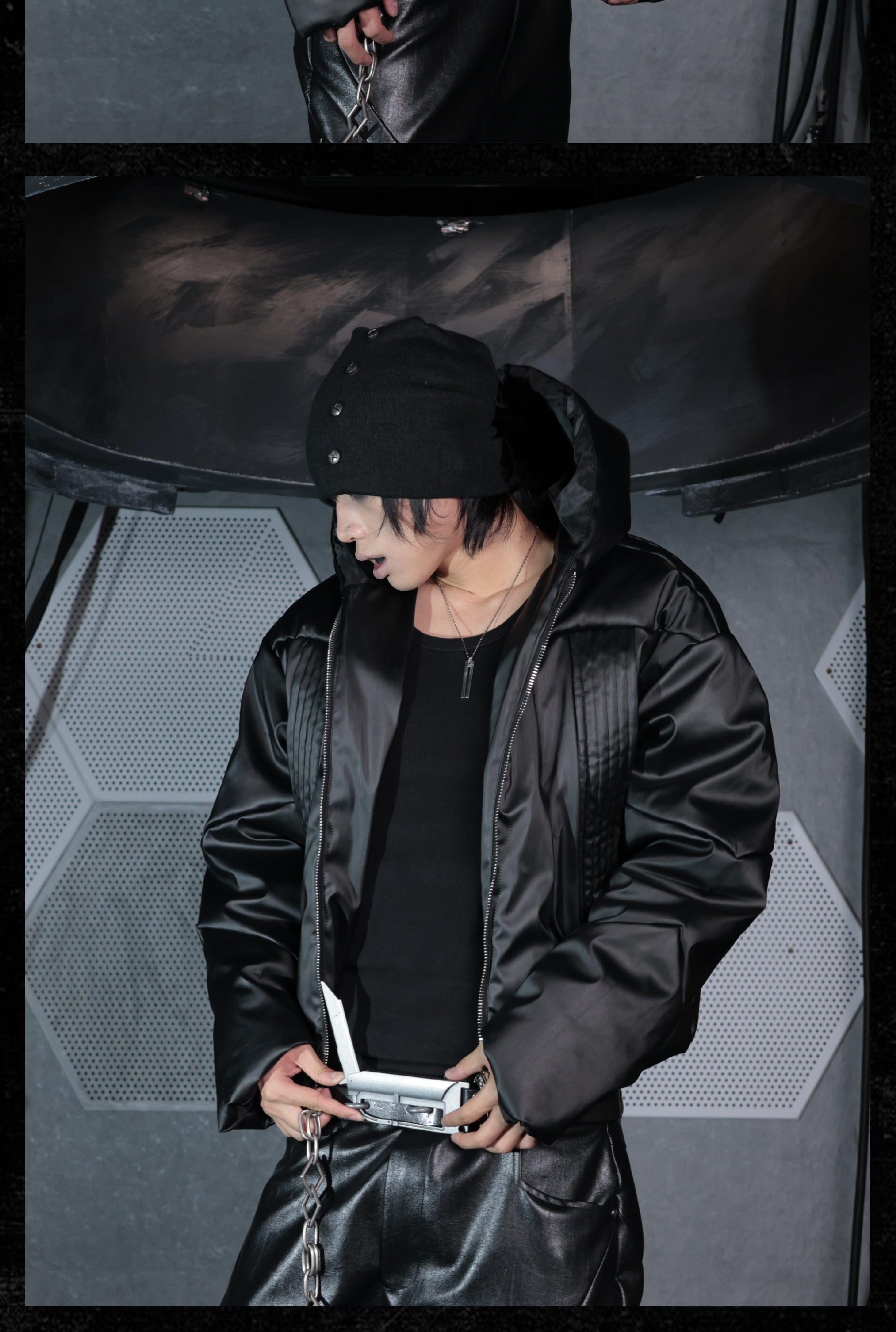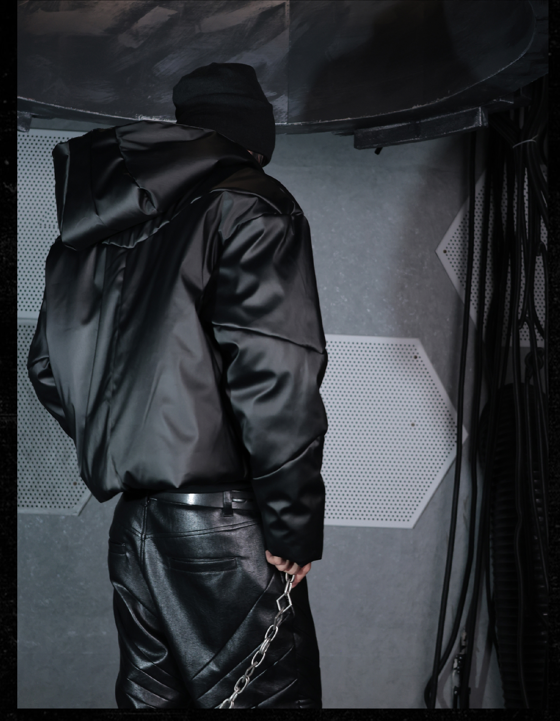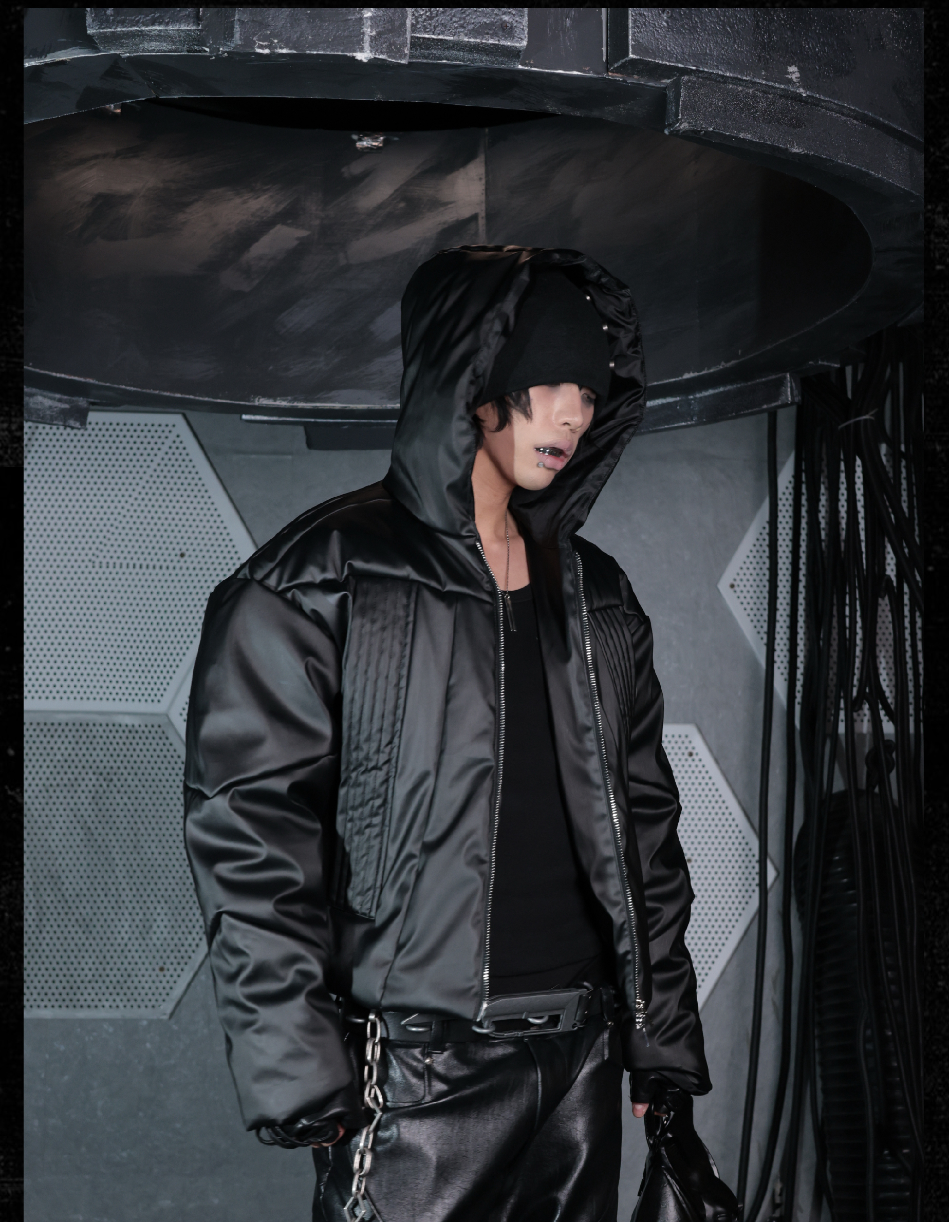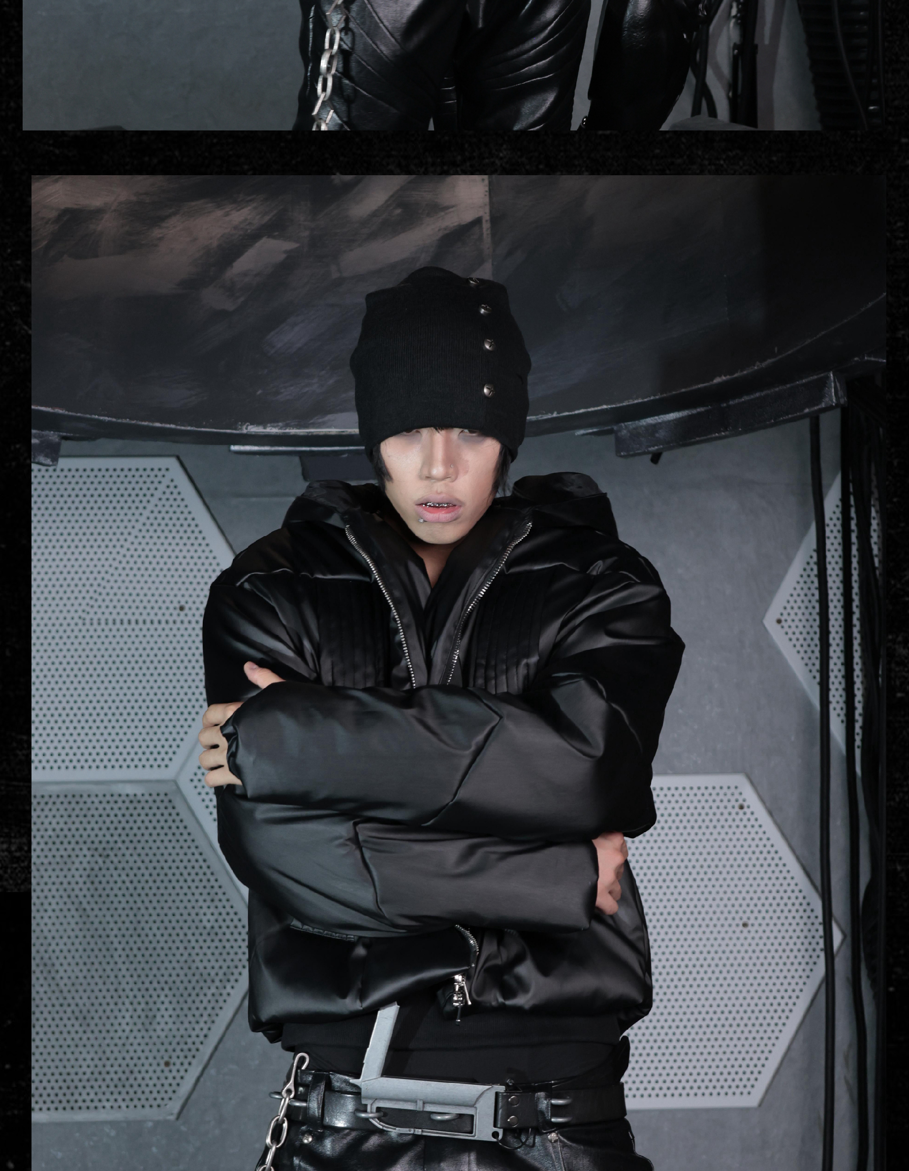 - This hooded puffer features a metallic brushed surface, presenting a futuristic armor-like texture with distinctive sculptural lines. The protective armor silhouette is complemented by concealed inner pockets, merging function with avant-garde form. Unique panel construction and a three-dimensional cut amplify its futuristic and bold aesthetic, embodying a modern sense of power and protection.