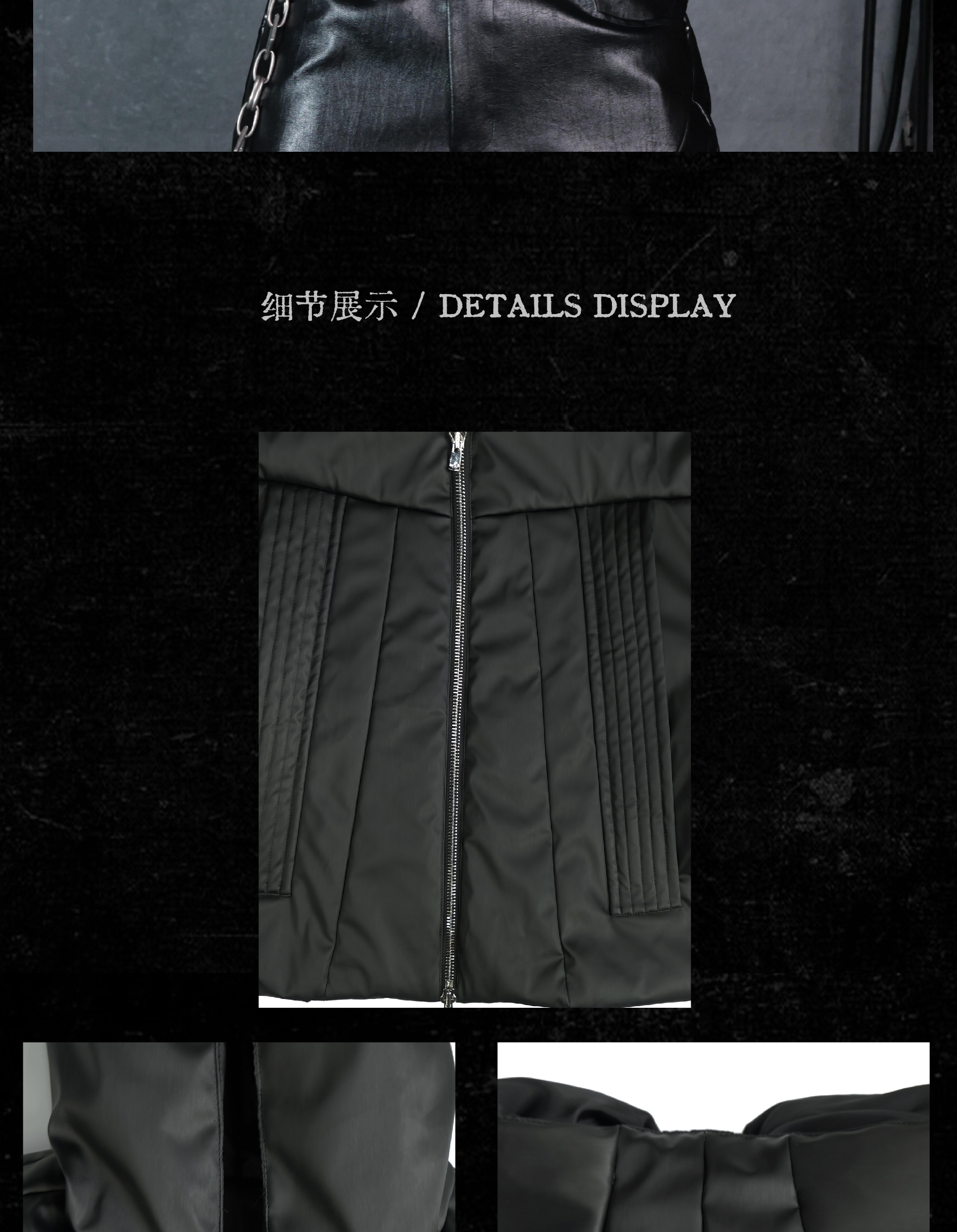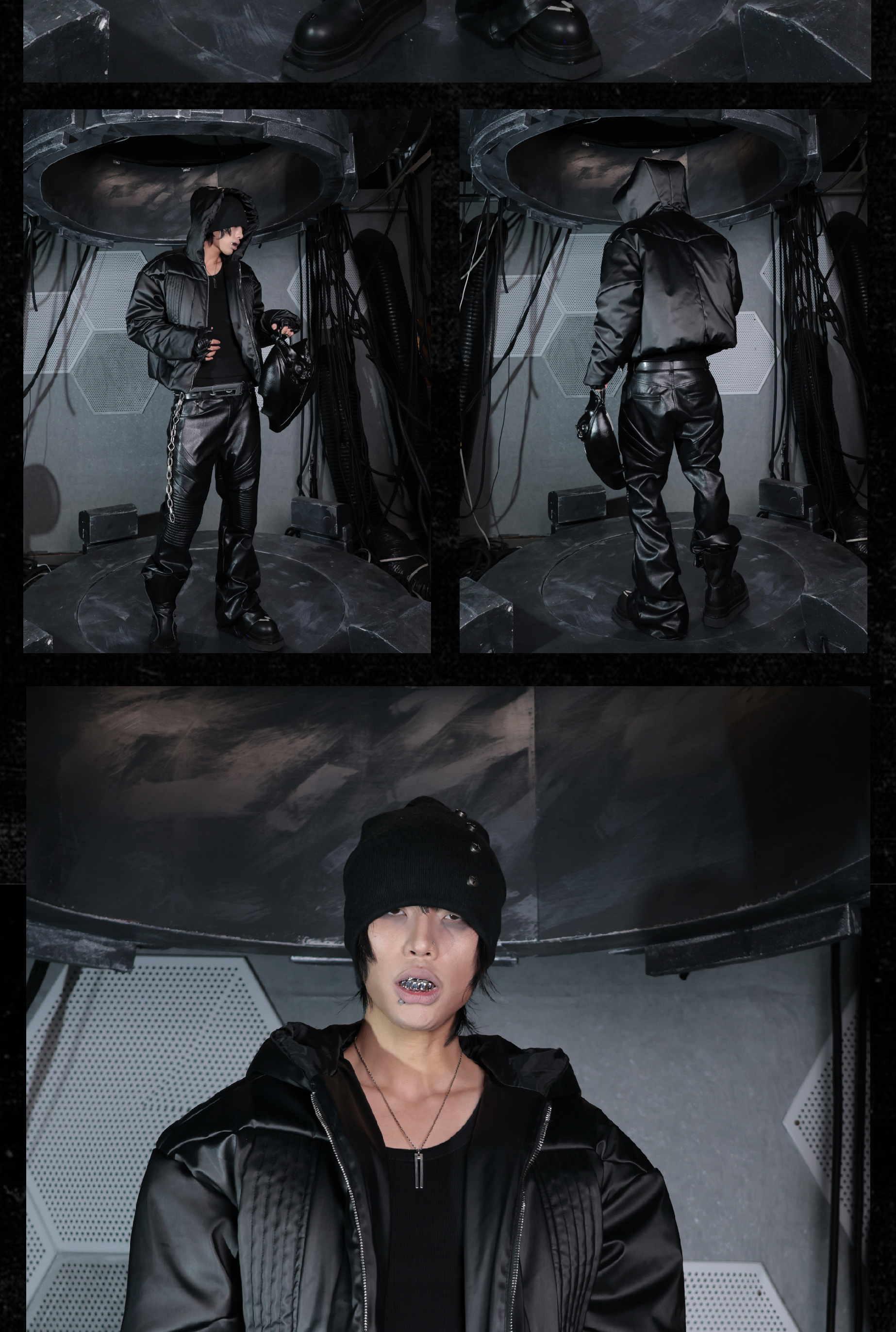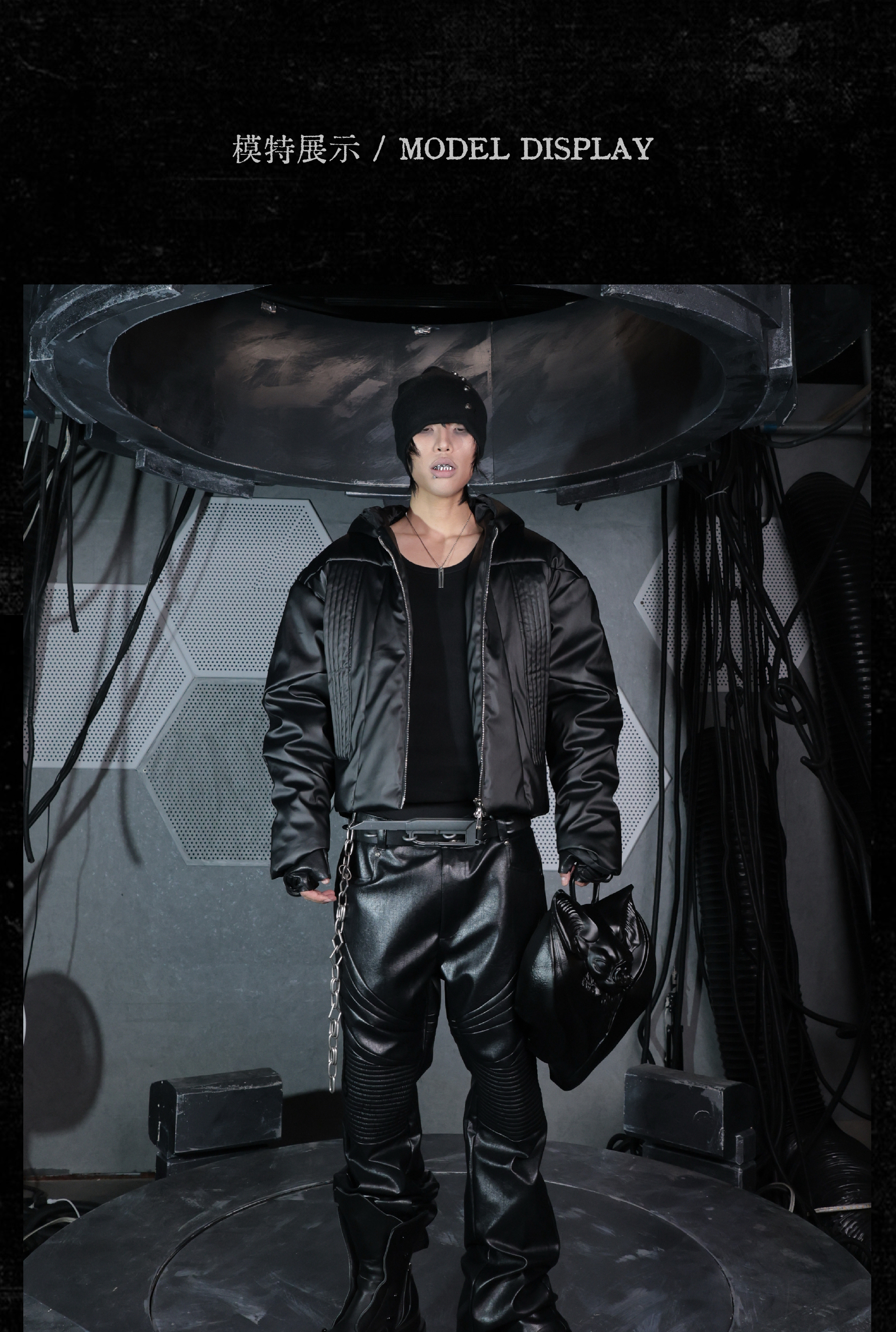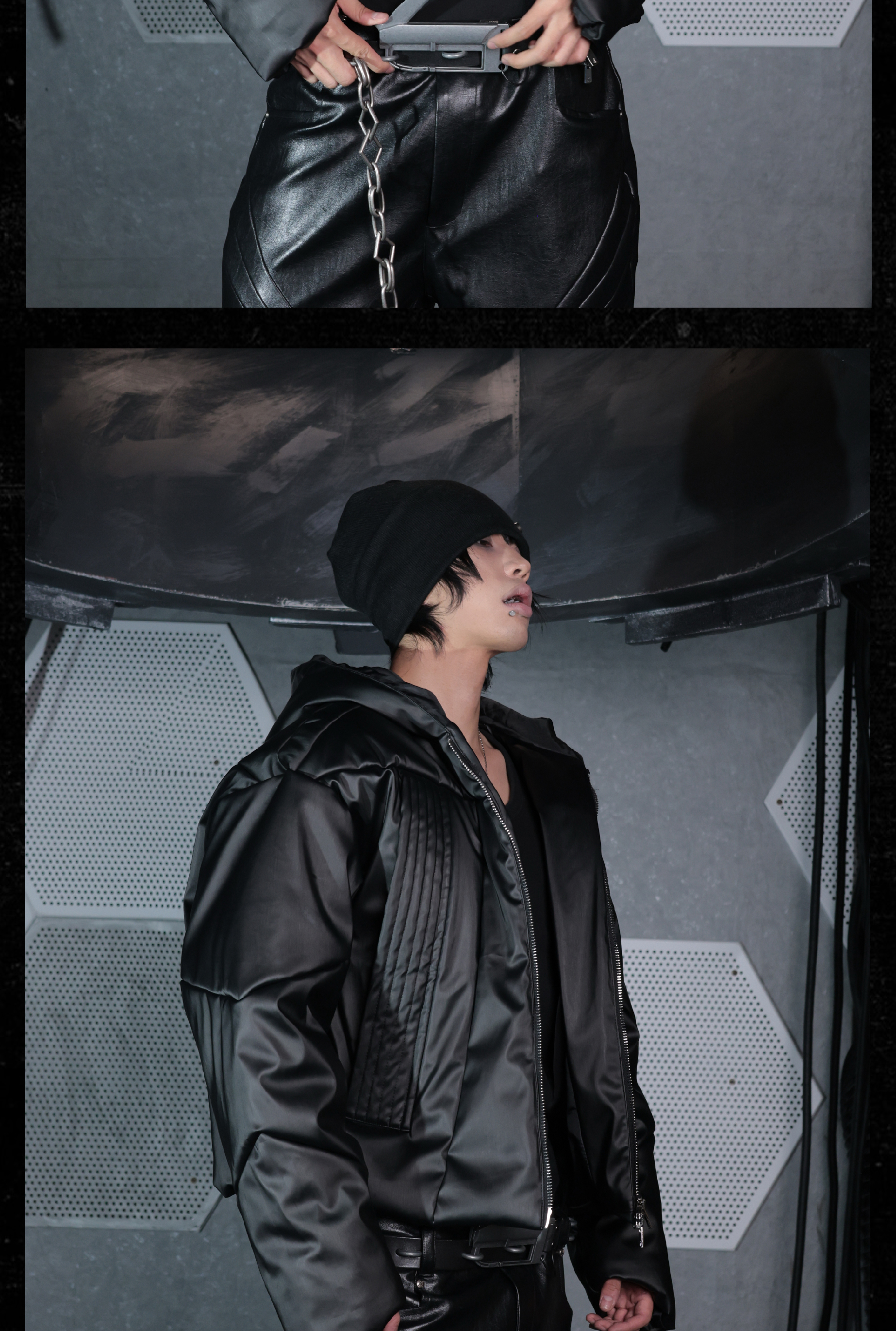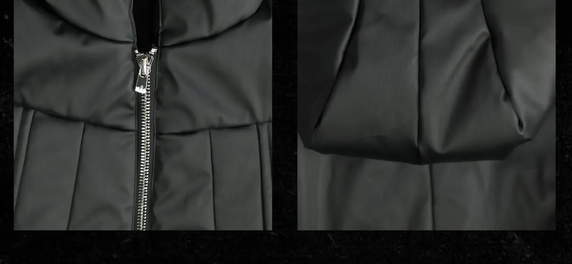 - This hooded puffer features a metallic brushed surface, presenting a futuristic armor-like texture with distinctive sculptural lines. The protective armor silhouette is complemented by concealed inner pockets, merging function with avant-garde form. Unique panel construction and a three-dimensional cut amplify its futuristic and bold aesthetic, embodying a modern sense of power and protection.
