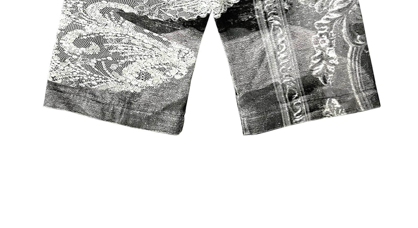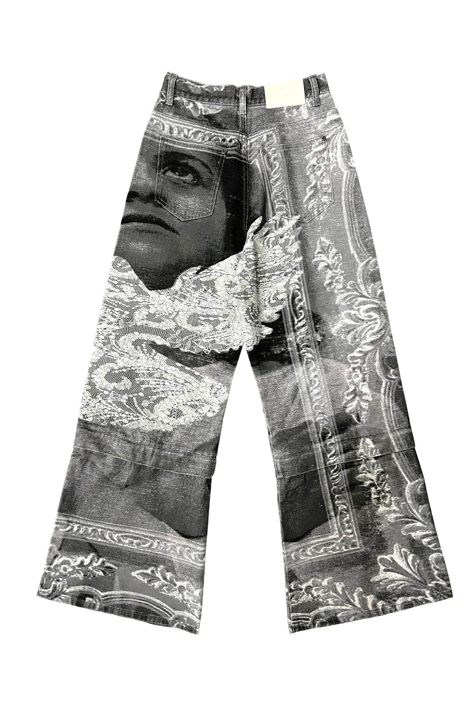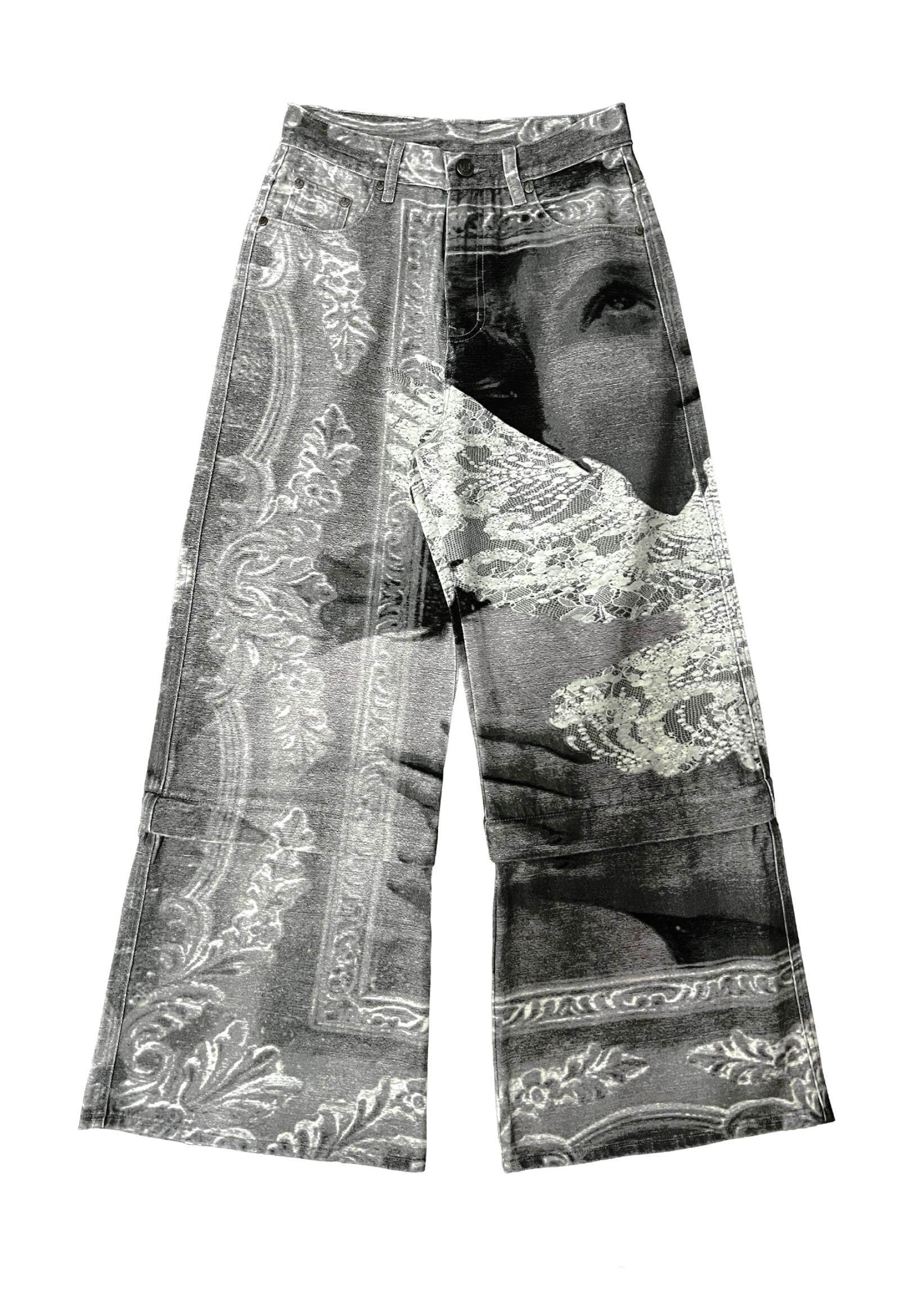Design Details: Full-body digital direct-to-garment print; graphic print design. Detachable two-way design can be unzipped into shorts. Back patch pockets; pocket corners reinforced with custom metal rivets. Custom genuine leather patch sewn at back waist. Pure cotton denim fabric. Print placement registered; custom metal buttons at waistband; custom metal zipper pull.
