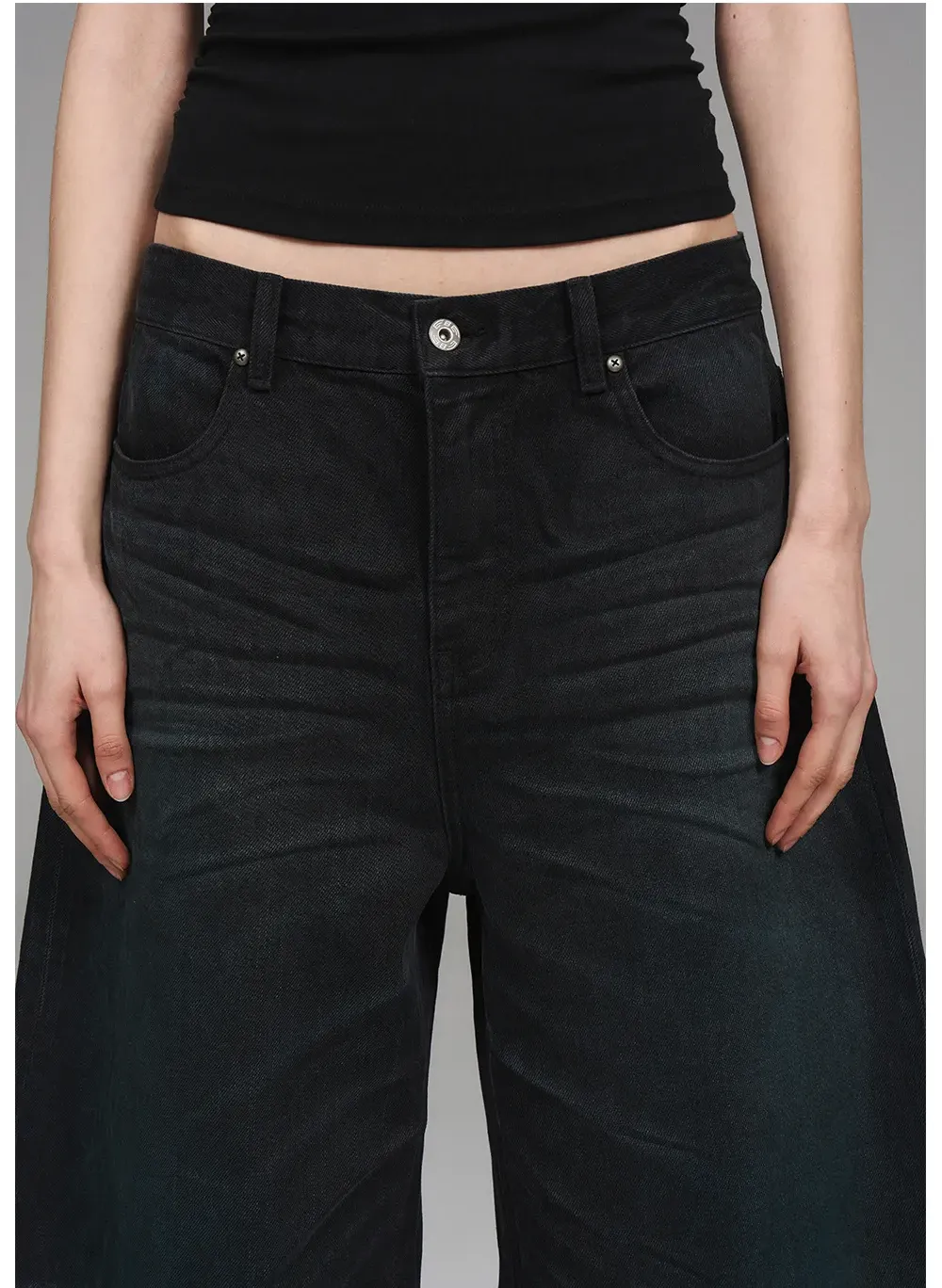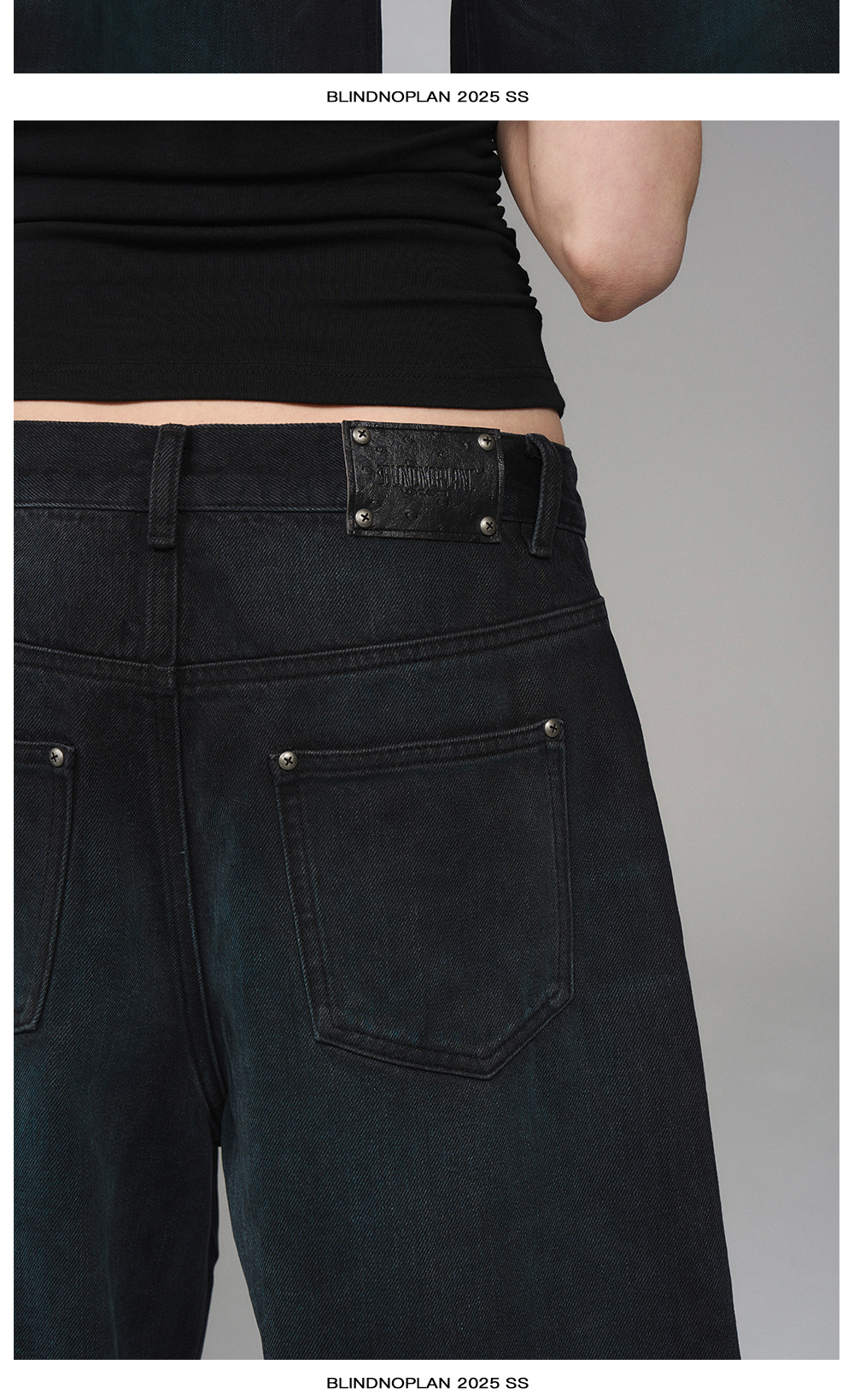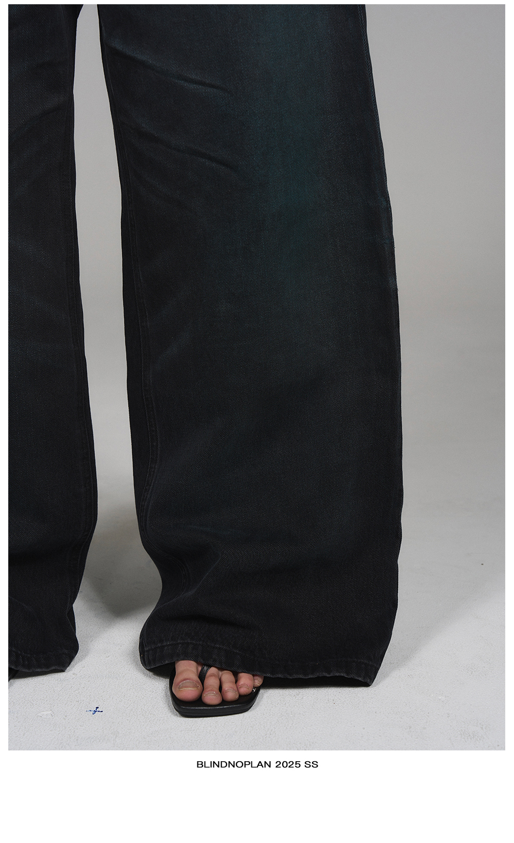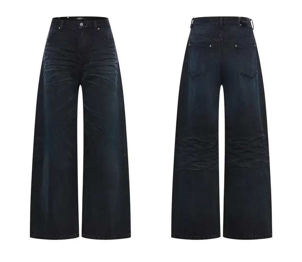 Design Details: These jeans feature a loose silhouette crafted with a blue washed finish combined with sprayed chestnut-toned details. Handmade three-dimensional whisker pleats add depth and a vintage-inspired texture to the overall design.