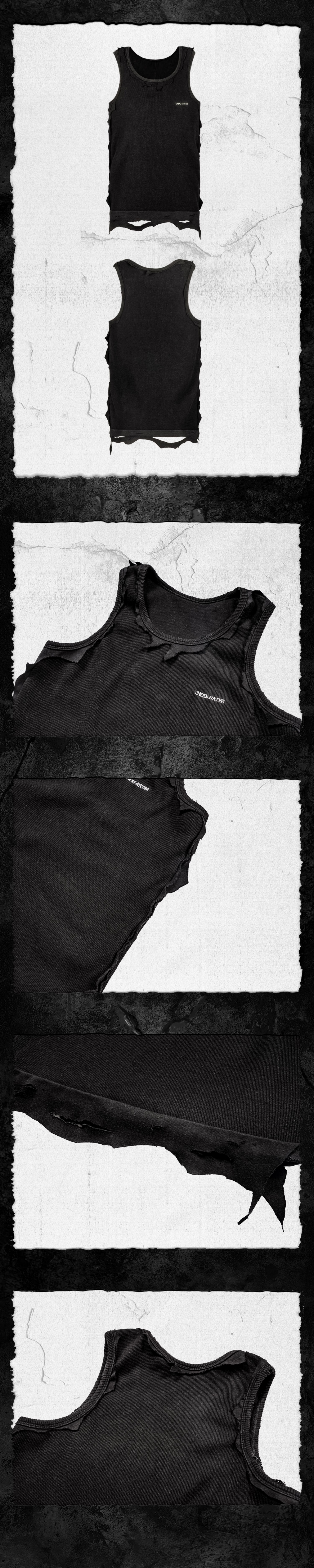 - UW slim-fit design crafted from high-quality ribbed fabric that is both dense and elastic. The garment undergoes industrial washing, giving it the brand’s signature aged texture. Contrasting panel construction with raw-cut, ripped edges mimics the feeling of ruins on the verge of collapse, embodying a battle-worn aesthetic. The chest features a white embroidered brand logo, with stitching like a shadow piercing the dark. Worn alone, it delivers a sharp silhouette; layered under outerwear, it creates understated depth. Whether exploring forbidden ruins or navigating the nocturnal city, this tank is built for the dark urban wanderer.