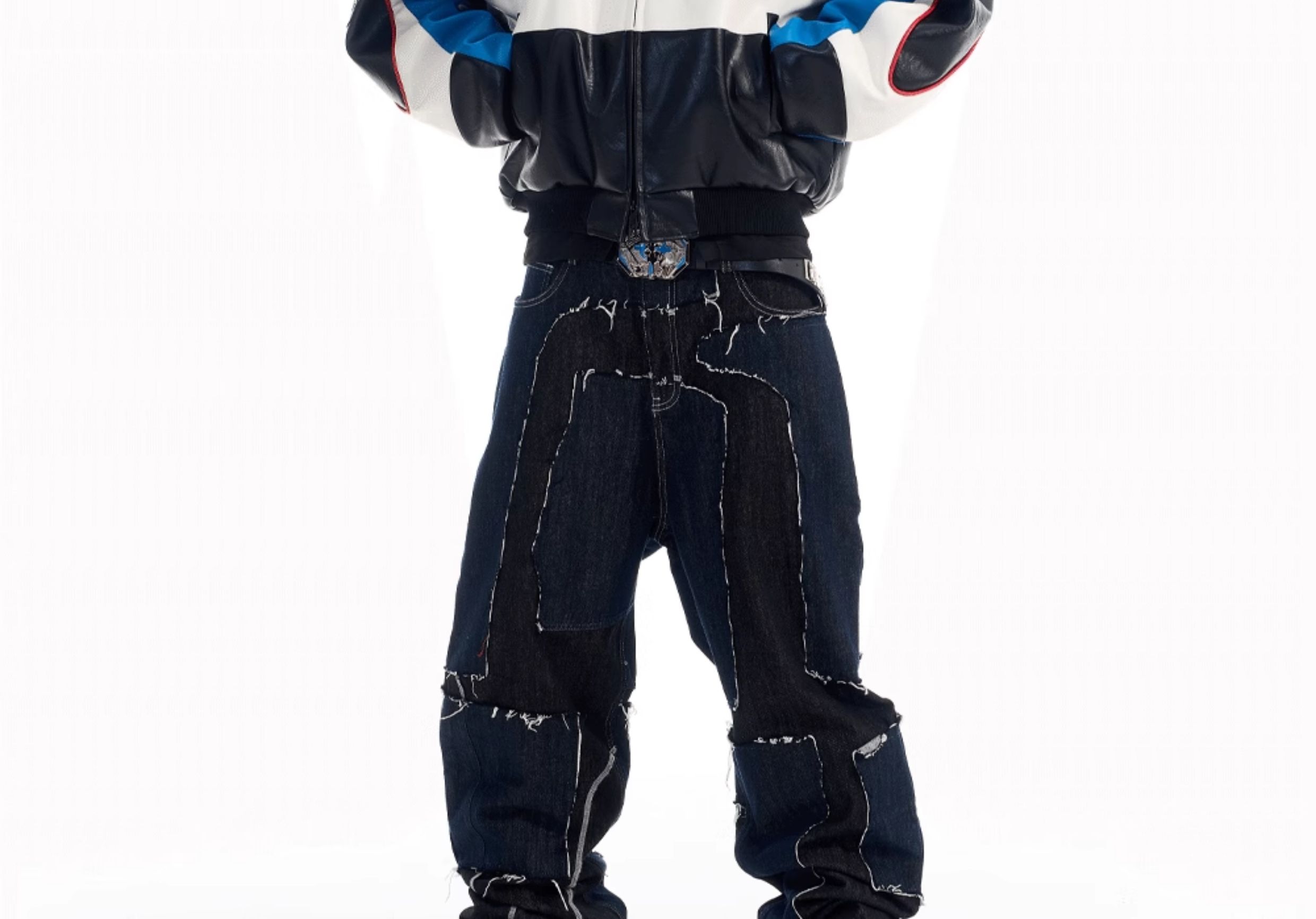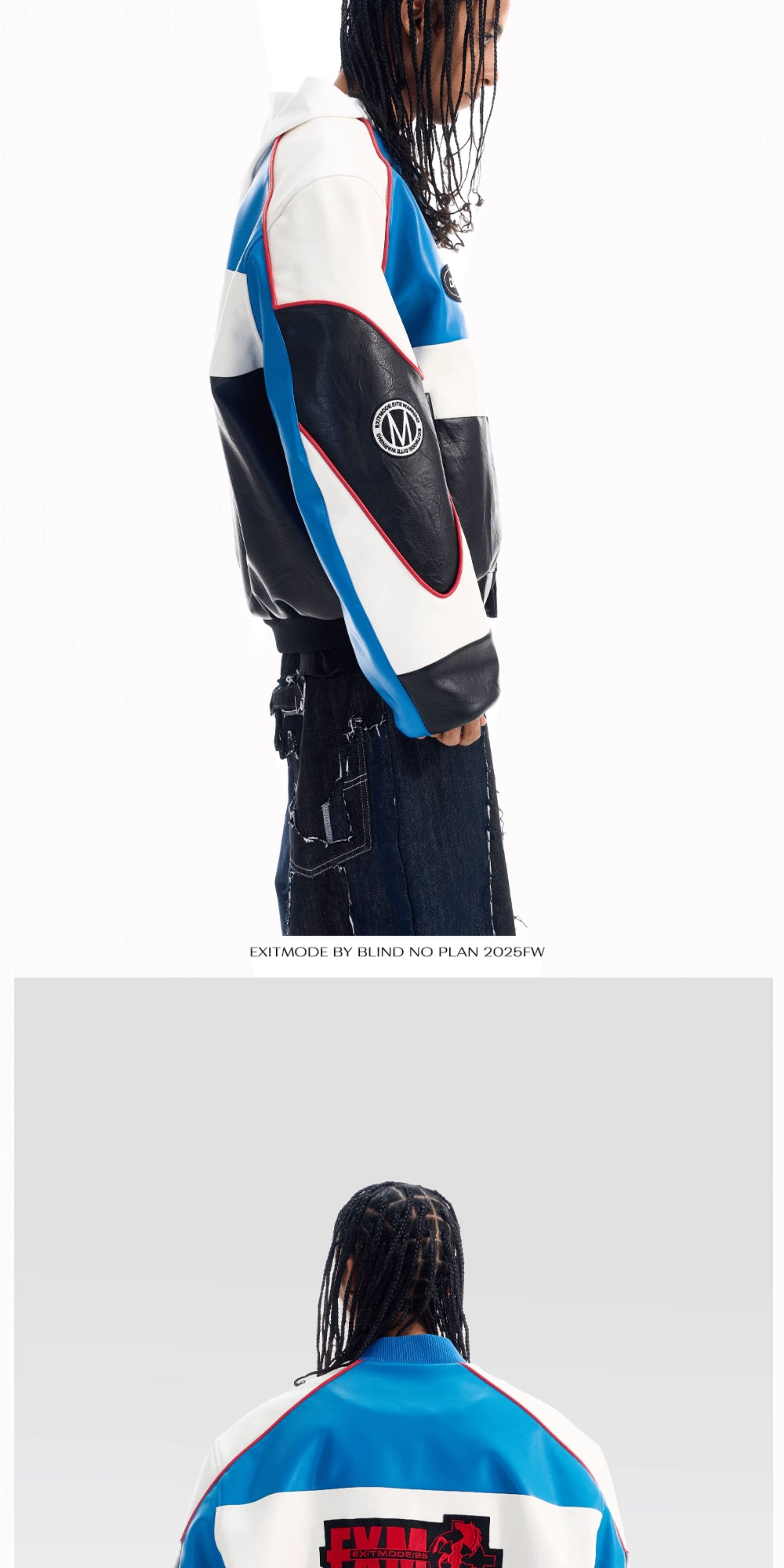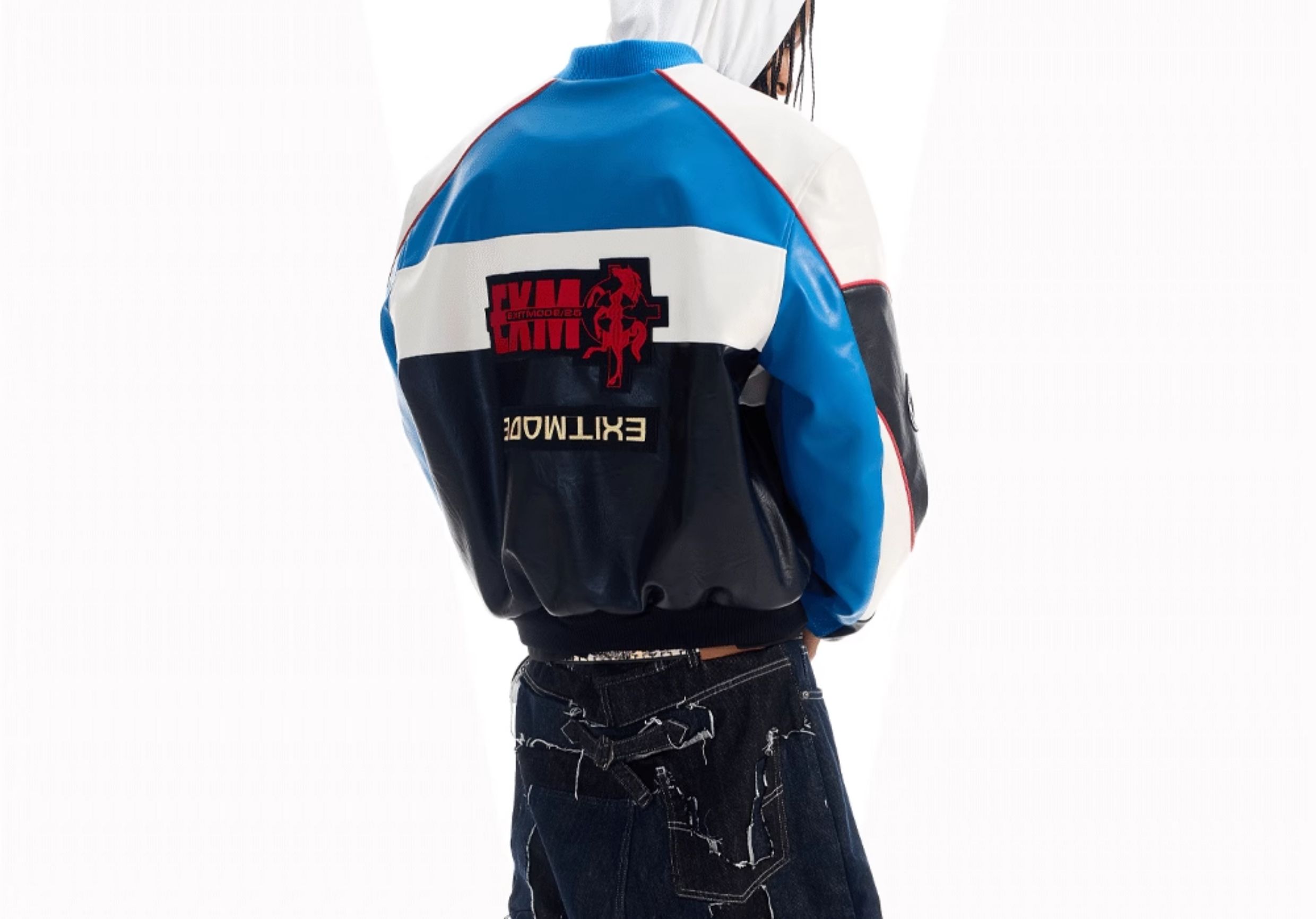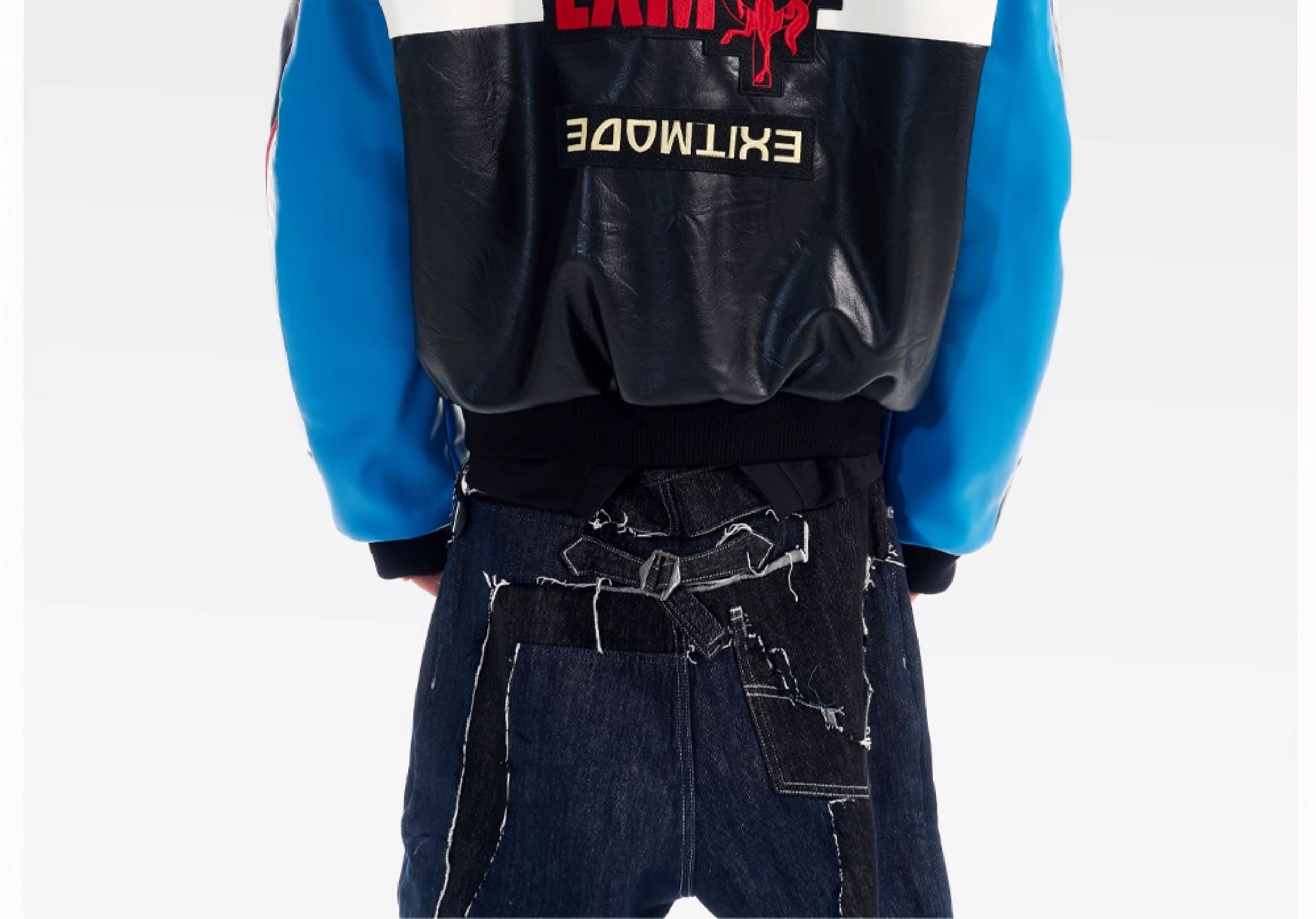 - This jacket features a loose, oversized fit with bold color-block splicing and heavy embroidery details, enhancing its visual impact. Ribbed hems at the bottom add structure and emphasize the voluminous silhouette, creating a standout streetwear piece.