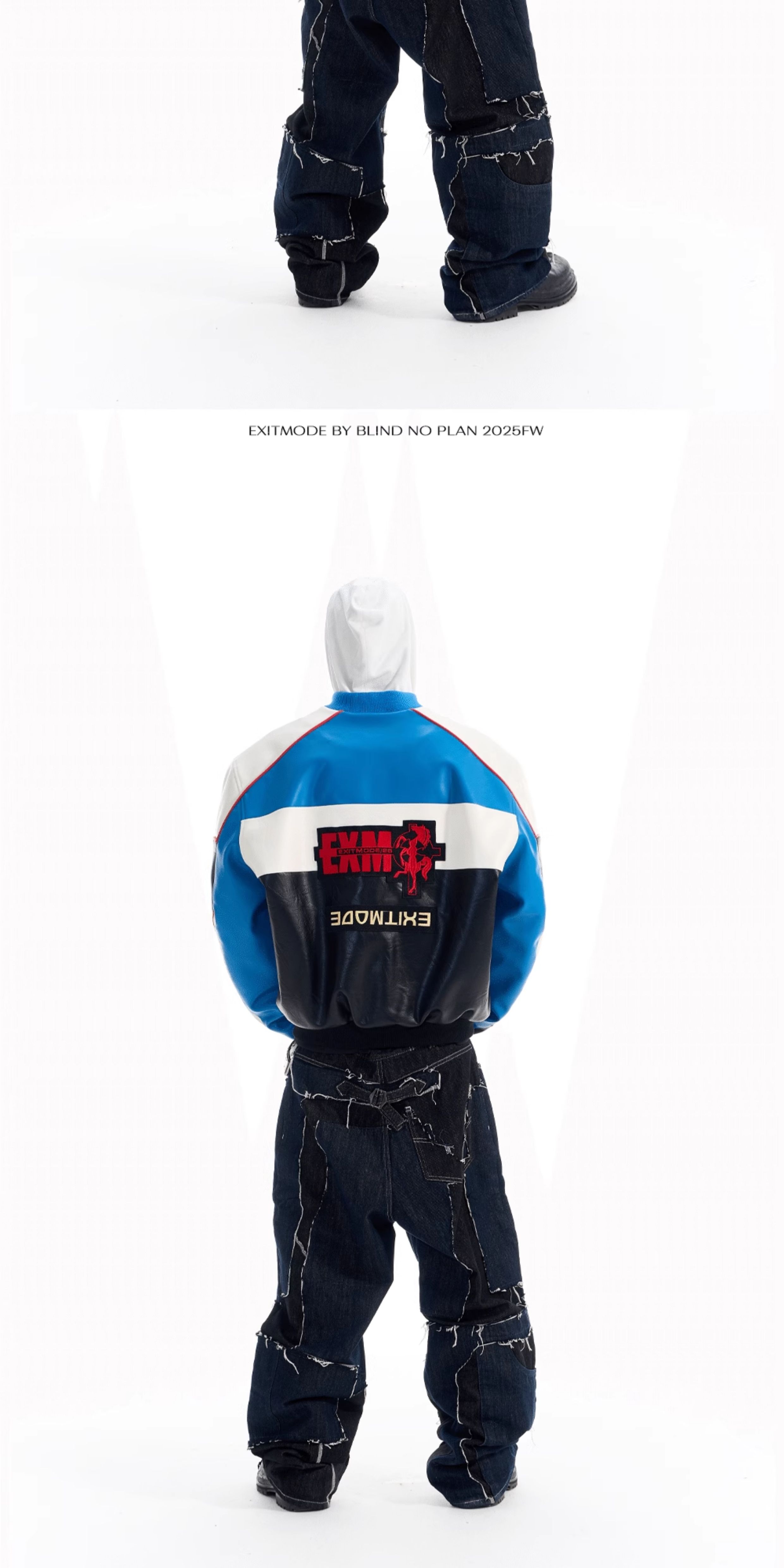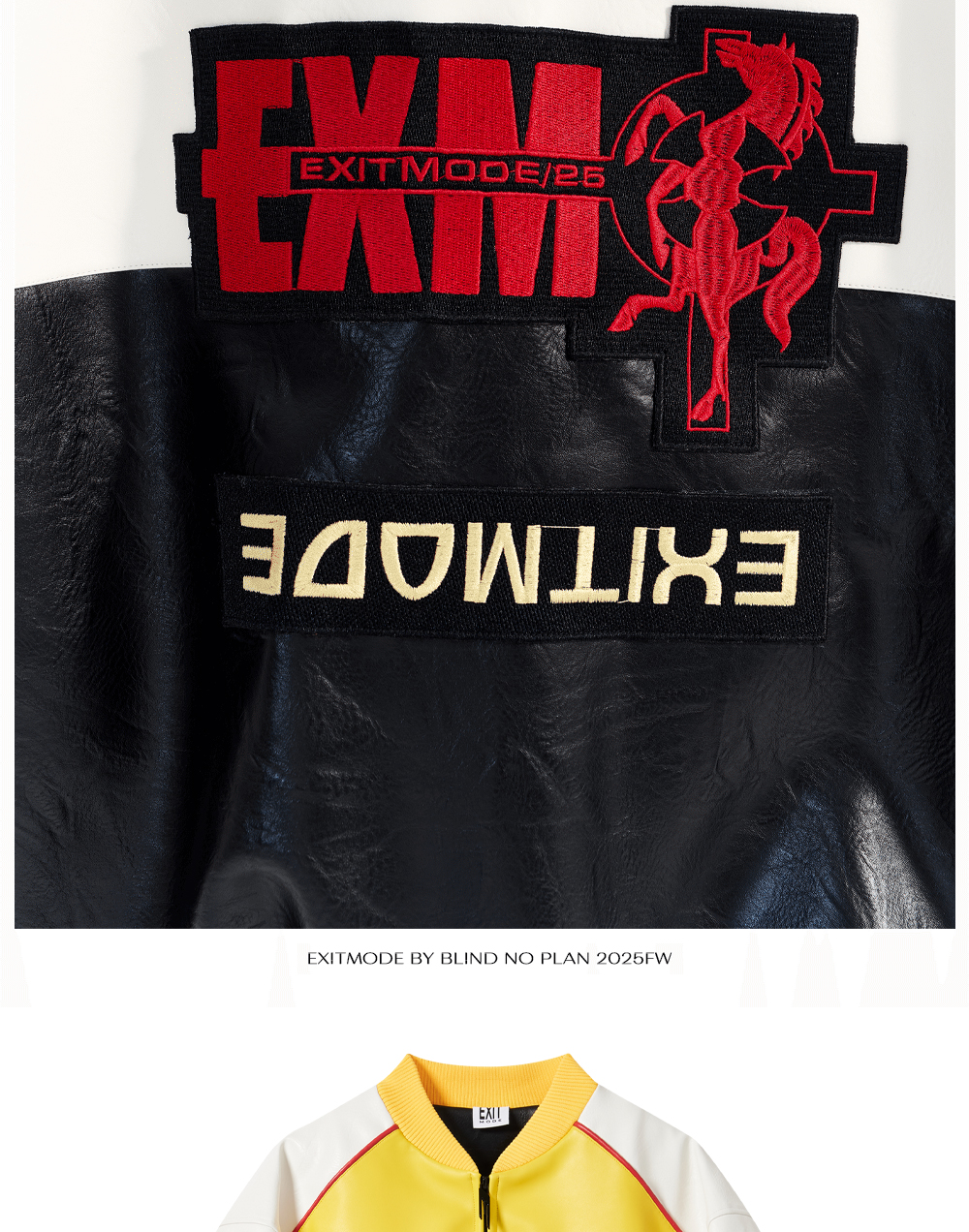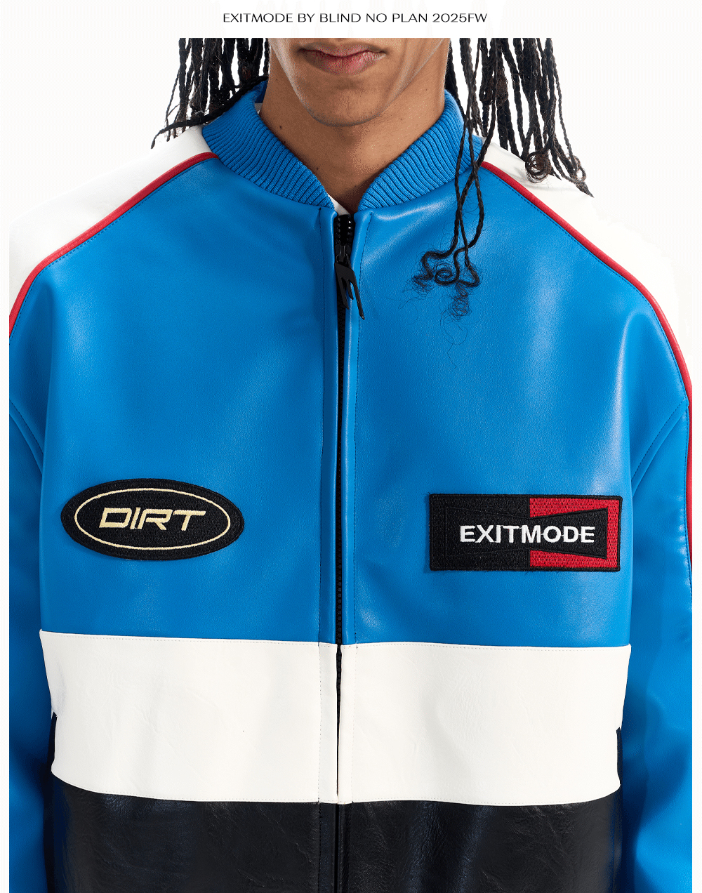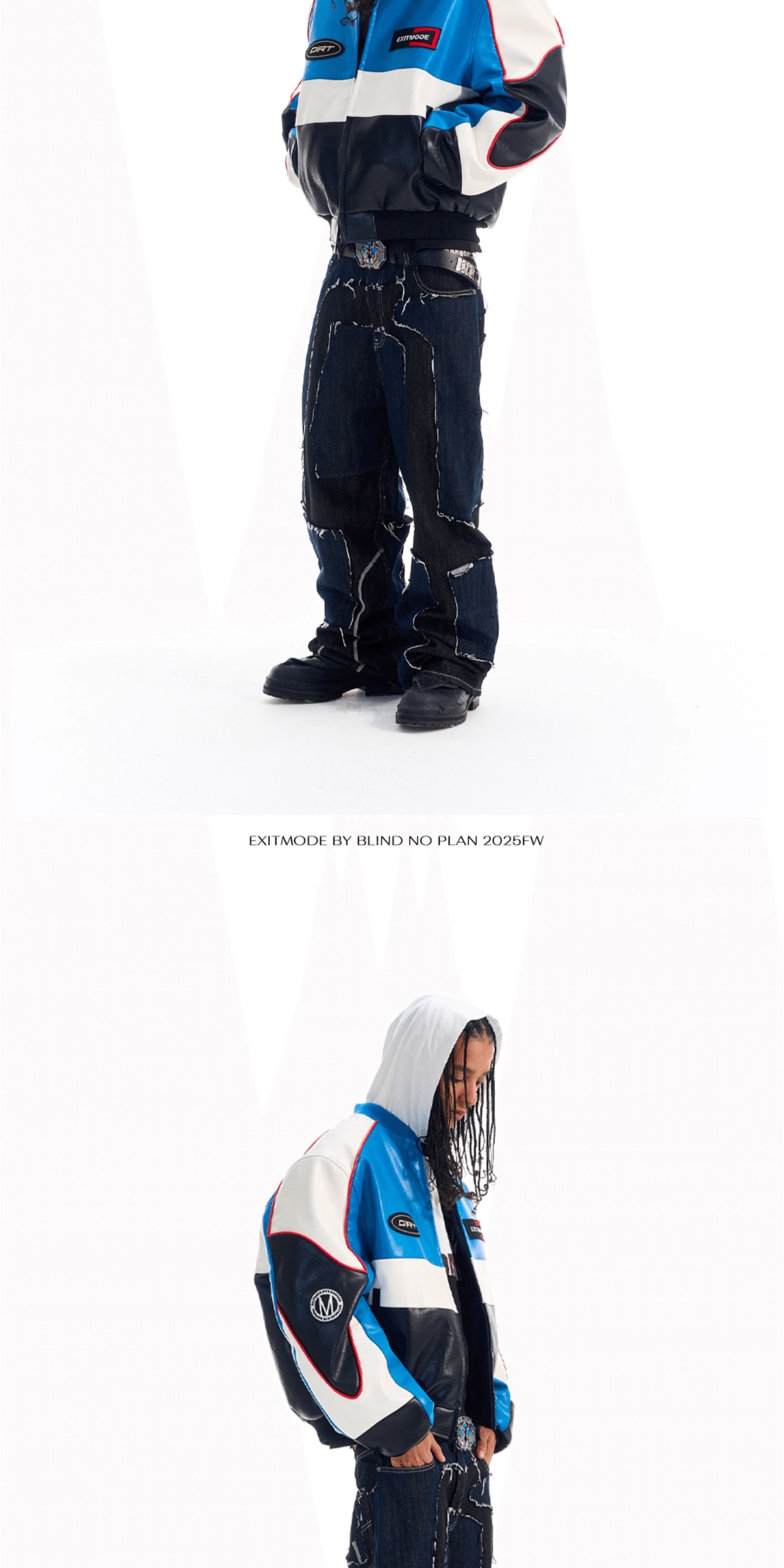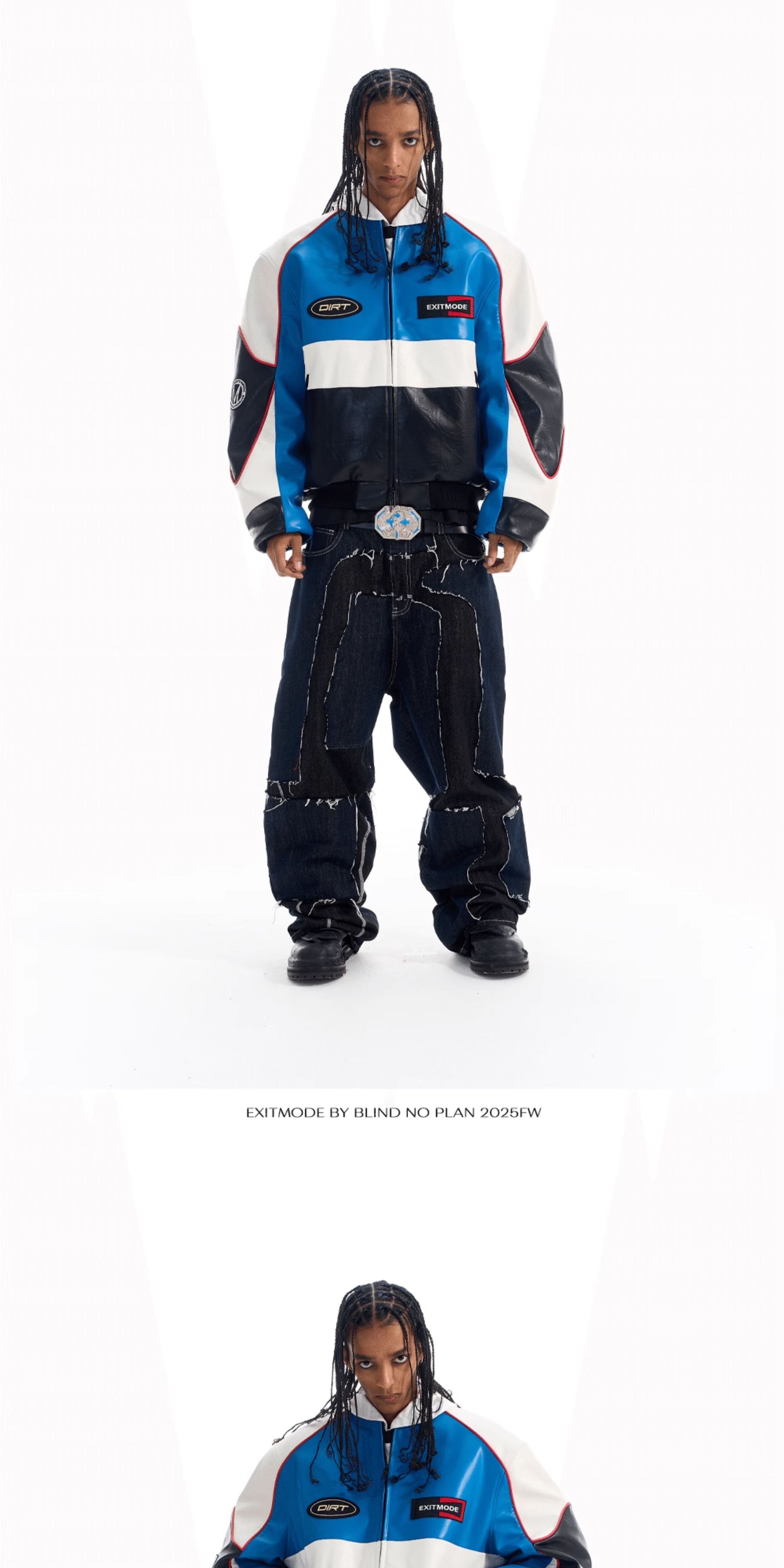 - This jacket features a loose, oversized fit with bold color-block splicing and heavy embroidery details, enhancing its visual impact. Ribbed hems at the bottom add structure and emphasize the voluminous silhouette, creating a standout streetwear piece.