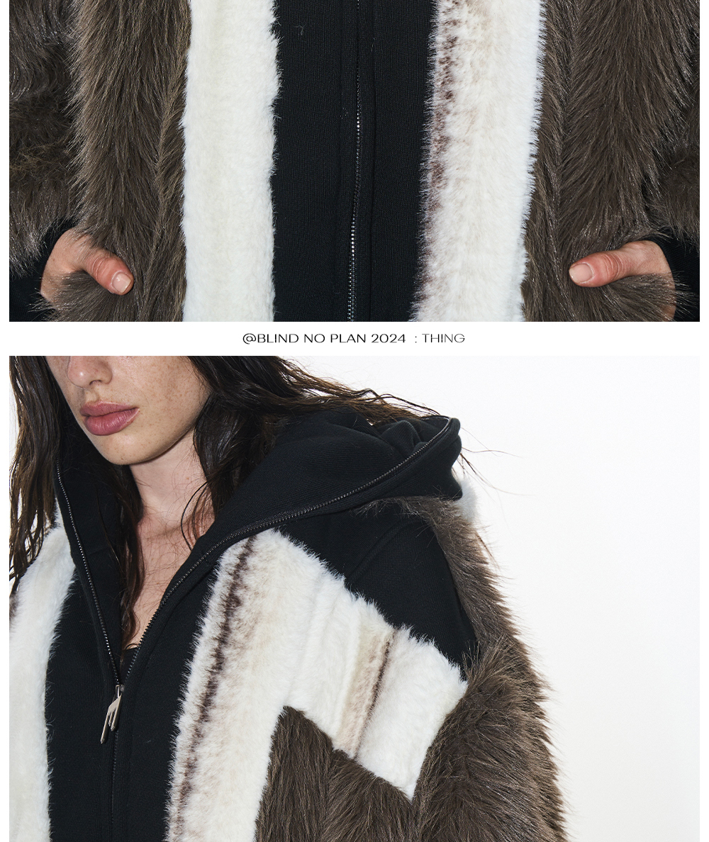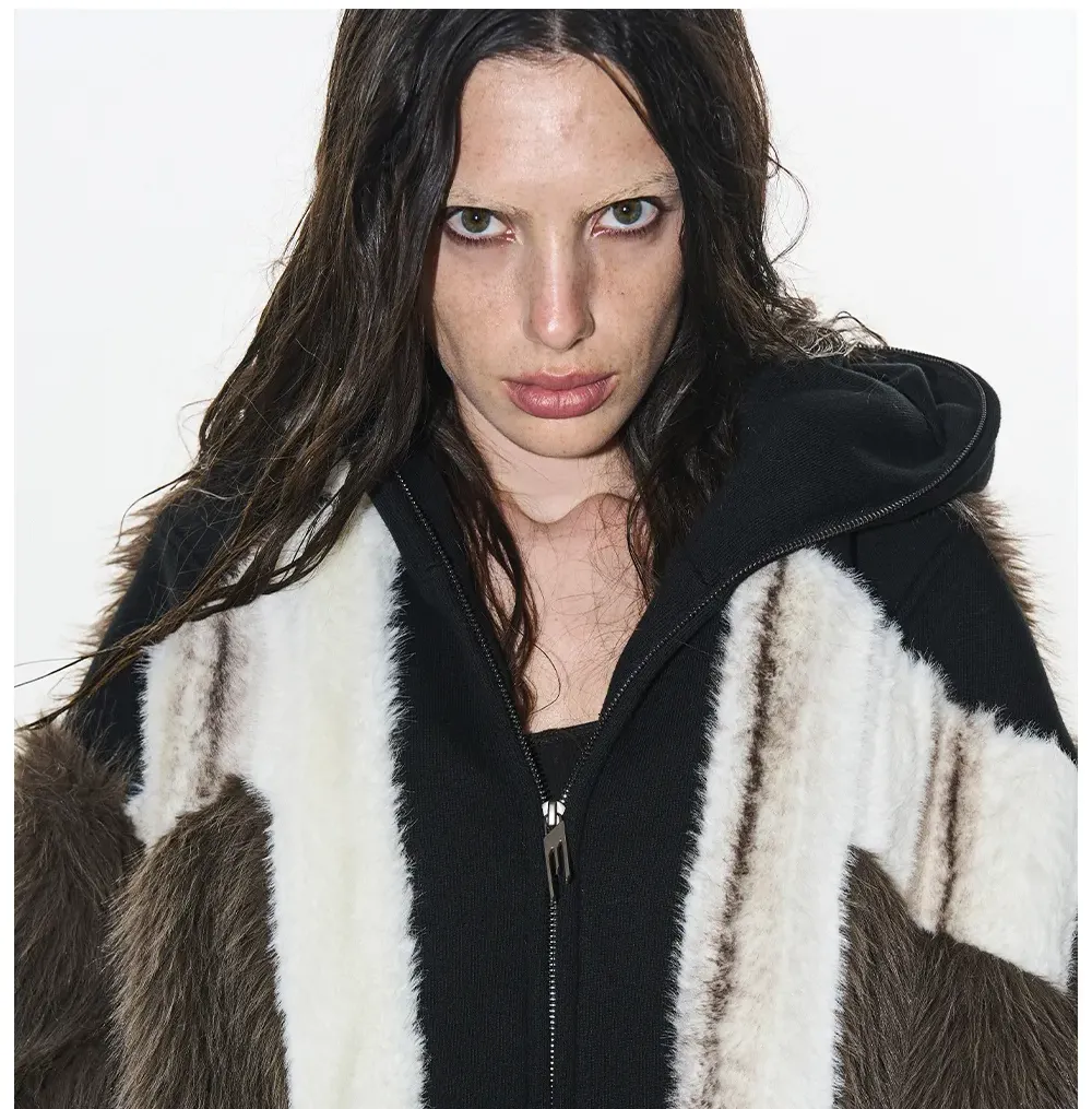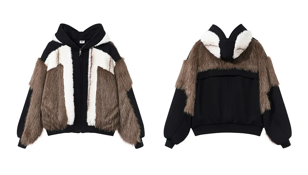 Design Details: This jacket features a color-block design with two different fabrics, incorporating a hooded mask for both warmth and added style. The fabric has a rich texture, offering softness, comfort, and excellent insulation.