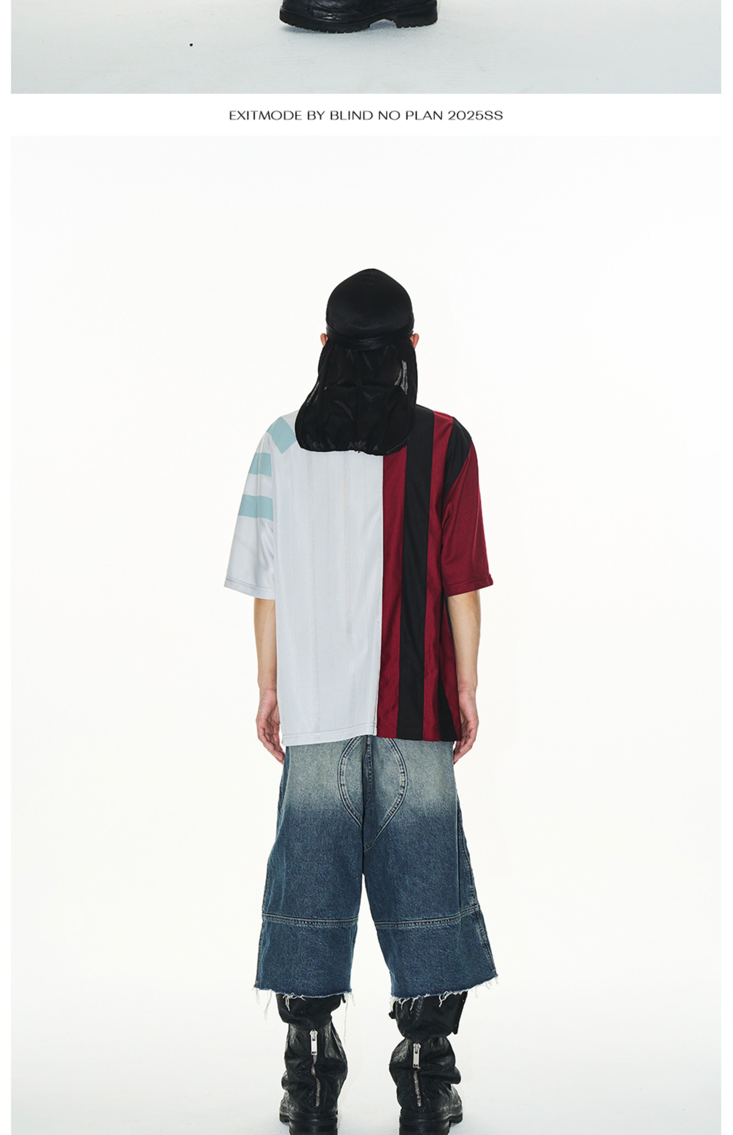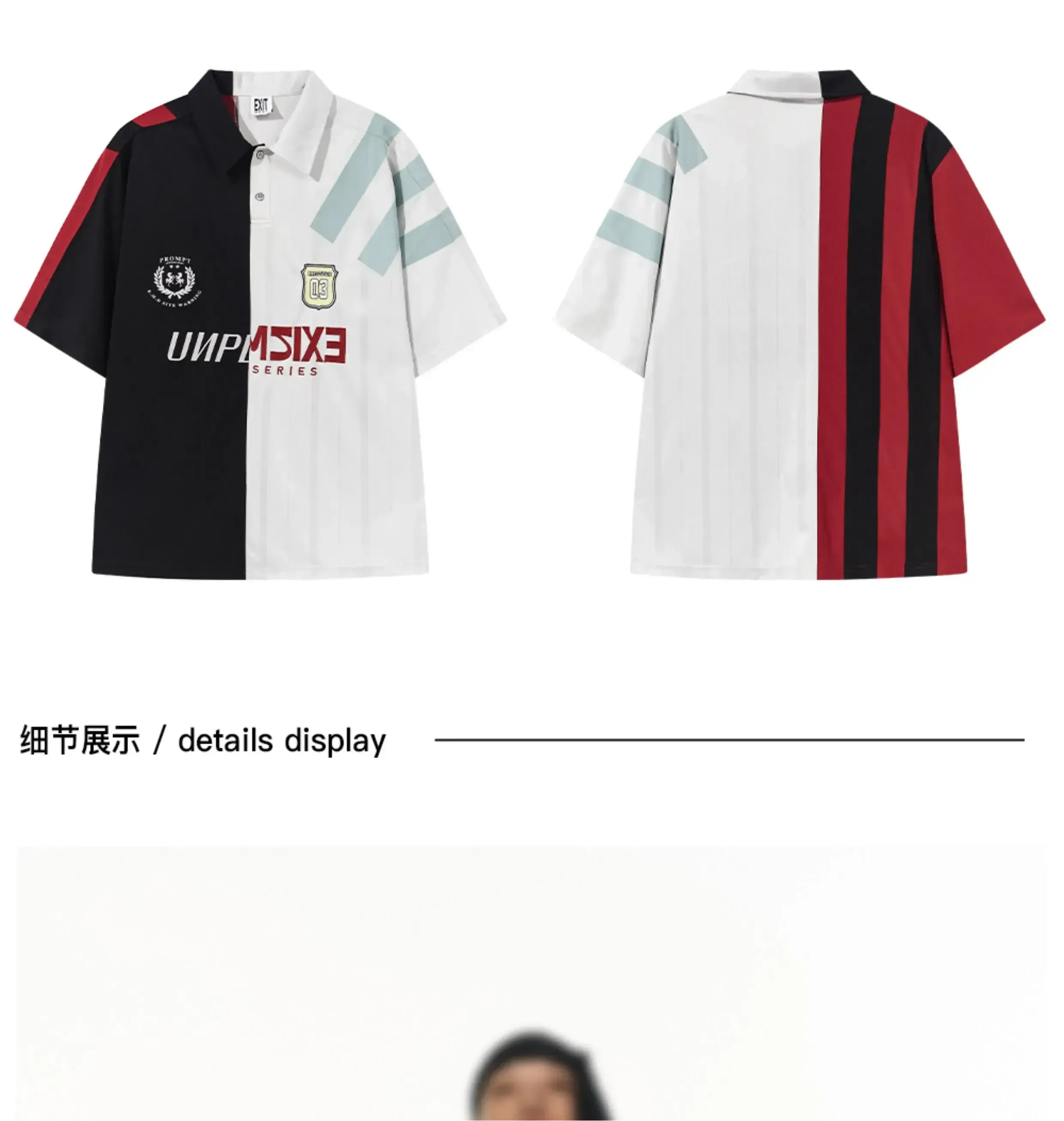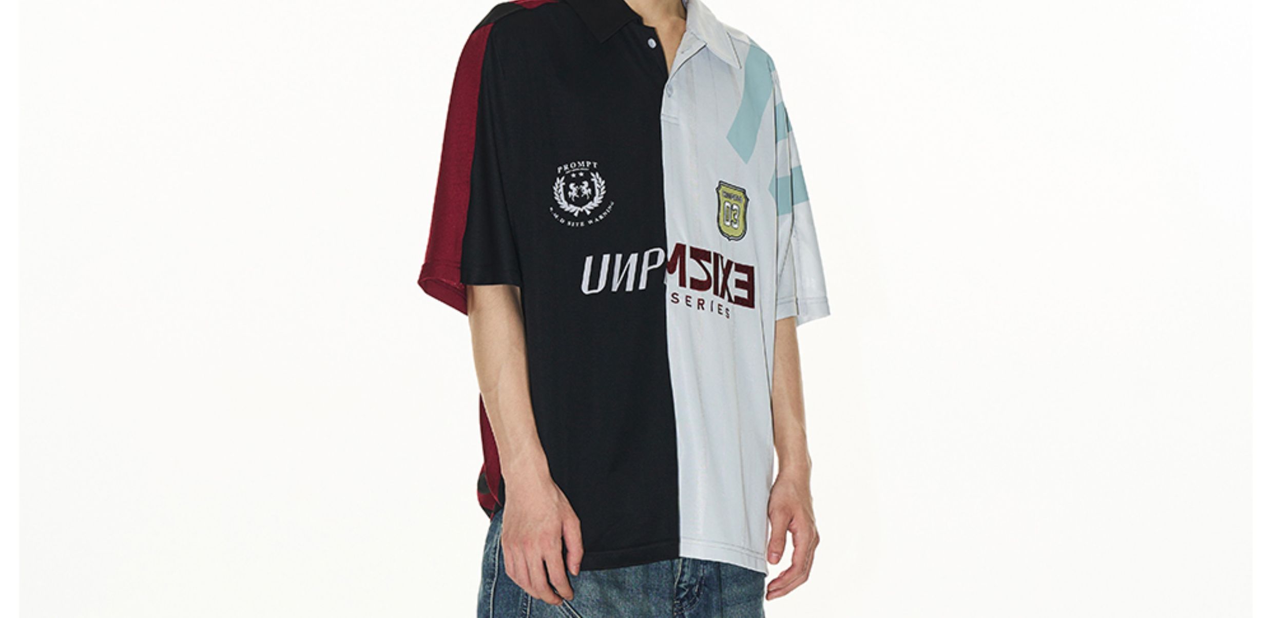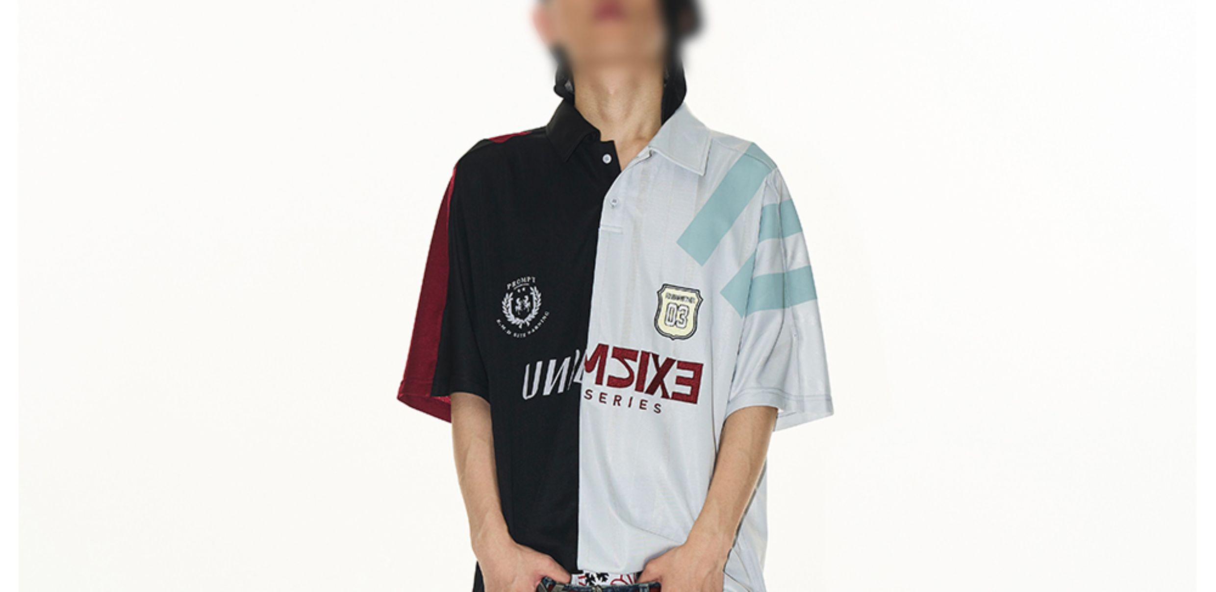 Design Details: This loose-fit polo shirt is crafted with contrasting fabrics in a color-block splicing design. Inspired by remake jersey aesthetics, it features a combination of screen printing and embroidery, creating a visually rich and layered effect.