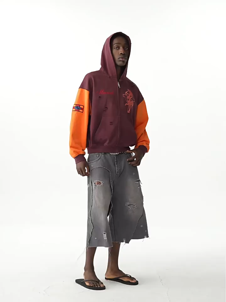 - Featuring a relaxed fit that blends sporty elements into a hoodie design. Contrast embroidery adds detailed texture, while an all-over garment wash, aging, and hand-distressed details create a worn-in look.