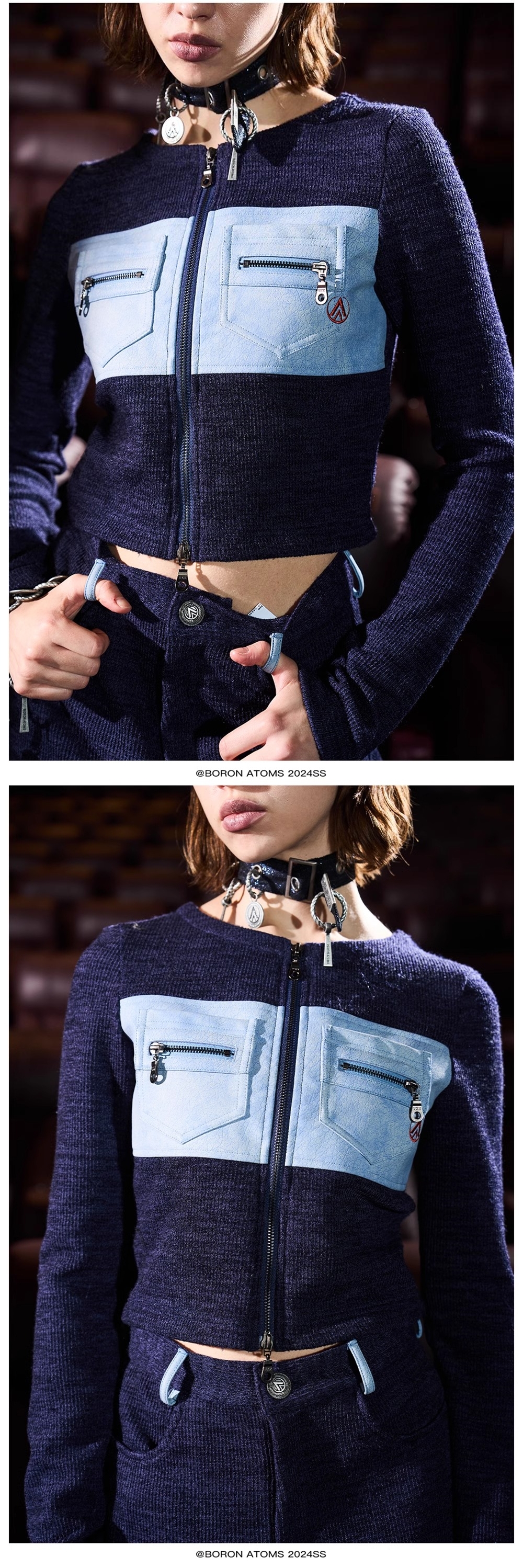 - The overall silhouette is relatively fitted, using comfortable textured knit fabric. The chest features a patchwork of washed texture cracked leather fabric, creating a clean and neat look while ensuring comfort when worn.