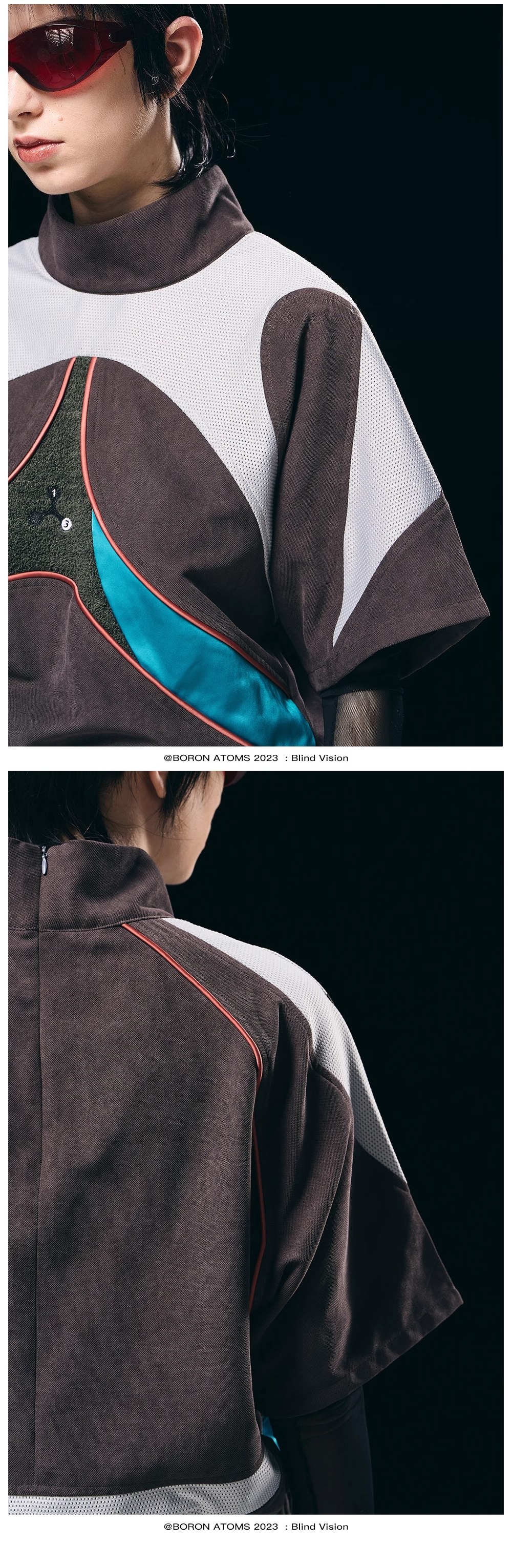 - The overall silhouette is loose, with the garment featuring a combination of various materials in contrasting colors. Exquisite embroidered logos decorate the piece, enhancing the overall sense of detail and providing a rich texture.