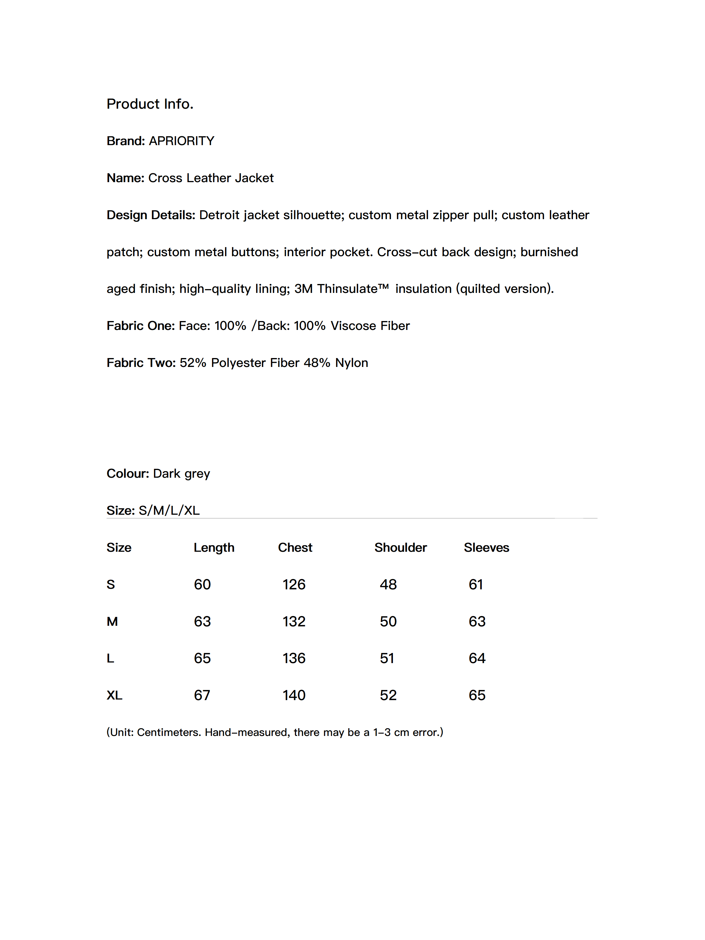 Detroit jacket silhouette; custom metal zipper pull; custom leather patch; custom metal buttons; interior pocket. Cross-cut back design; burnished aged finish; high-quality lining; 3M Thinsulate™ insulation (quilted version).