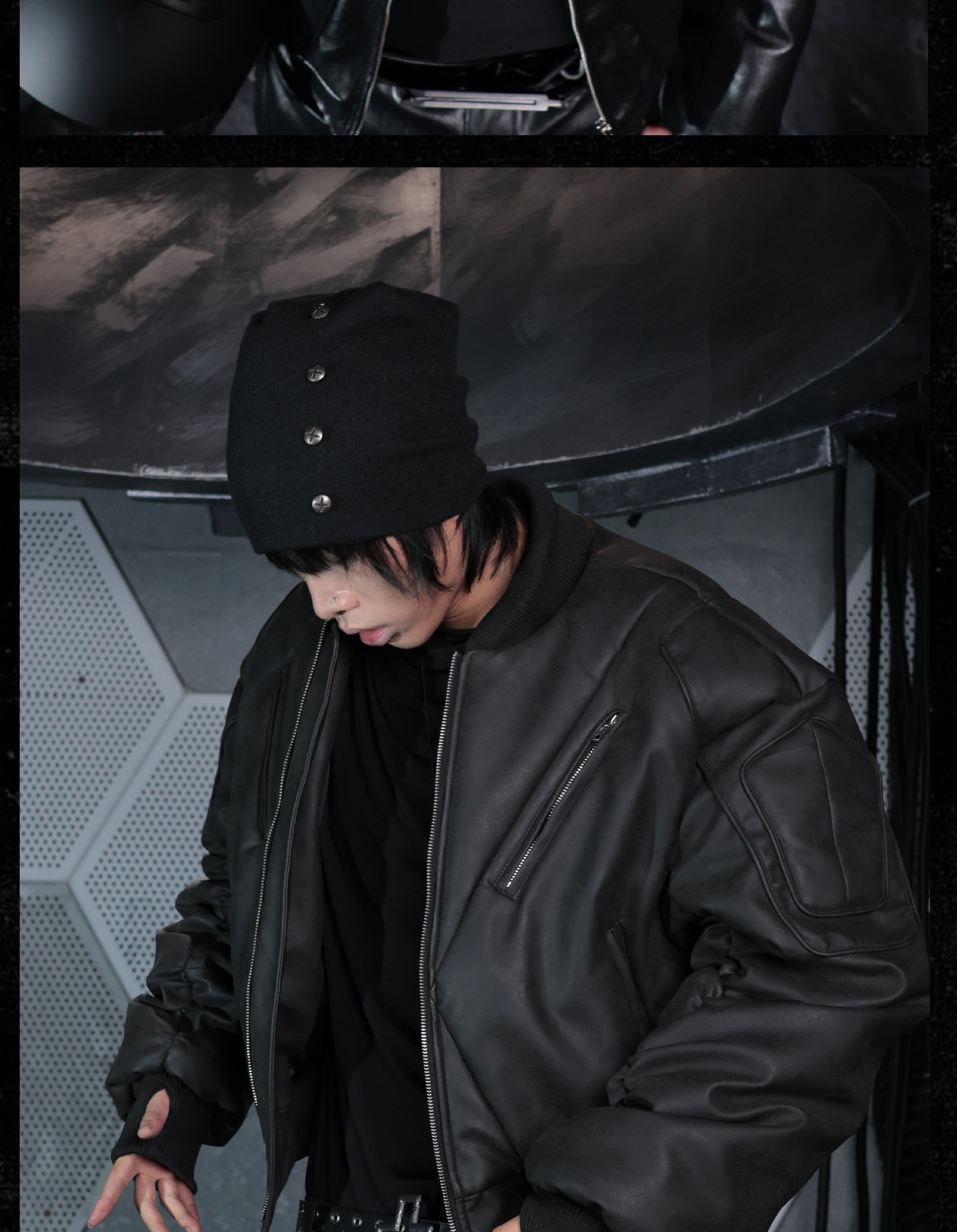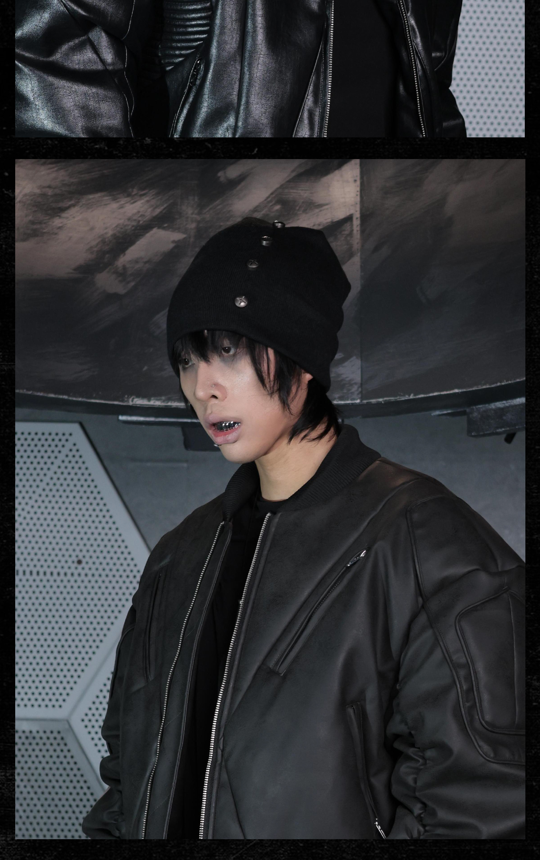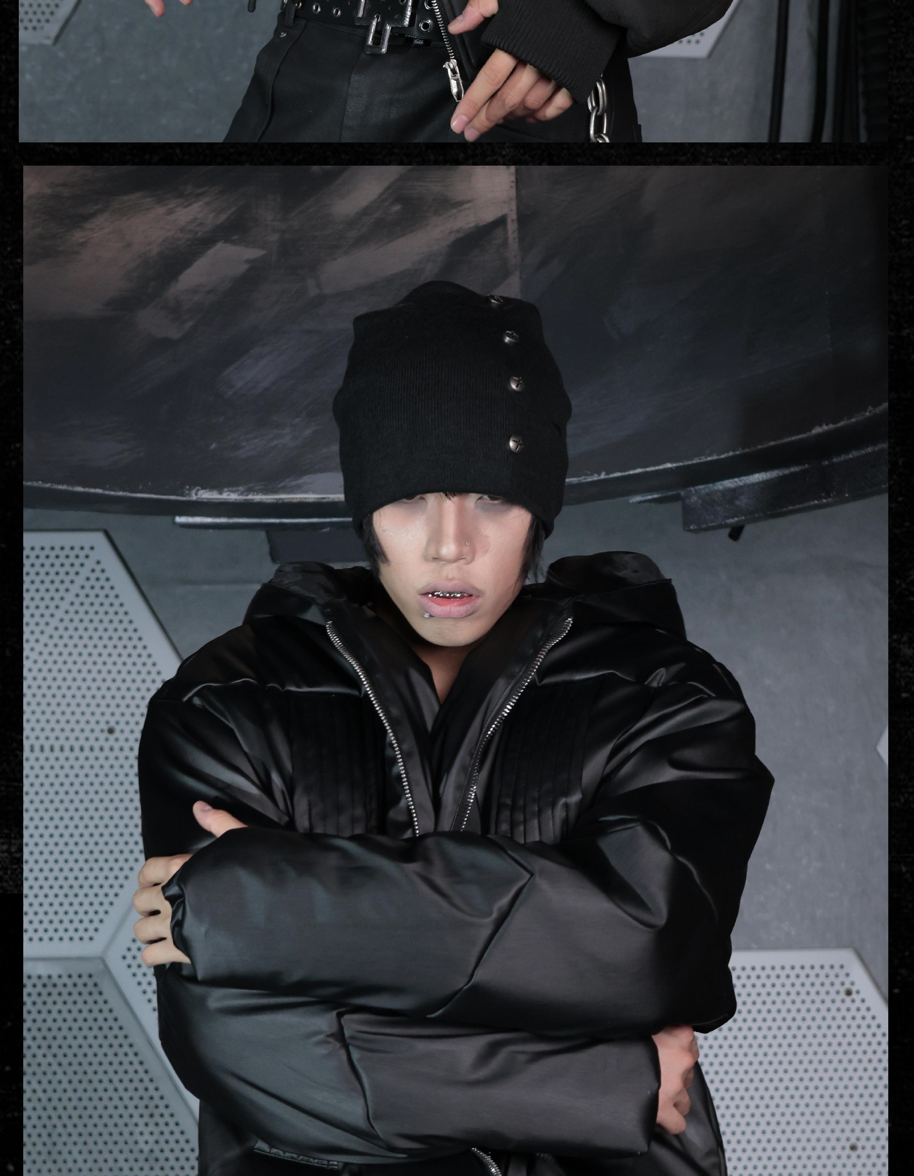 - This knitted beanie offers excellent coverage and a stacked silhouette, giving a bold and structured look. Decorated with vintage-style cross studs, it adds an avant-garde, dark aesthetic to the accessory. Its versatile design makes it easy to pair with various outfits while maintaining a distinctive edge.