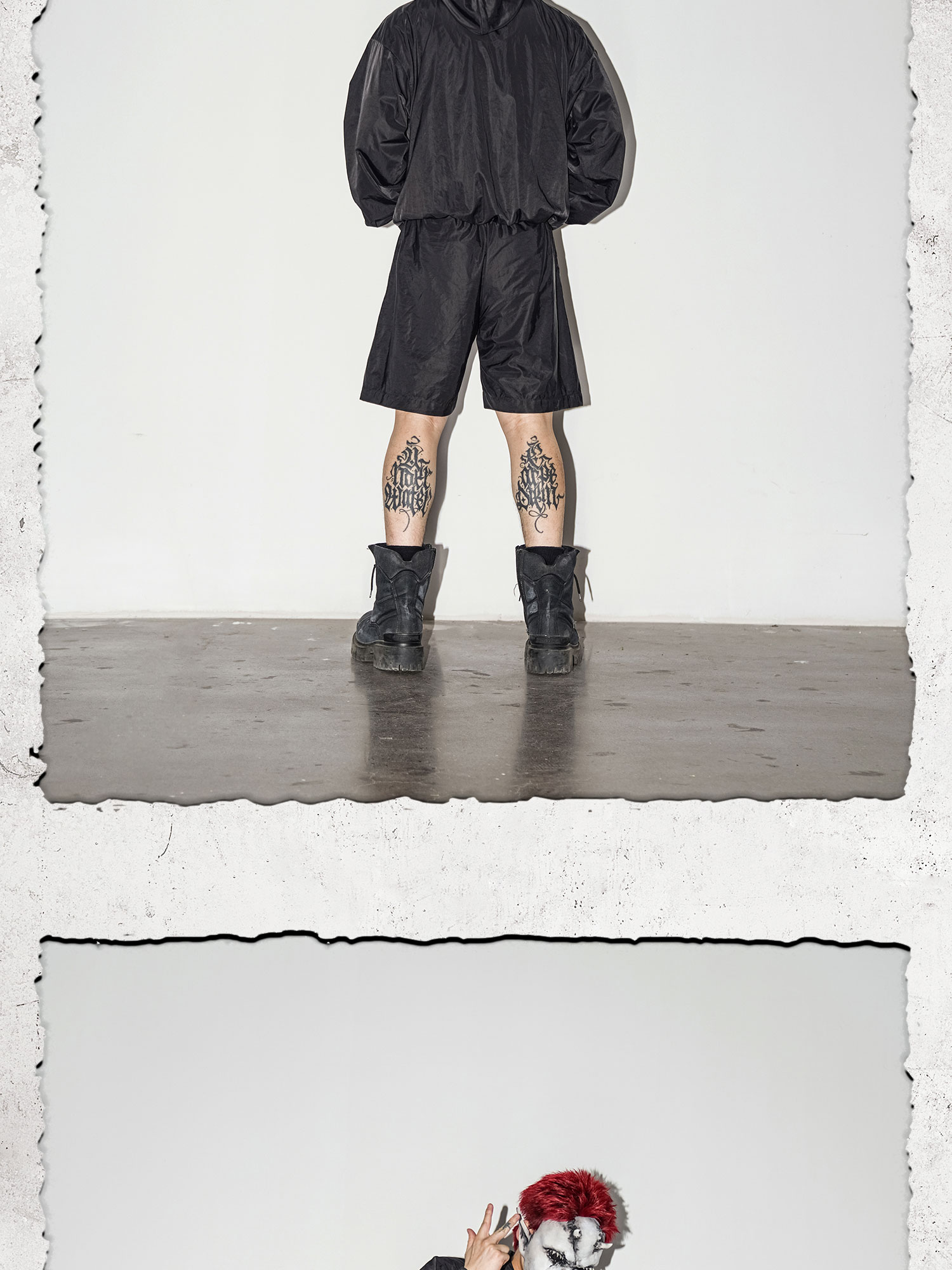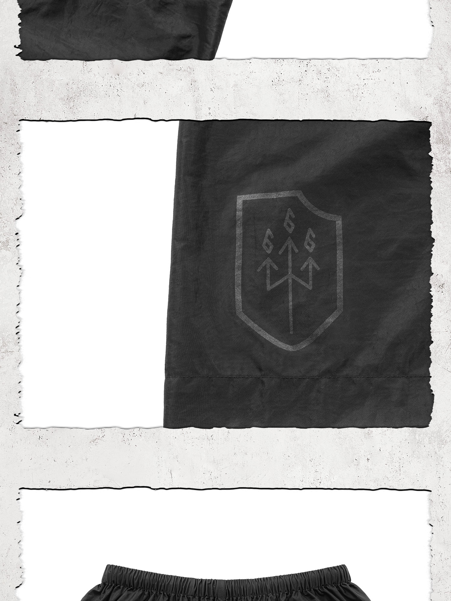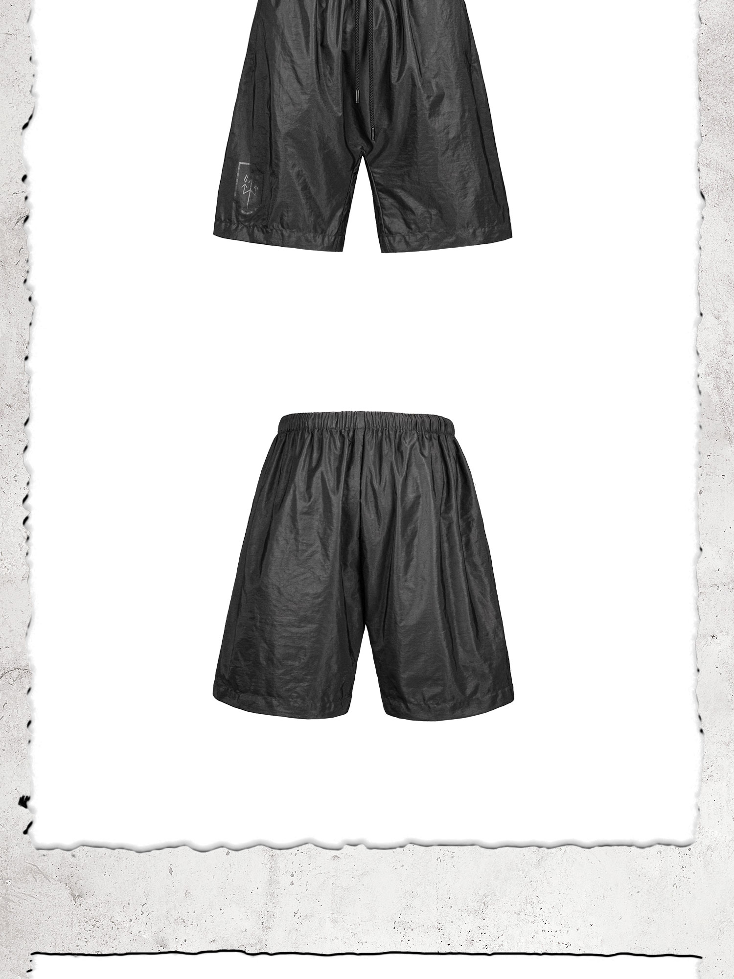 - Designed in a UW slim fit, these shorts are crafted from water-repellent fabric, combining mobility with a lightweight and breathable feel. The elastic waistband ensures comfort and adaptability, while the seamless sides and hidden pockets enhance a clean, unified silhouette. A Demon Hunter Squad insignia is printed on the leg using special ink, creating a refined look that shifts subtly under different lighting. Serving as part of the Dark Soul Squad’s covert uniform, these shorts embody stealth and function, made for blending silently into the night along the shadowed edges of the dark city.