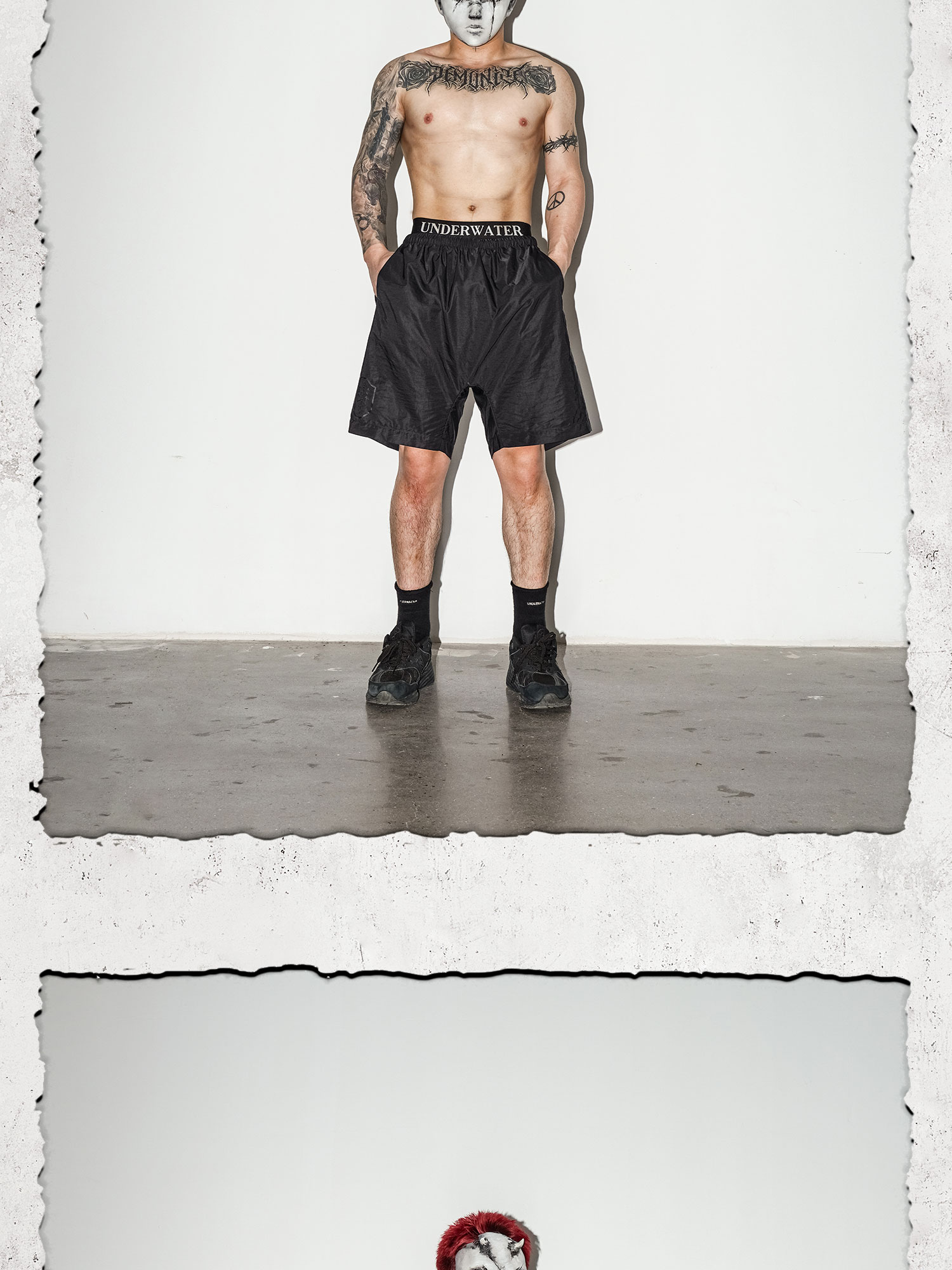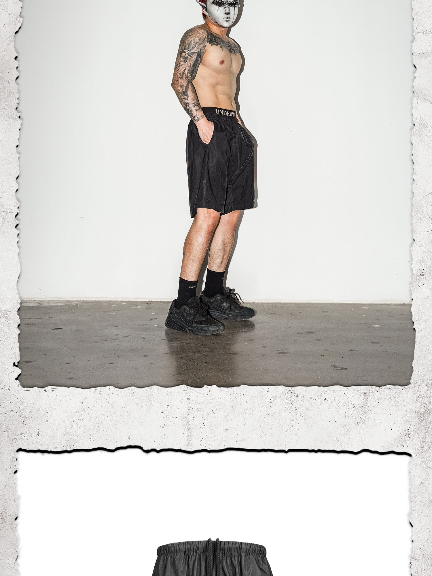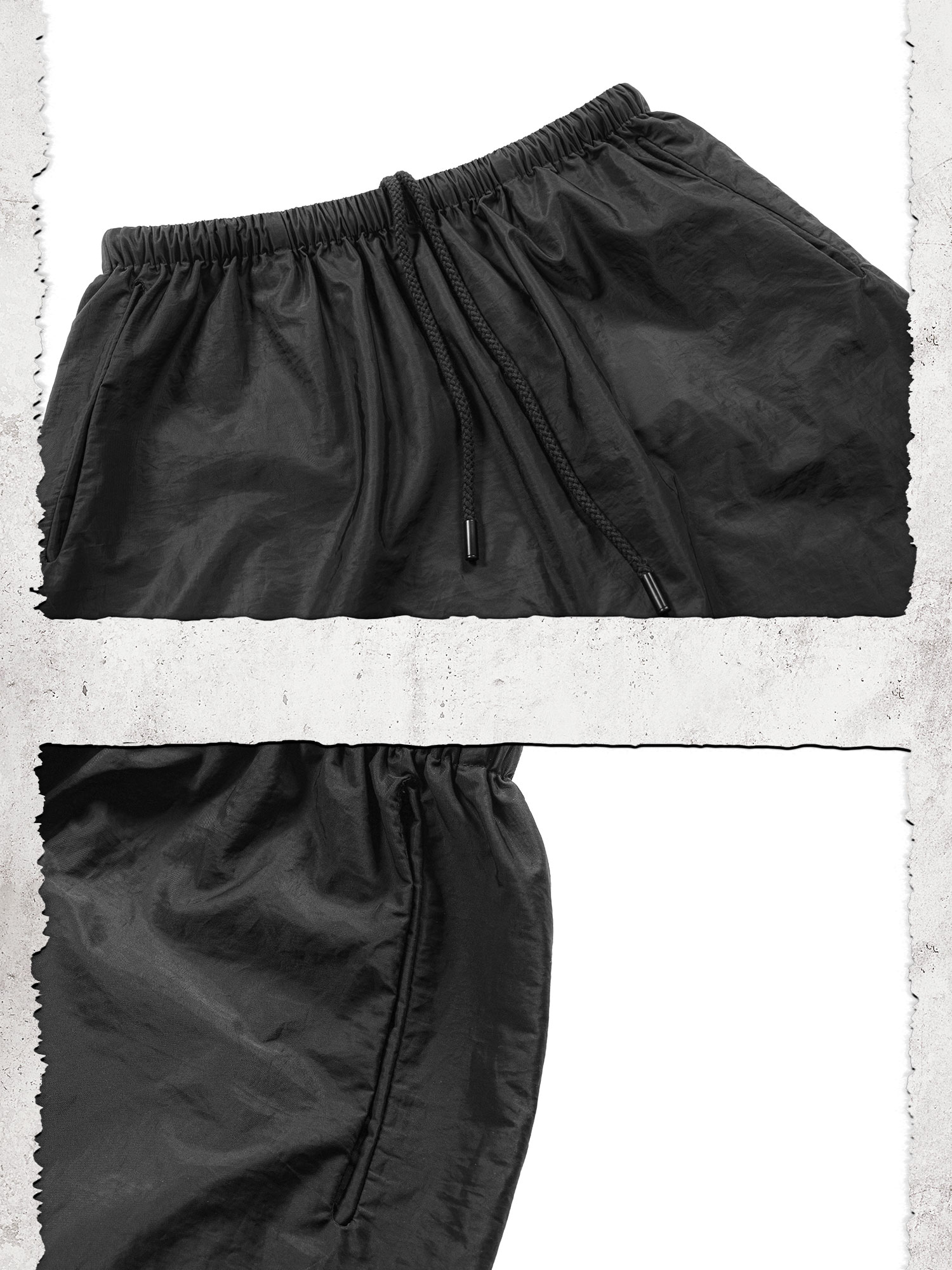 - Designed in a UW slim fit, these shorts are crafted from water-repellent fabric, combining mobility with a lightweight and breathable feel. The elastic waistband ensures comfort and adaptability, while the seamless sides and hidden pockets enhance a clean, unified silhouette. A Demon Hunter Squad insignia is printed on the leg using special ink, creating a refined look that shifts subtly under different lighting. Serving as part of the Dark Soul Squad’s covert uniform, these shorts embody stealth and function, made for blending silently into the night along the shadowed edges of the dark city.