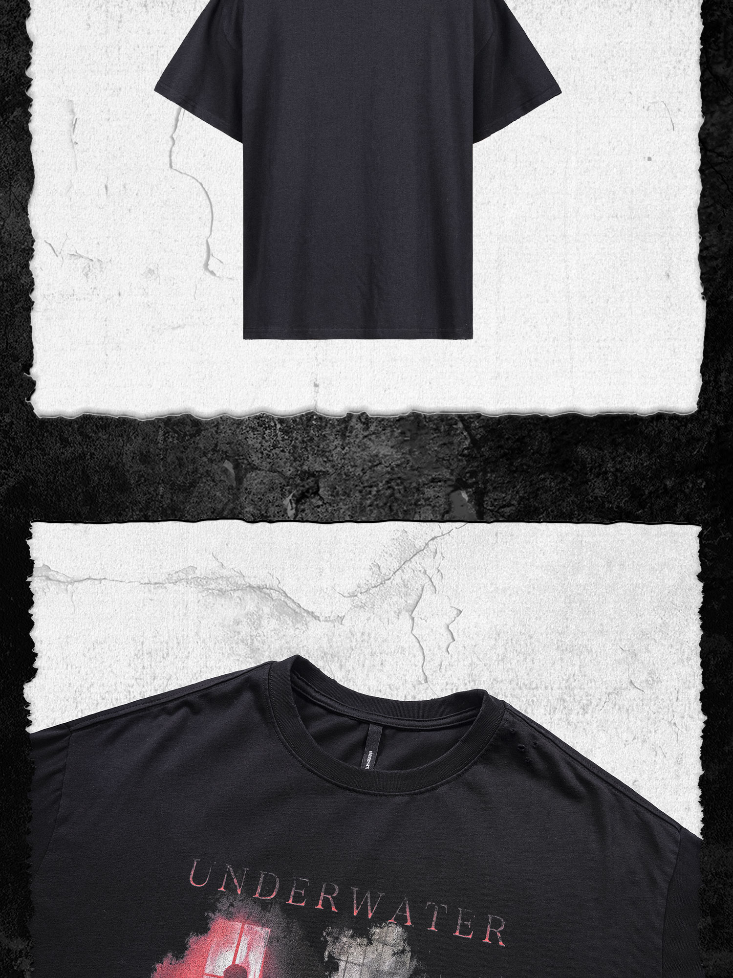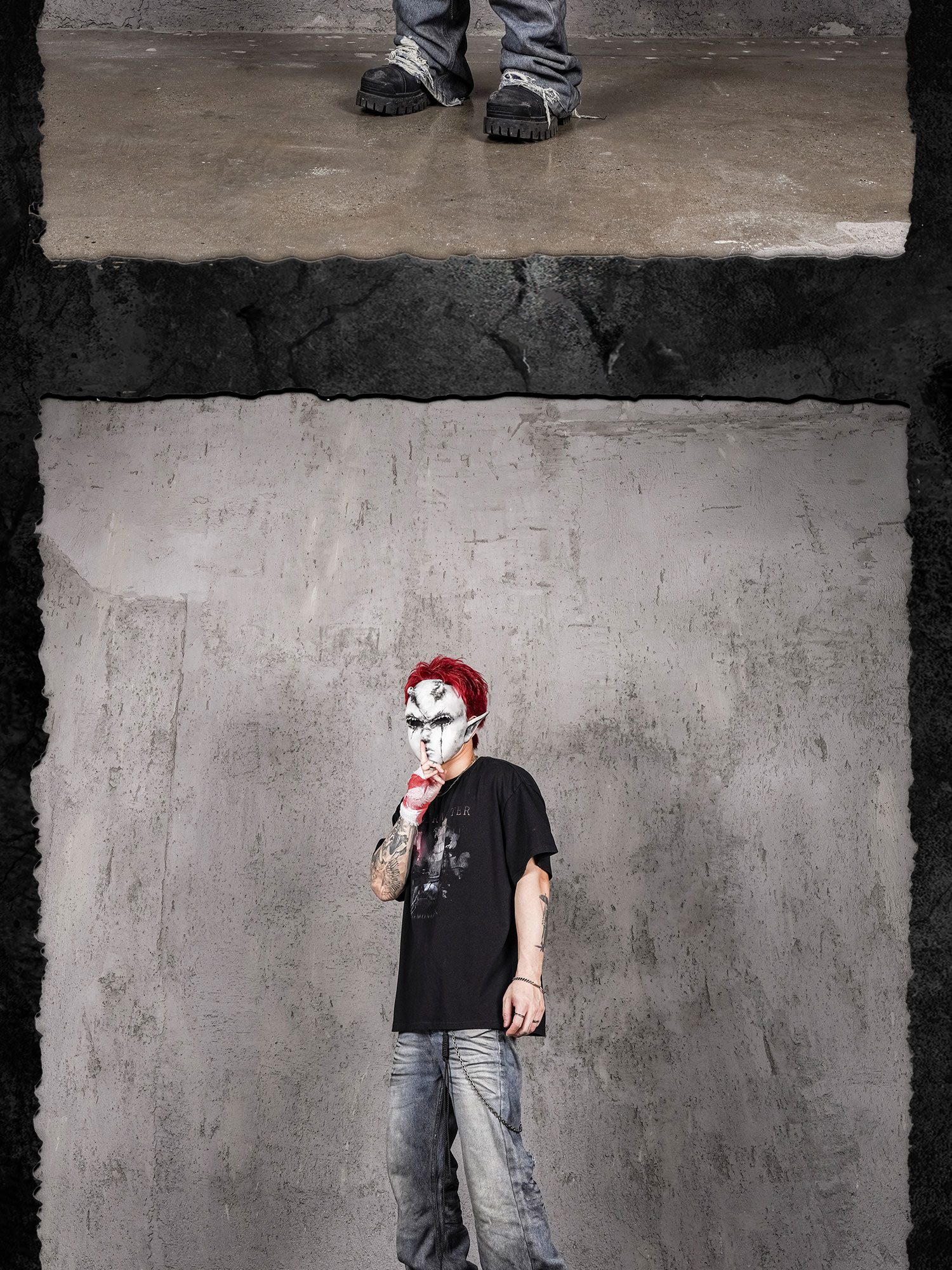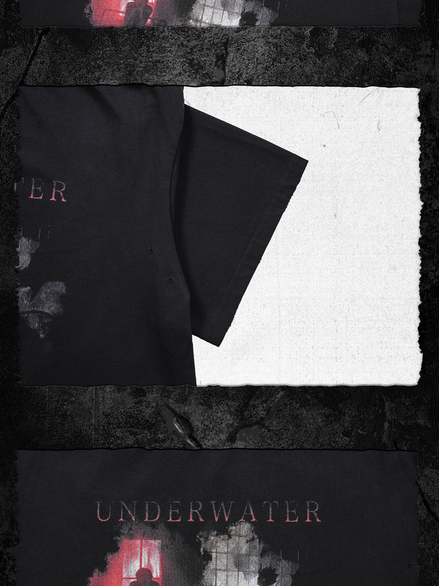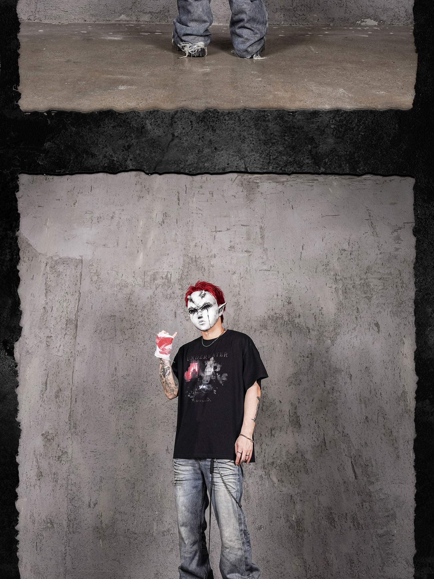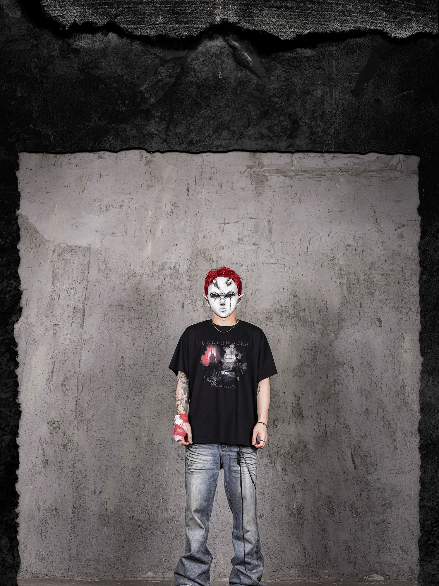 - This UW slim-fit tee is crafted from soft, skin-friendly cotton for both quality and comfort. It adopts the brand’s signature irregular hand-distressing, with frayed neckline edges and hole details that accentuate its raw aesthetic. The front graphic, printed using imported Kornit digital direct-injection technology, captures broken textures with precision. Taken from the brand’s original manga UNDERWATER, the artwork depicts a demonized boy engulfed in black mist, with a silent night framed beyond the window. Each time the eyes drift shut, it feels like entering a dark paradise where haunted whispers of the soul linger on both sides.