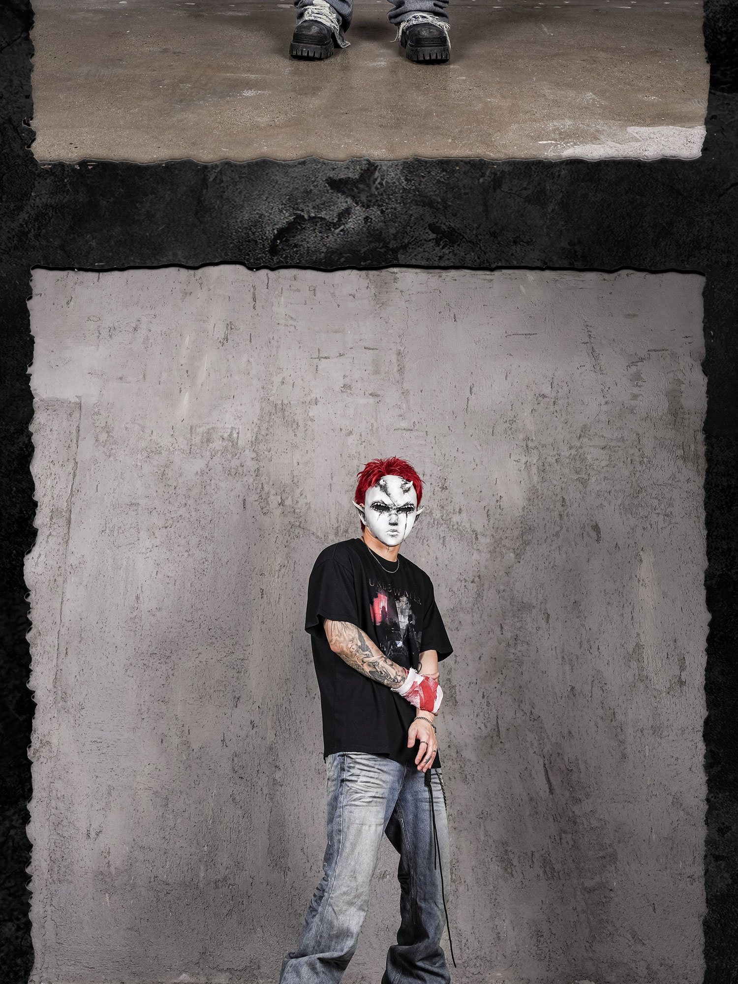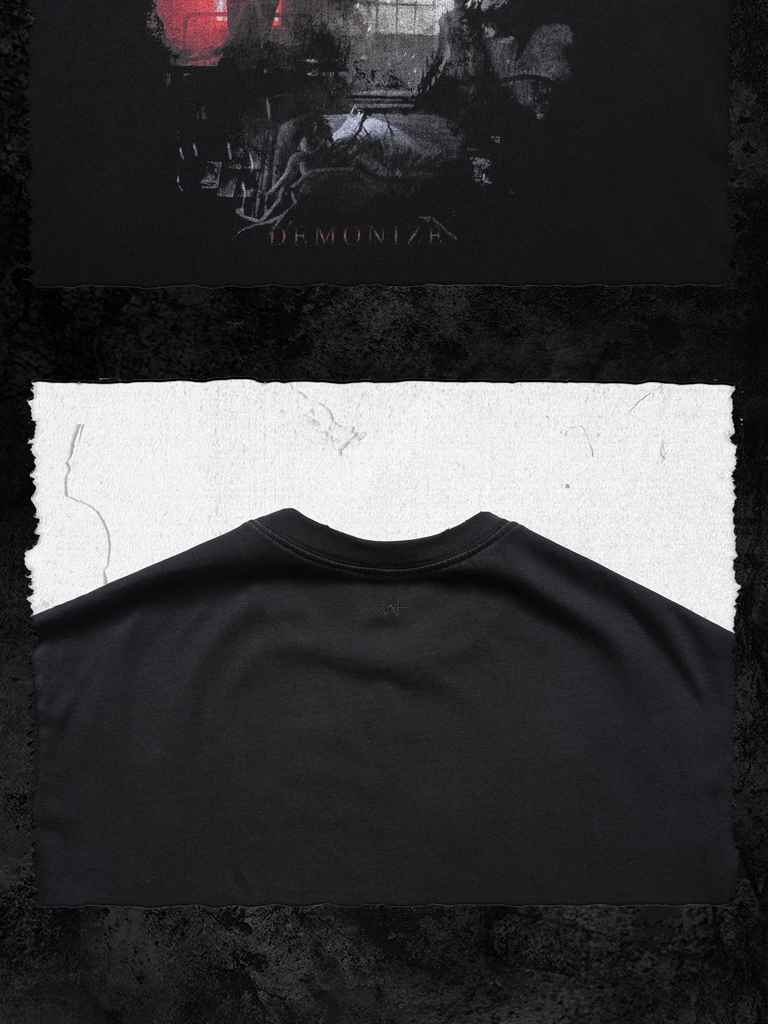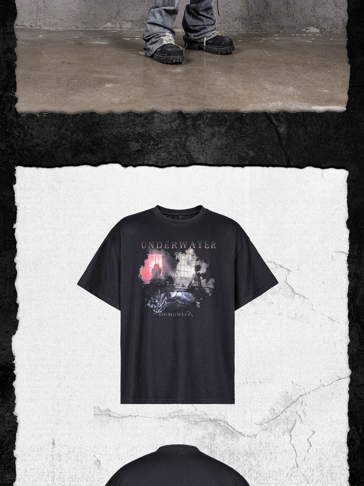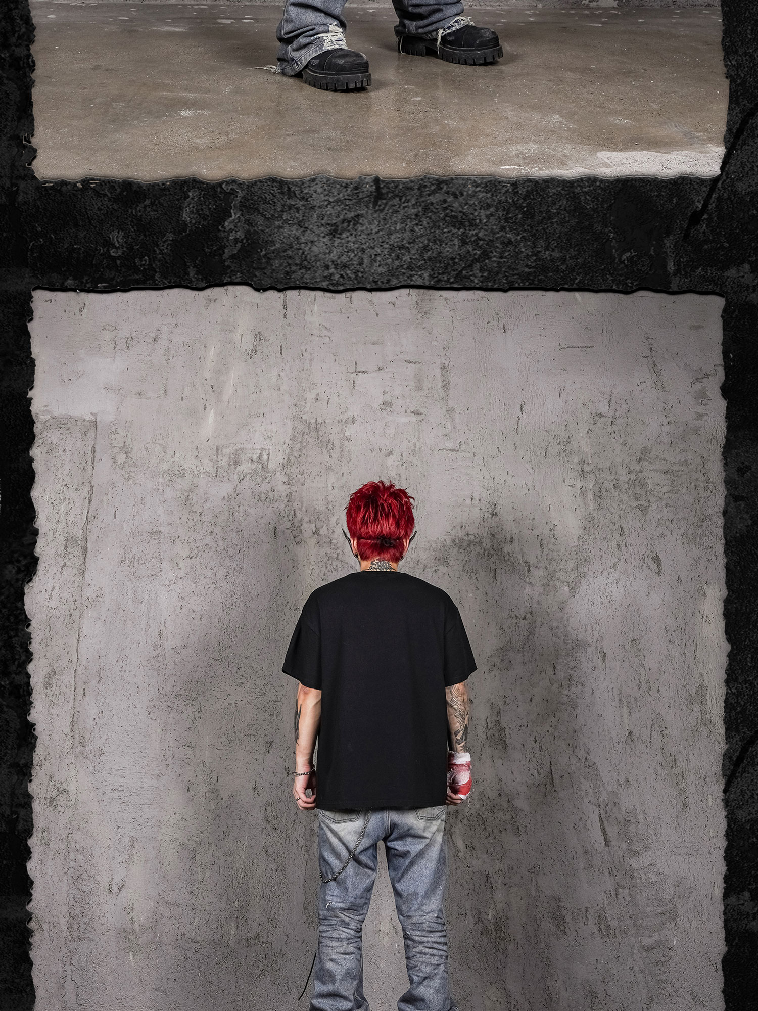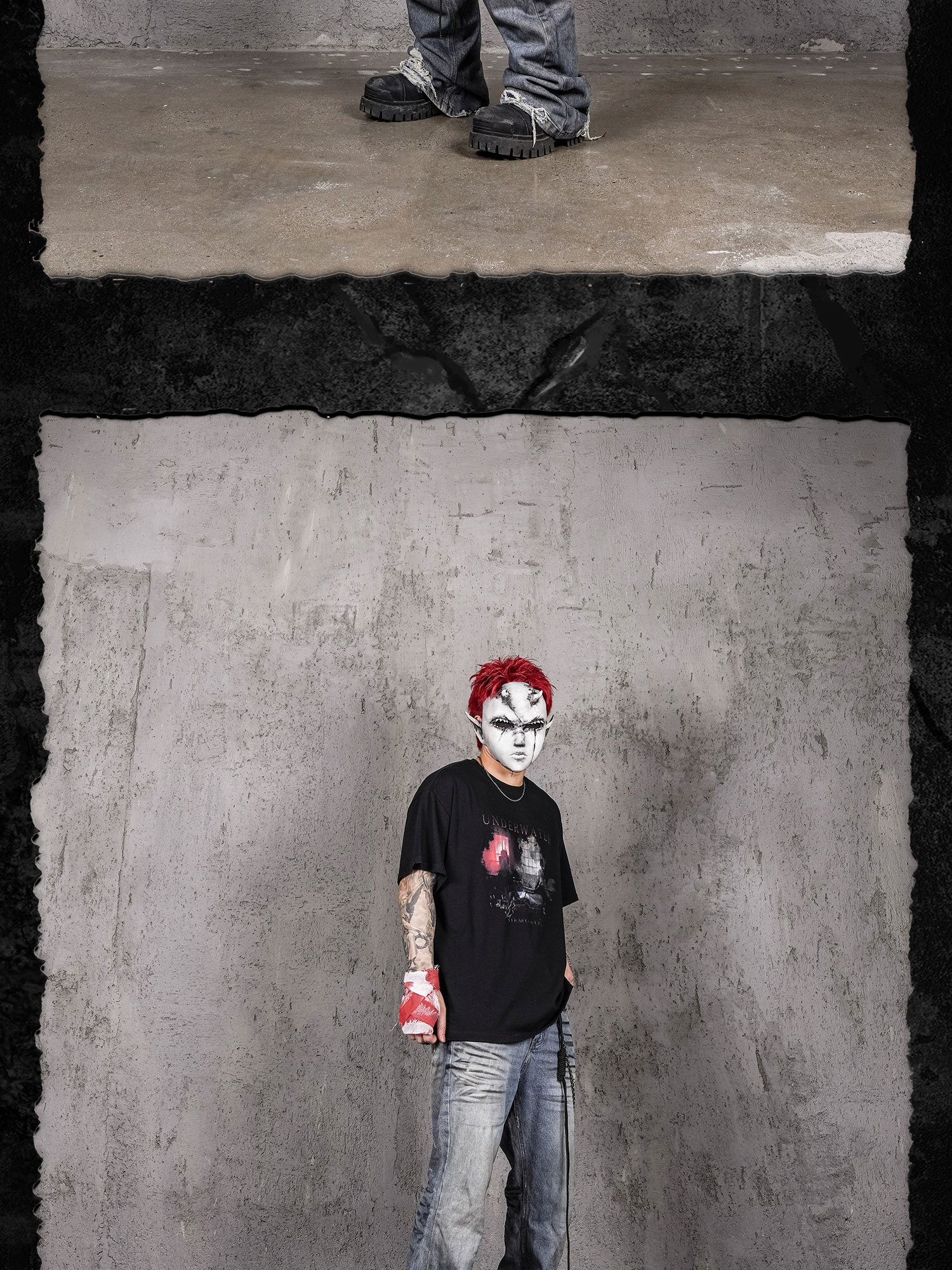 - This UW slim-fit tee is crafted from soft, skin-friendly cotton for both quality and comfort. It adopts the brand’s signature irregular hand-distressing, with frayed neckline edges and hole details that accentuate its raw aesthetic. The front graphic, printed using imported Kornit digital direct-injection technology, captures broken textures with precision. Taken from the brand’s original manga UNDERWATER, the artwork depicts a demonized boy engulfed in black mist, with a silent night framed beyond the window. Each time the eyes drift shut, it feels like entering a dark paradise where haunted whispers of the soul linger on both sides.