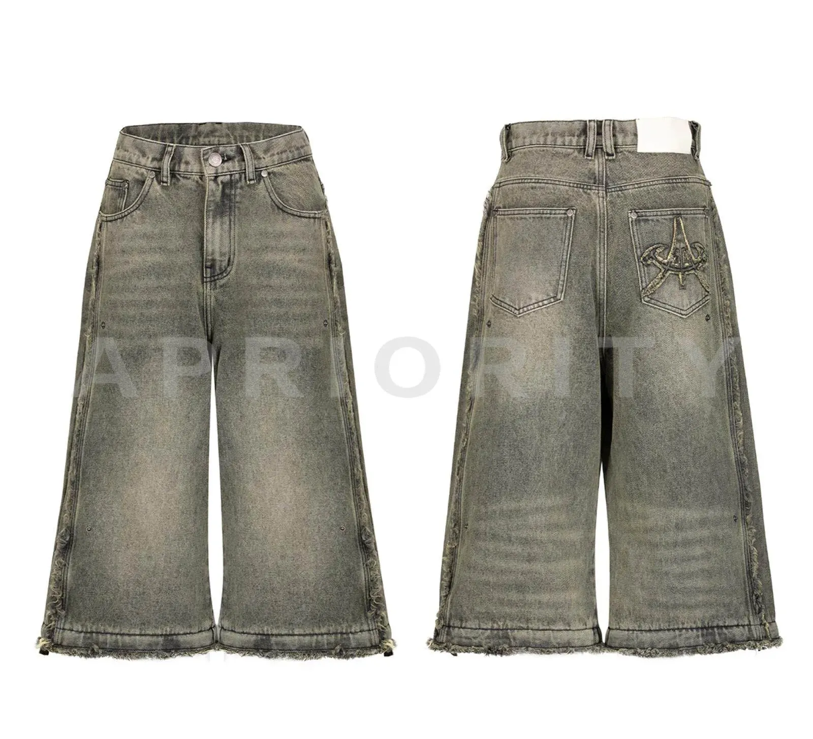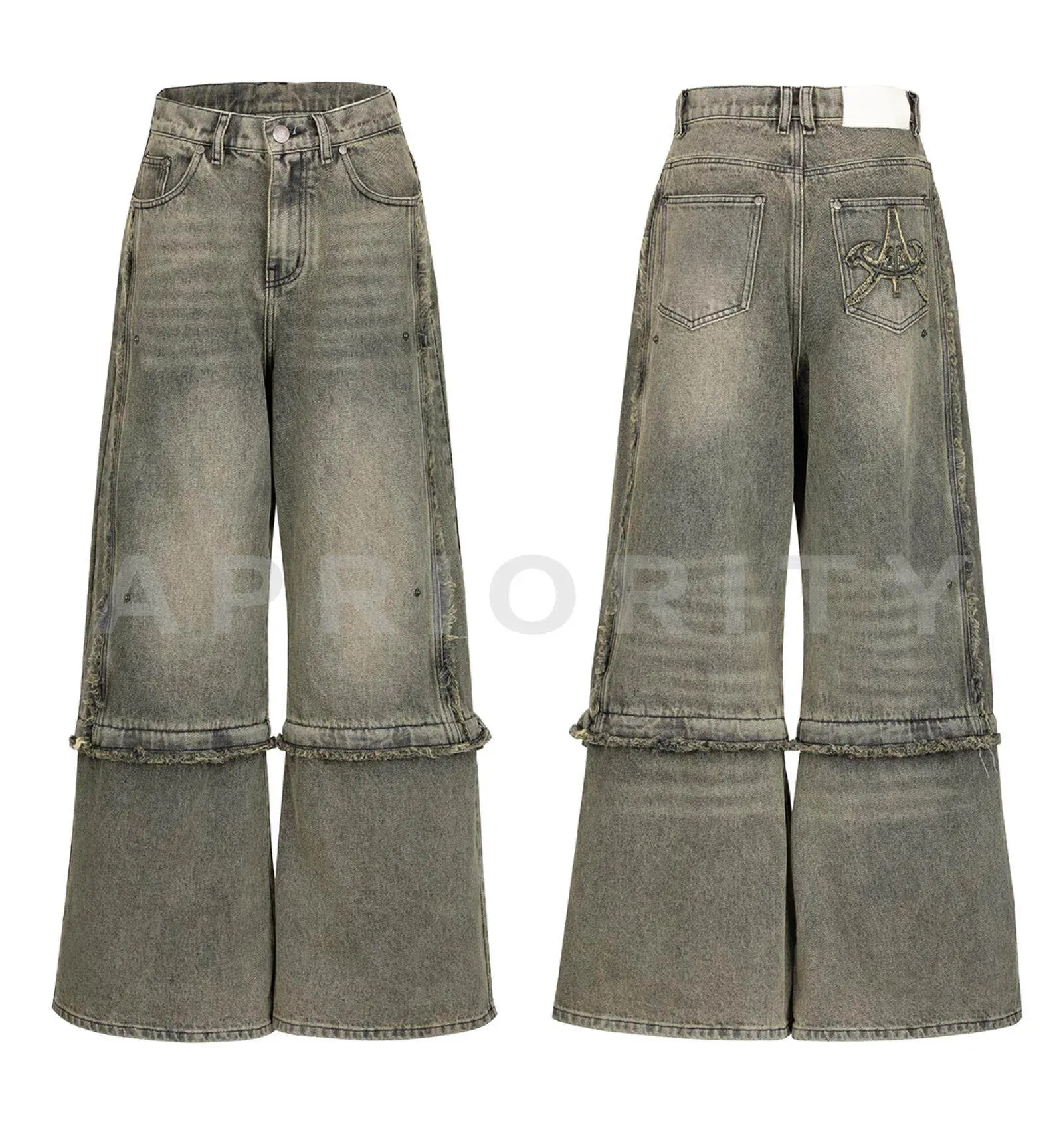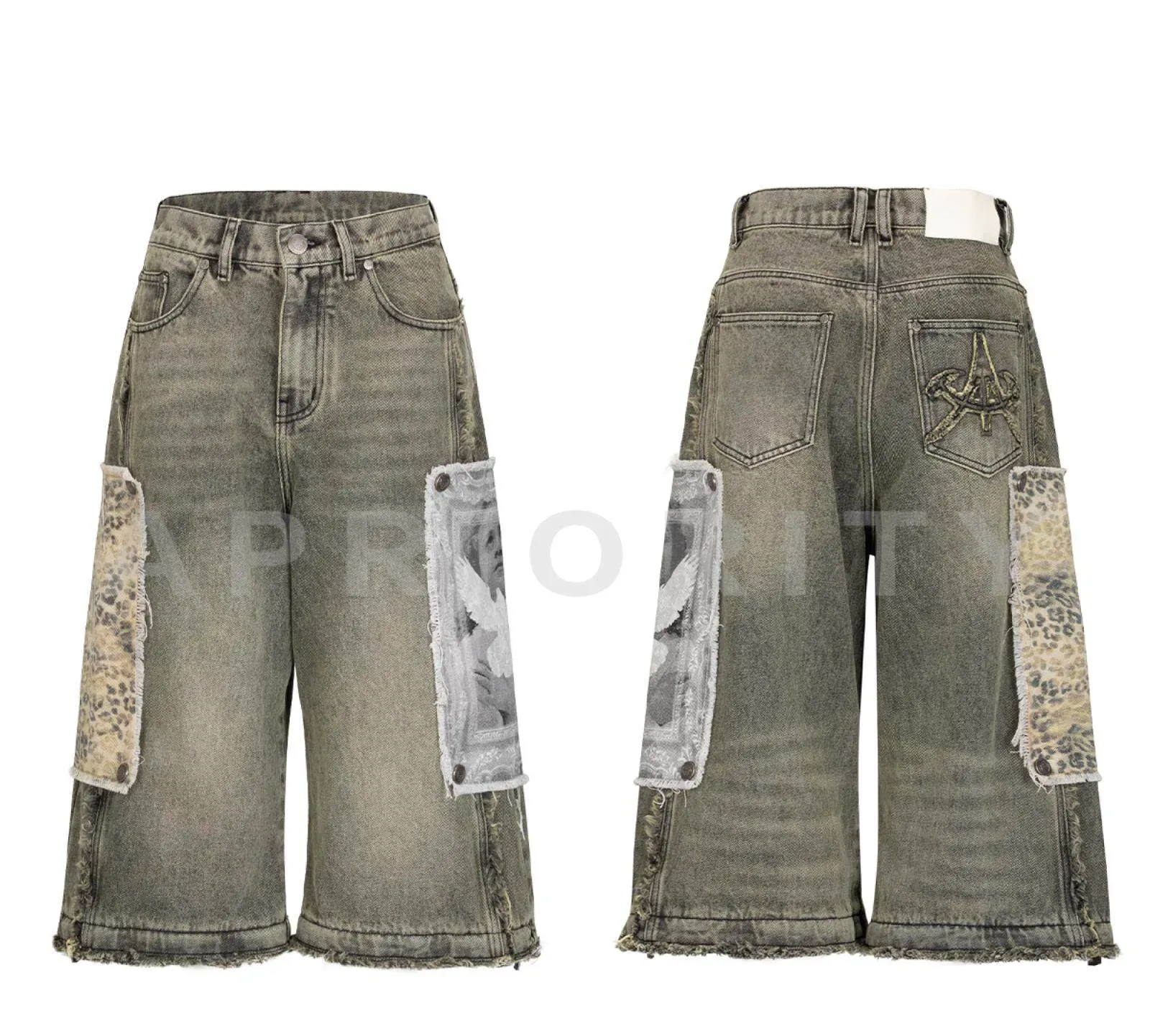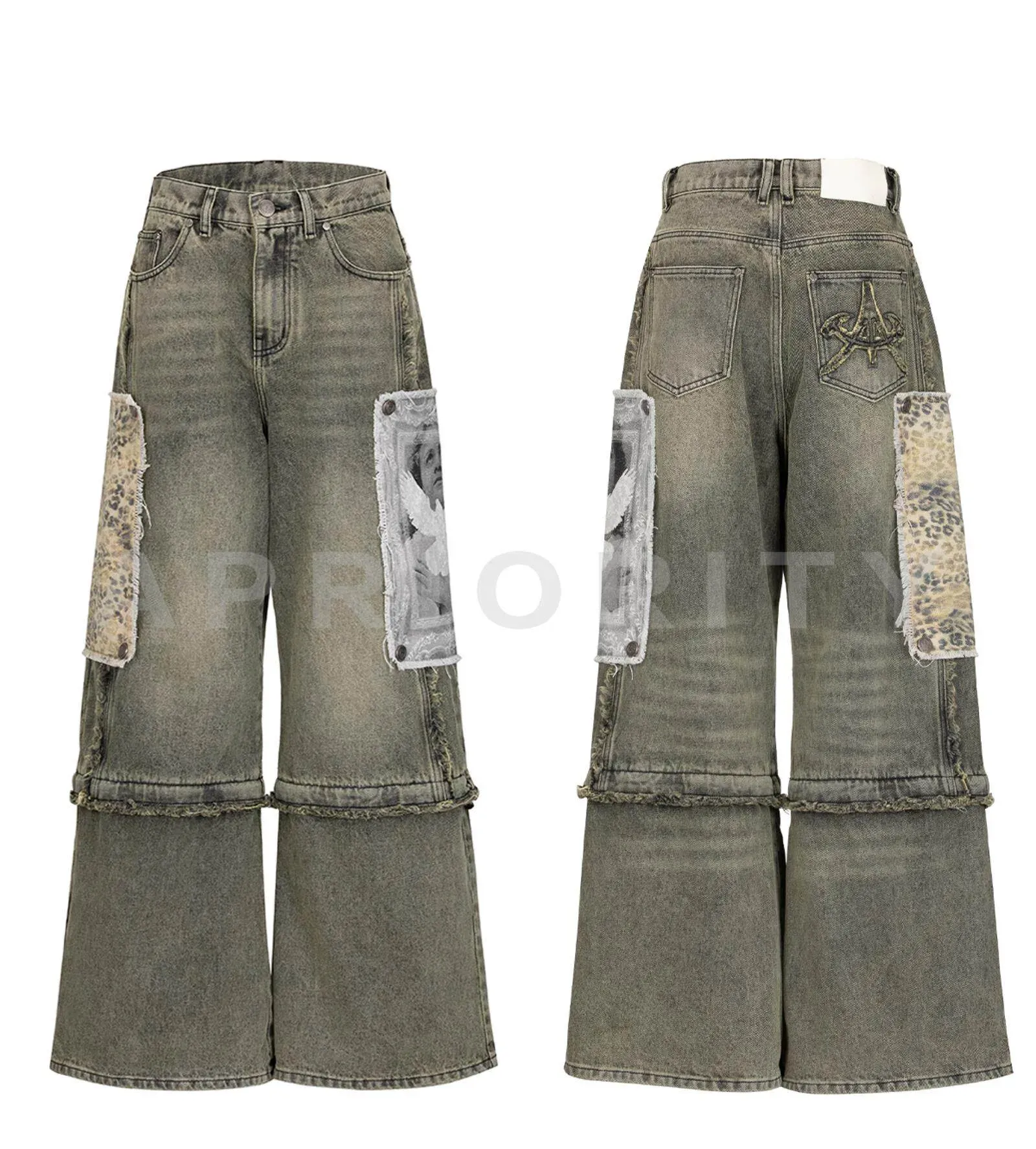 Design Details: YKK metal fly zipper; custom metal zipper pull; YKK snap button base. Detachable two-way design can be unzipped into shorts. Custom metal buttons at waistband. Leopard print patch; detachable decorative patch secured with 8 custom metal buttons. Custom genuine leather patch sewn at back waist. Washed raw-edge detailing at side seams and shorts hem. Printed patch graphic design. Monkey wash and whiskering techniques. Aged logo patch sewn on back pocket; pocket corners reinforced with custom metal rivets.