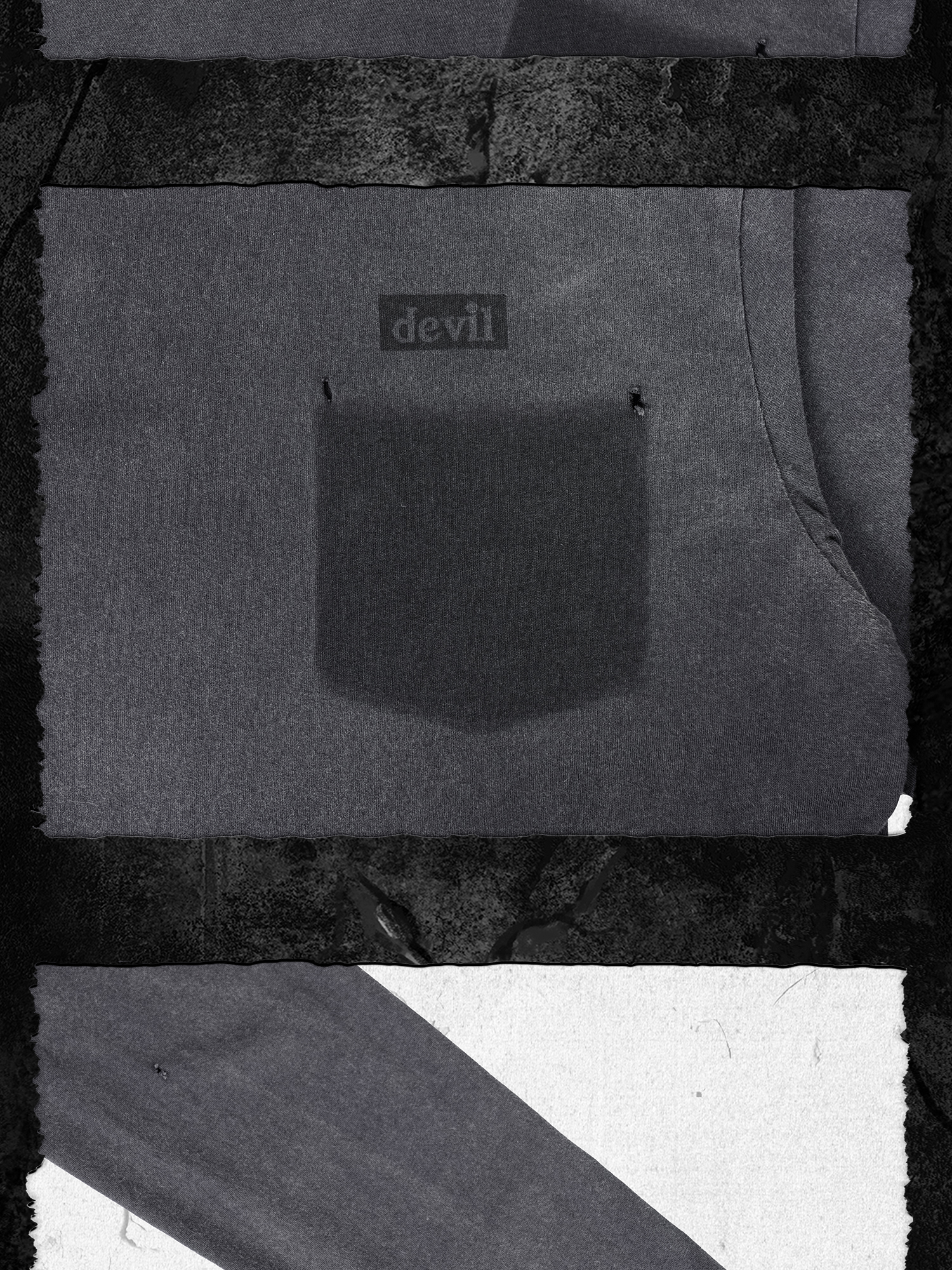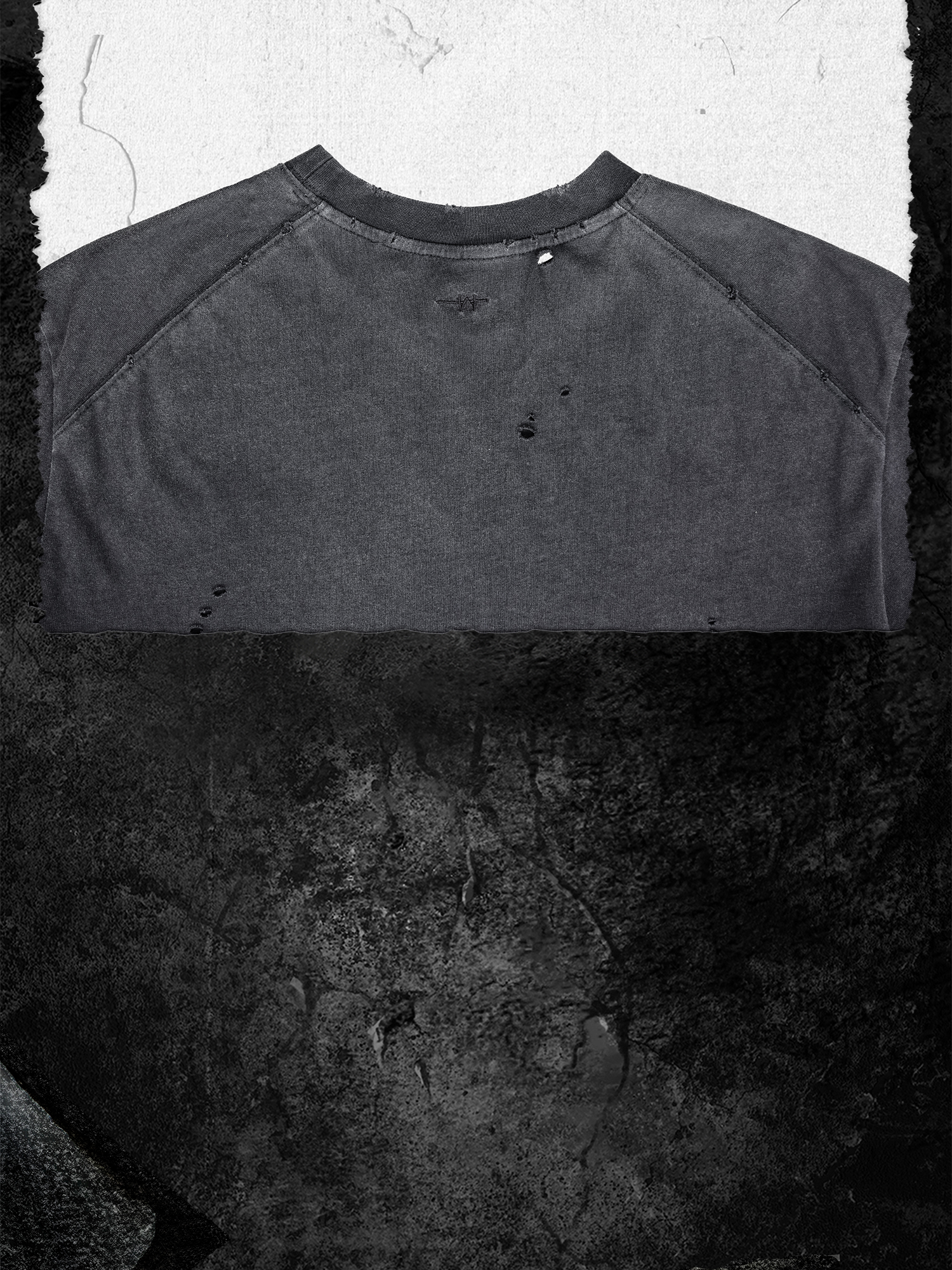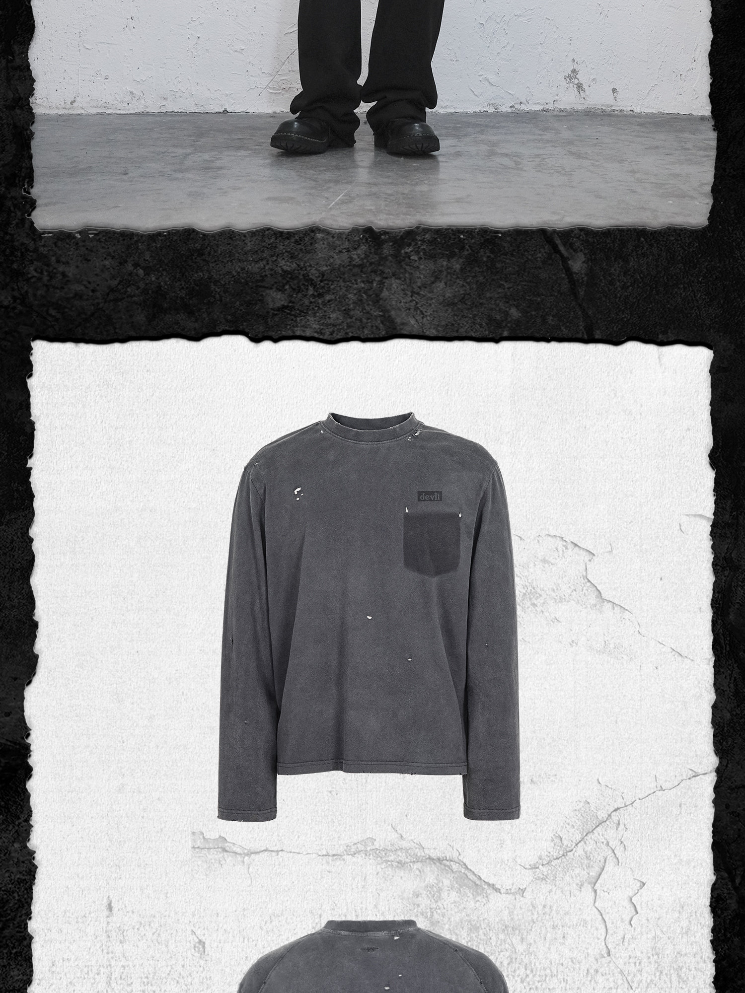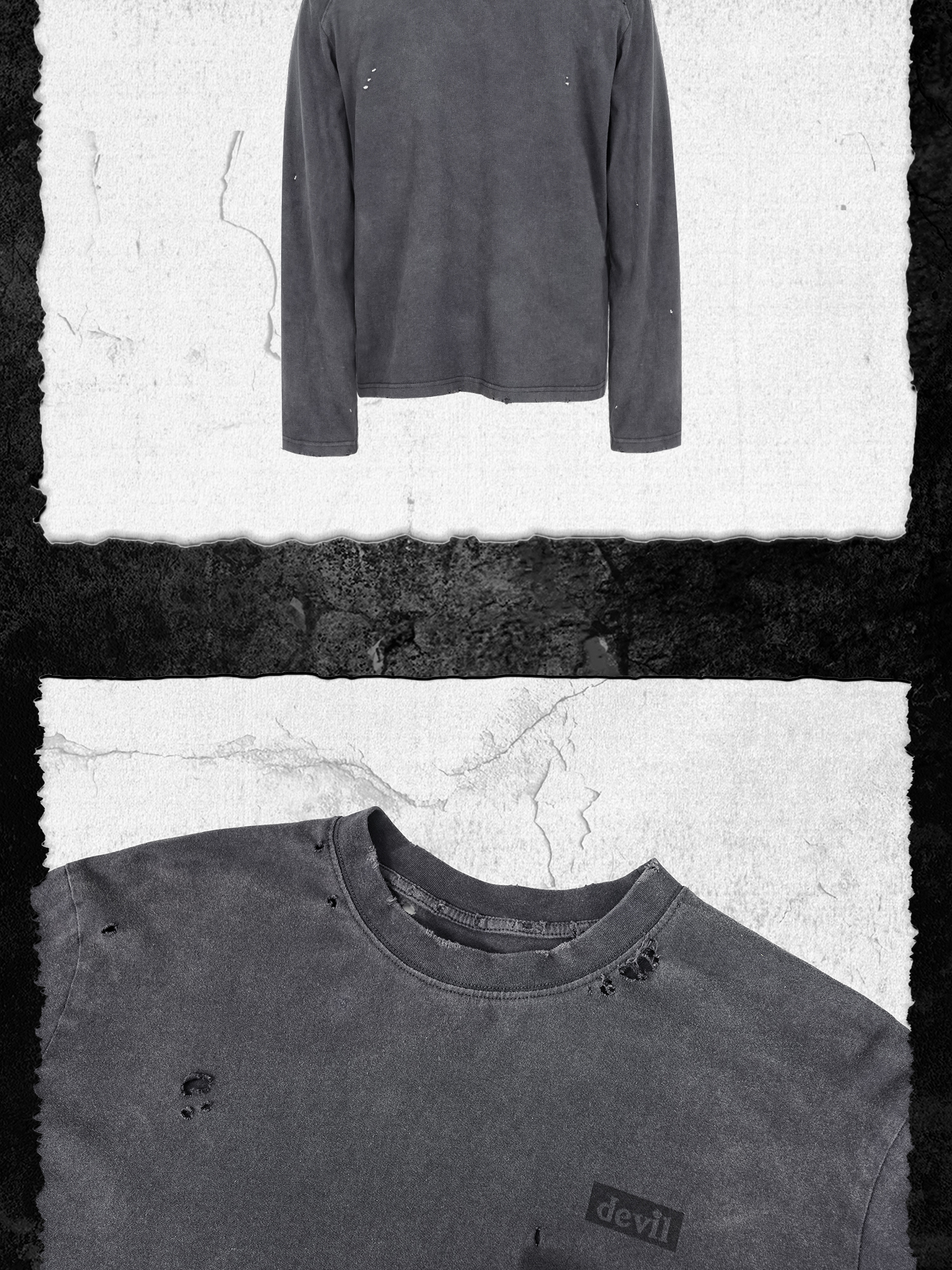 - This long sleeve features a UW fitted silhouette made from lightweight, soft cotton for a comfortable, skin-friendly feel.The devil chest graphic is produced using Conli digital direct injection, appearing like a whispering shadow beneath the skin. Industrial washing and monkey-spray techniques naturally form a ghosted chest-pocket imprint, resembling a searing brand against the torso. Irregular hand-applied destruction and slash marks cover the garment—each crack a trace of conflict, balancing softness with defiance.