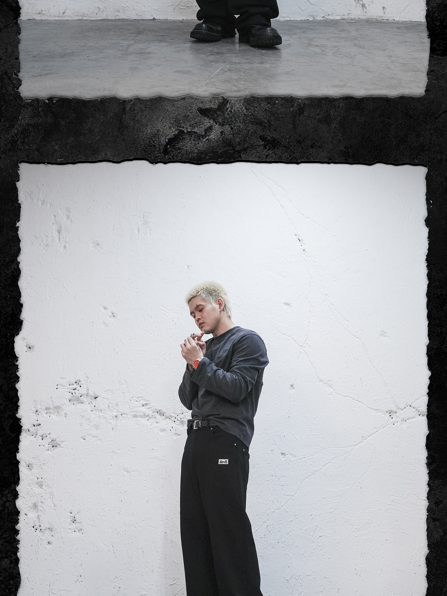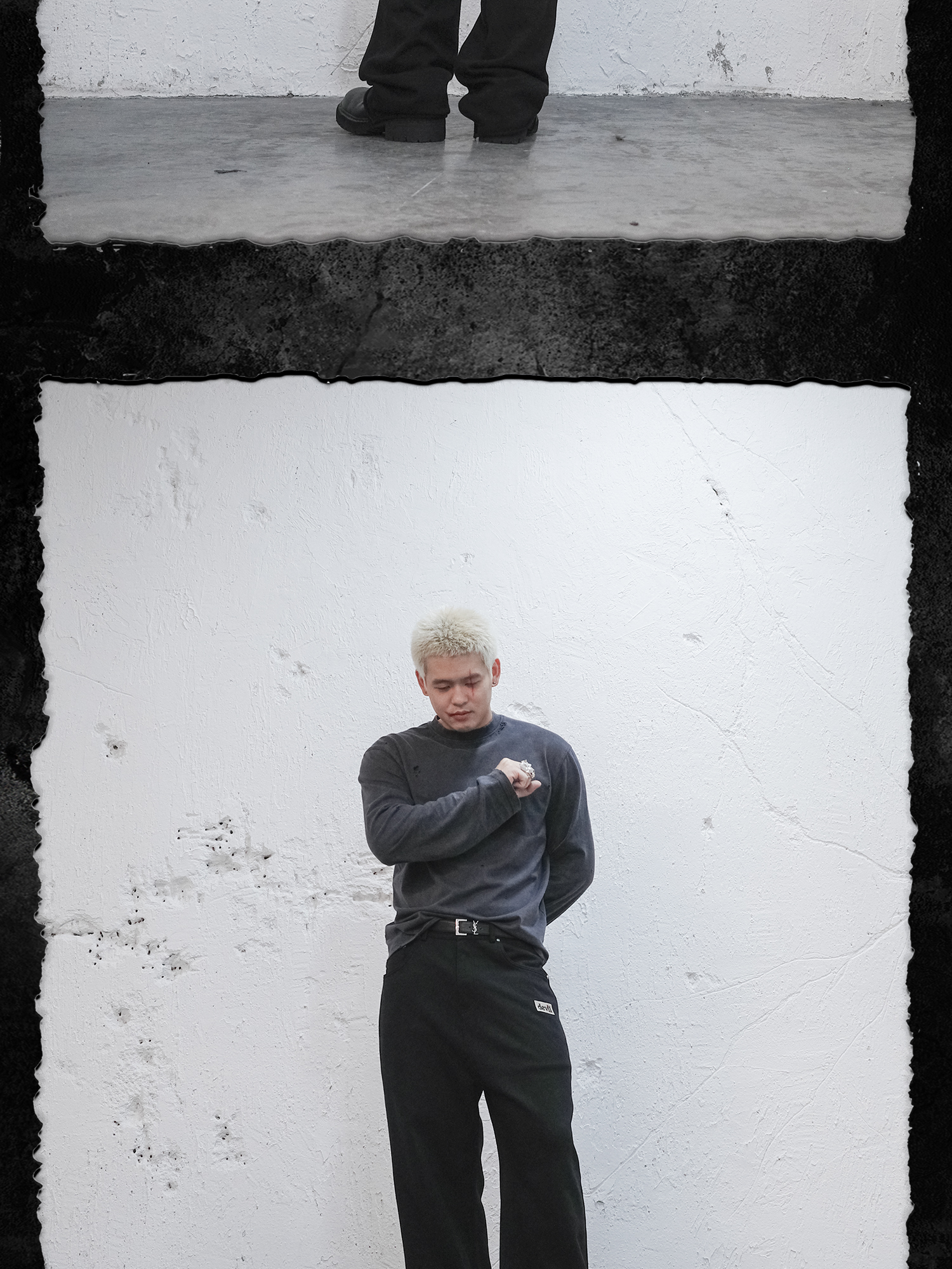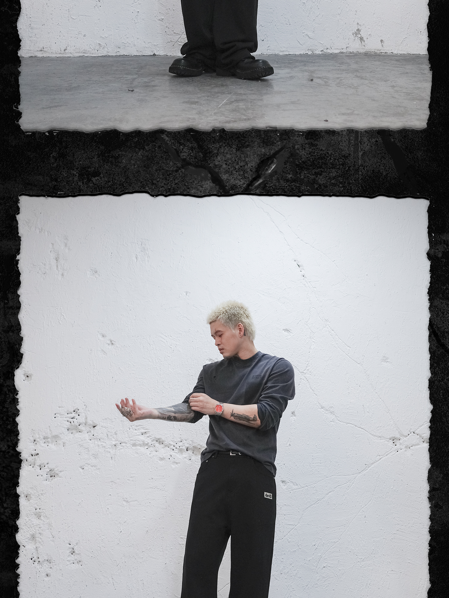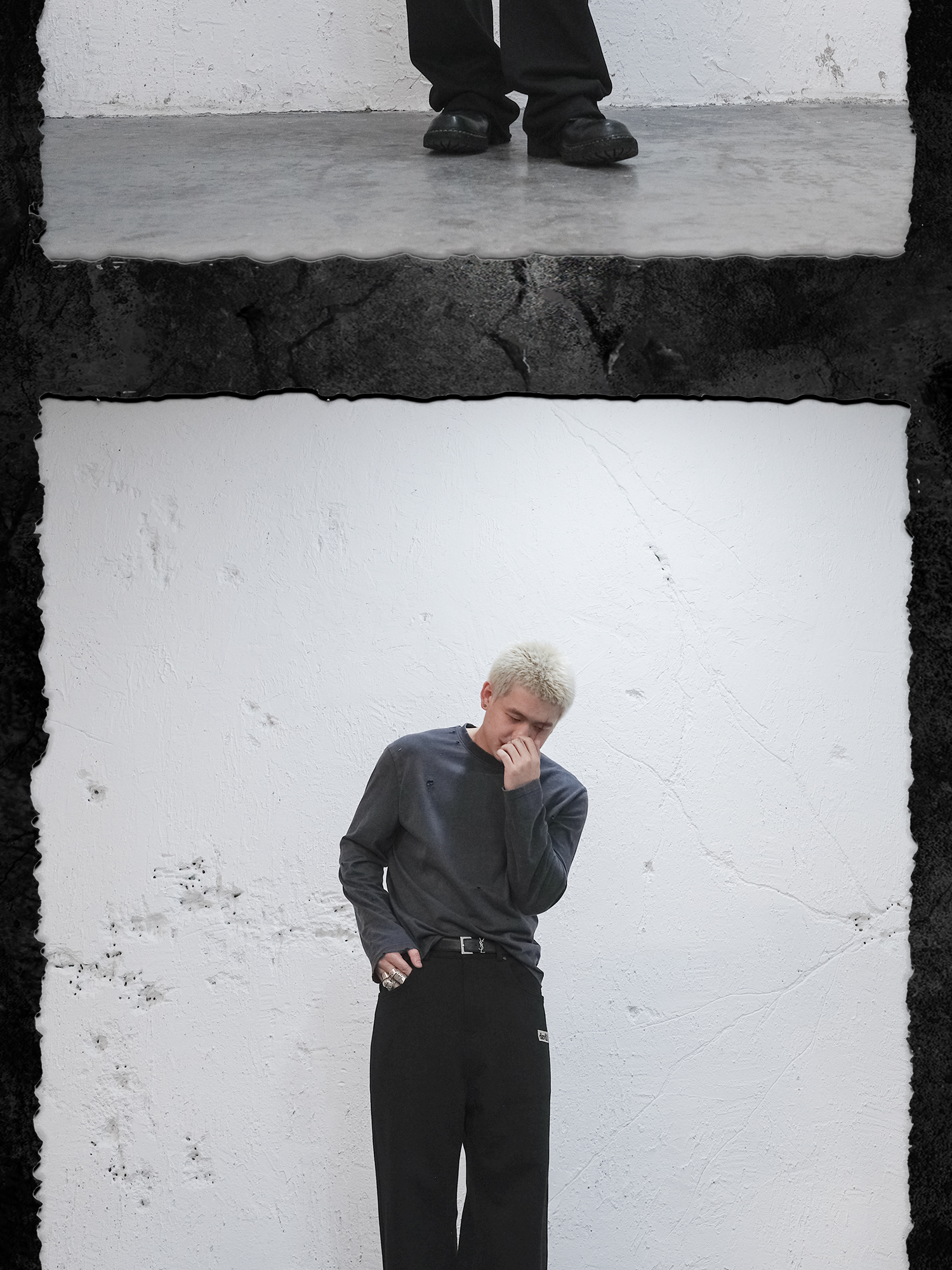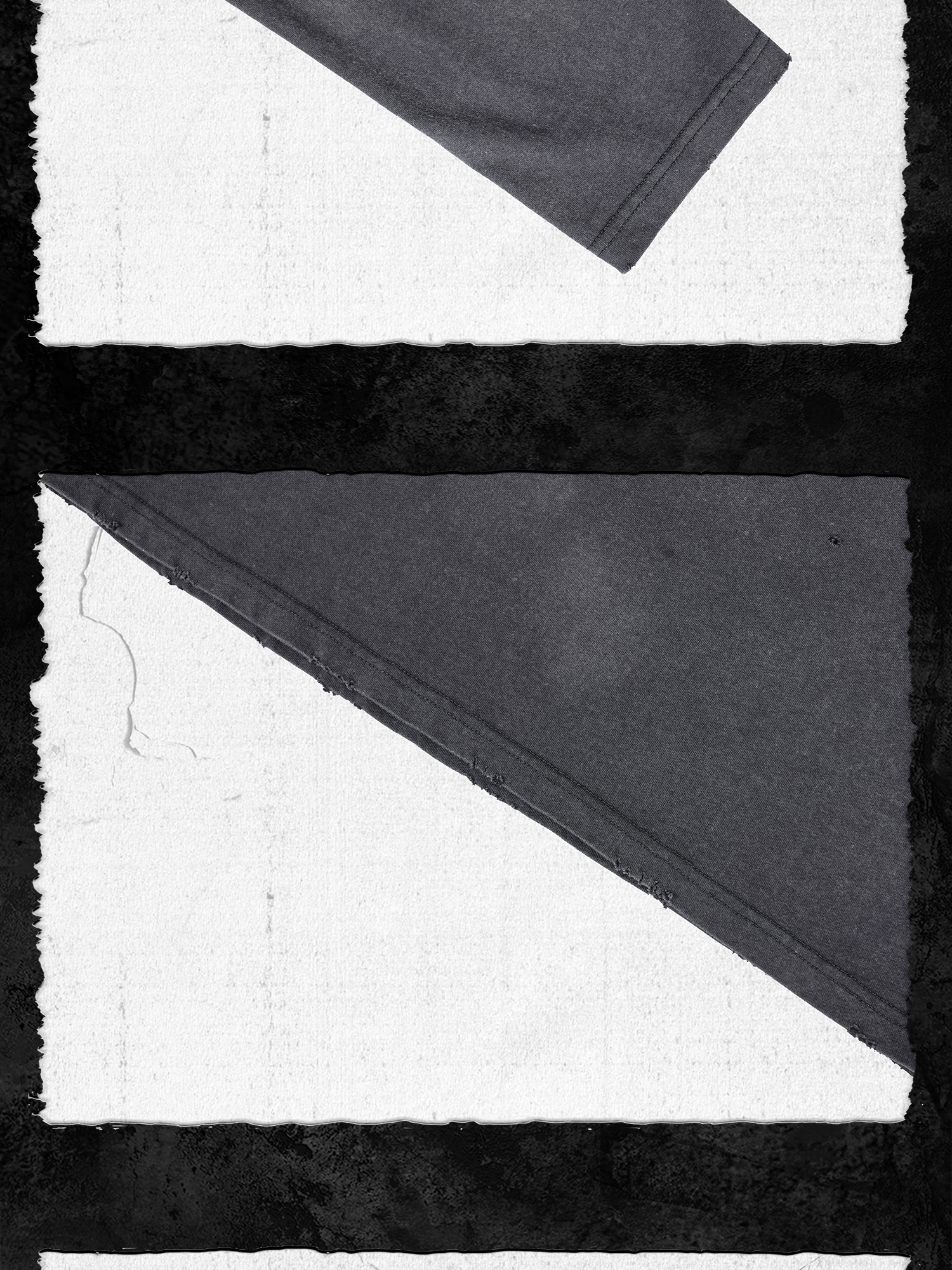 - This long sleeve features a UW fitted silhouette made from lightweight, soft cotton for a comfortable, skin-friendly feel.The devil chest graphic is produced using Conli digital direct injection, appearing like a whispering shadow beneath the skin. Industrial washing and monkey-spray techniques naturally form a ghosted chest-pocket imprint, resembling a searing brand against the torso. Irregular hand-applied destruction and slash marks cover the garment—each crack a trace of conflict, balancing softness with defiance.
