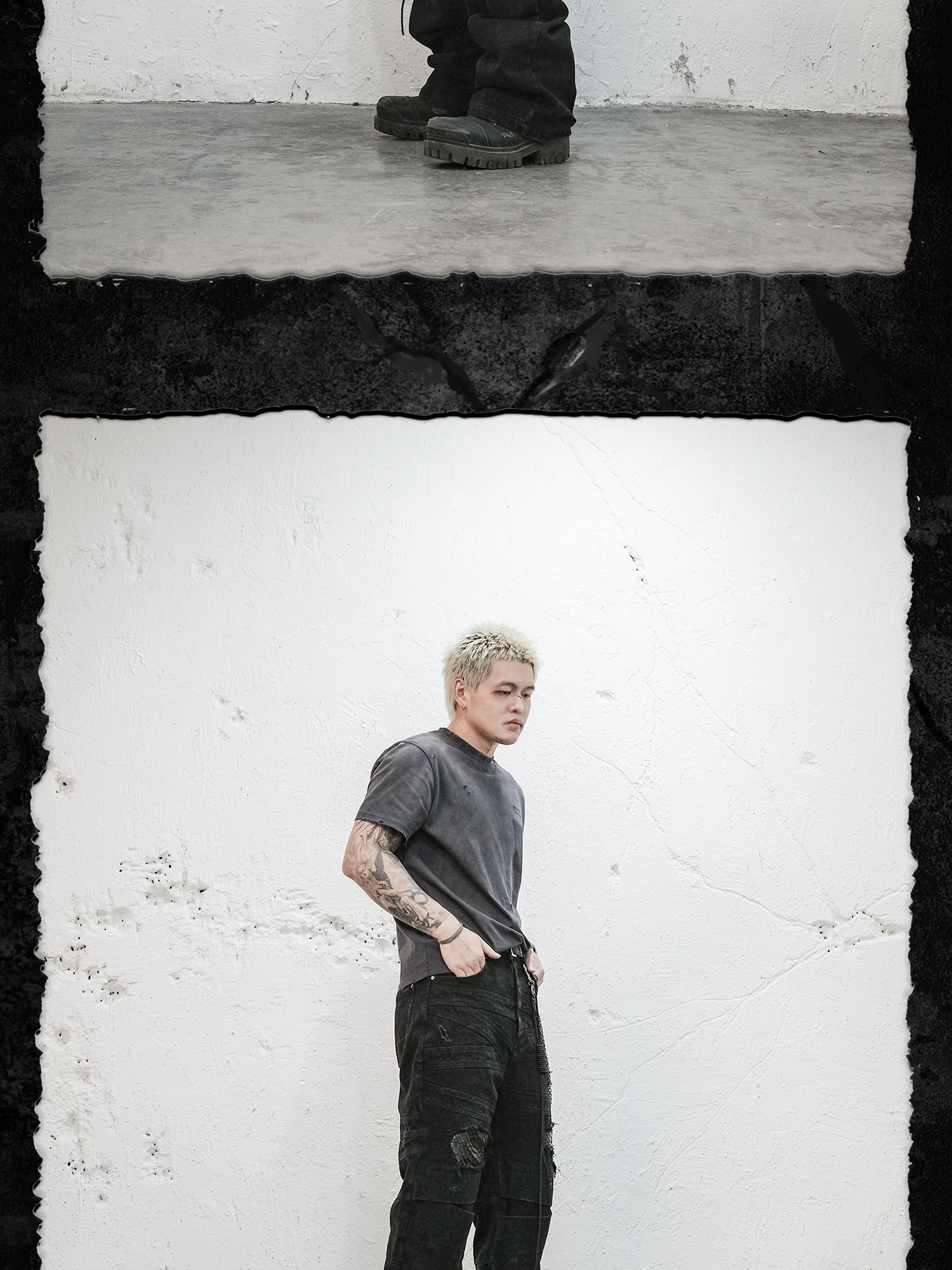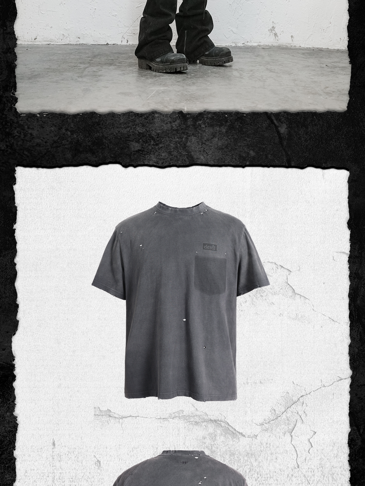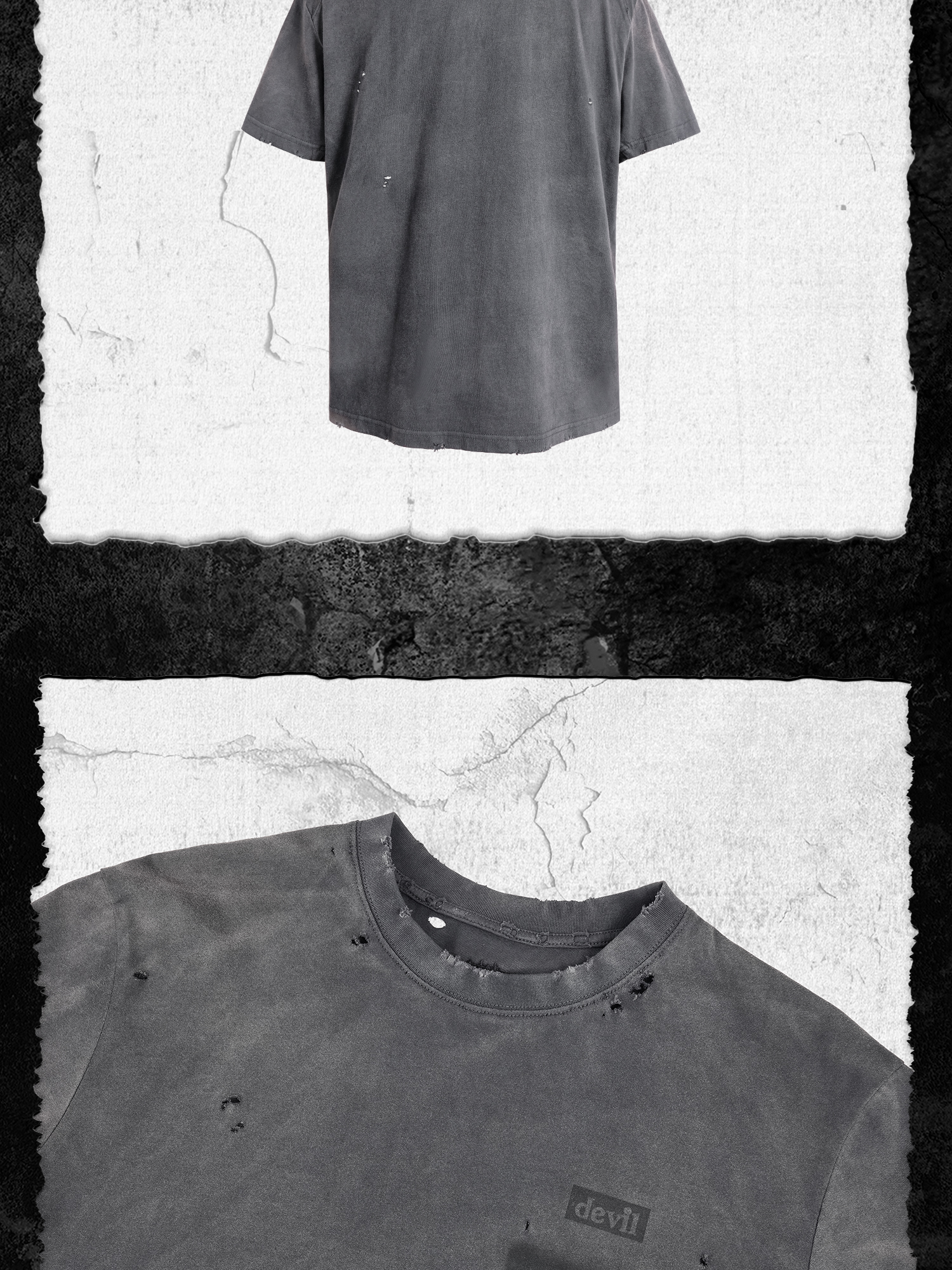 - UW slim fit silhouette crafted from lightweight, skin-friendly pure cotton fabric. The chest features a “devil” print applied with Kornit digital direct injection, resembling a dark whisper beneath the skin. The garment undergoes washing and monkey enzyme treatment, leaving a naturally faded chest pocket imprint like a searing brand welded into the flesh, symbolizing an unbreakable covenant. Irregular hand-made distressing and knife-cut marks across the fabric serve as scars of battle—each rip revealing a rebellious soul. The overall piece feels like a rebirth from ruins, balancing softness with sharpness, everyday wear with defiance.