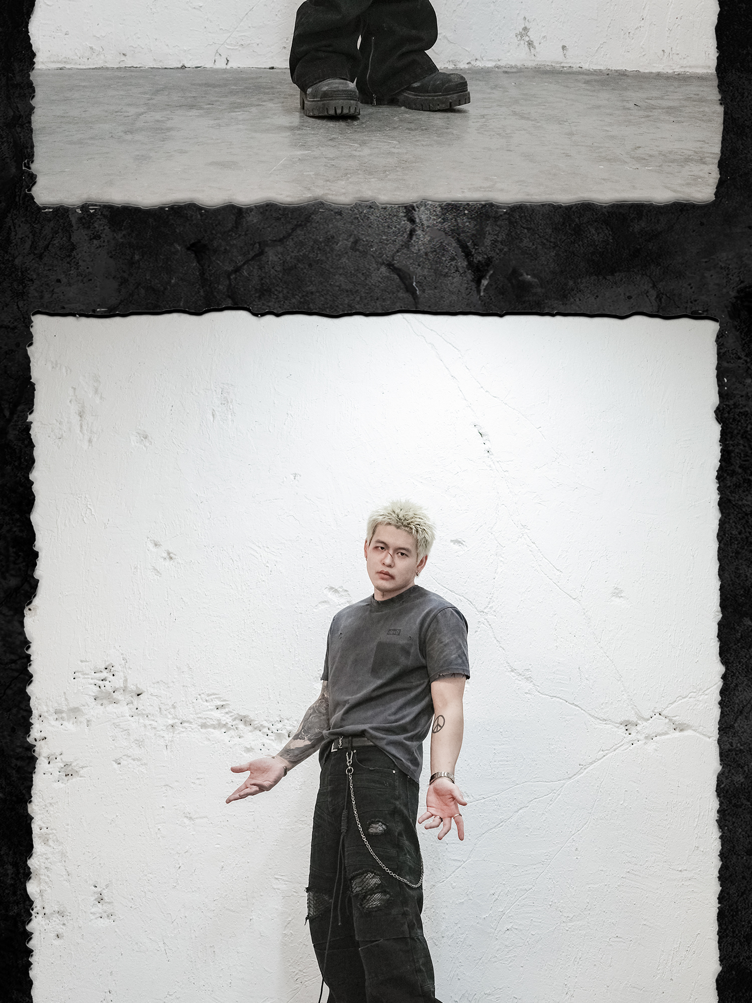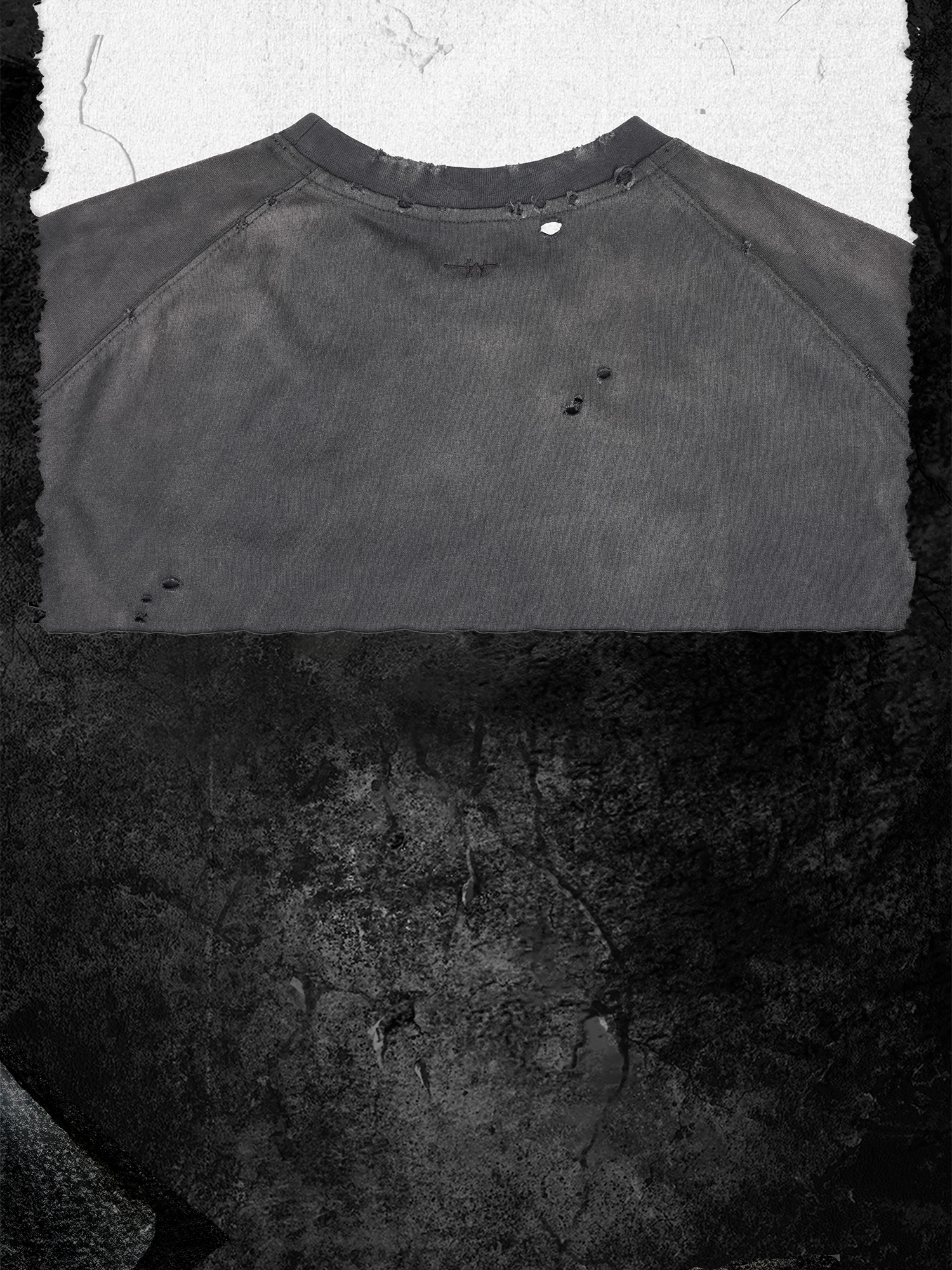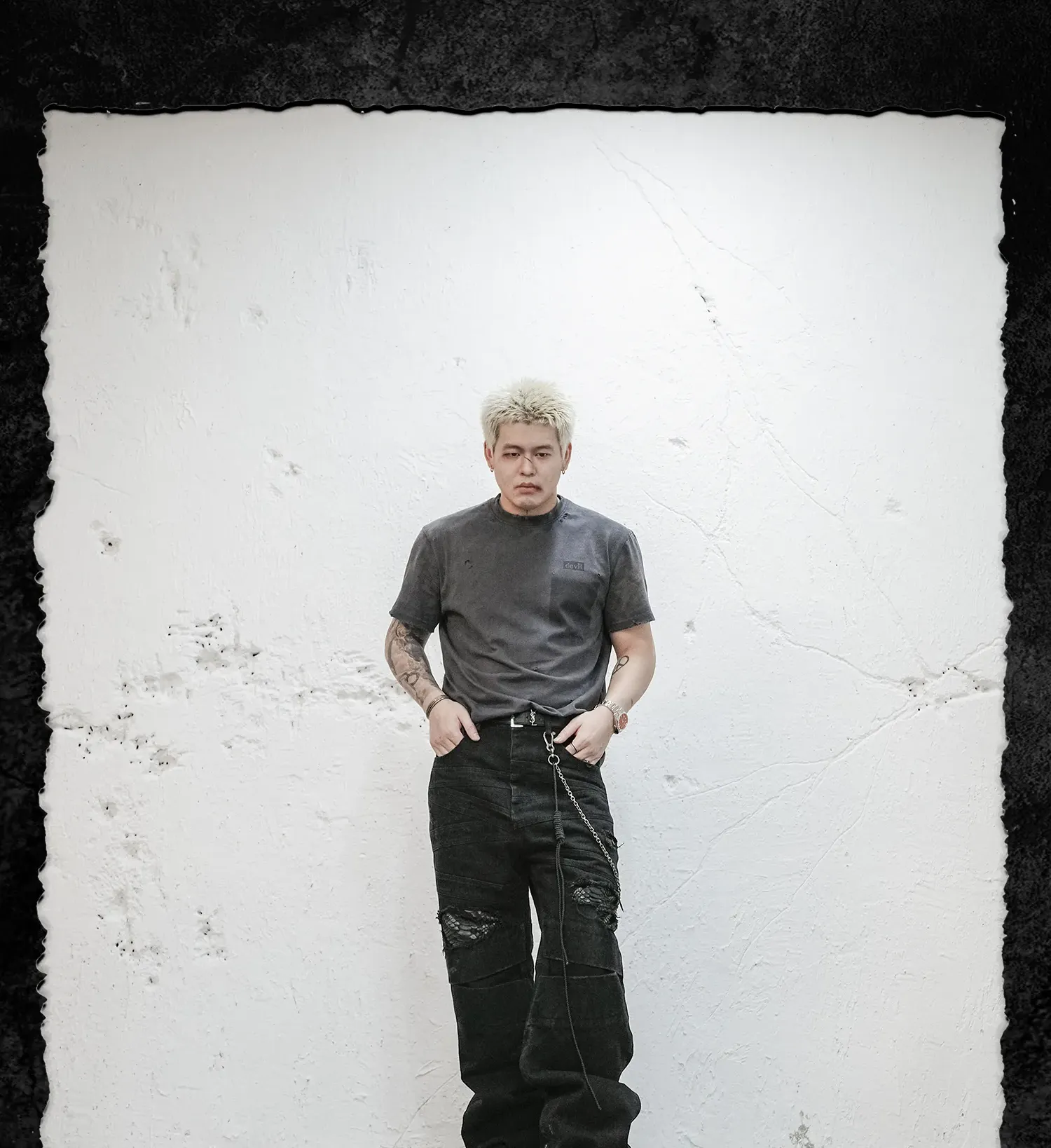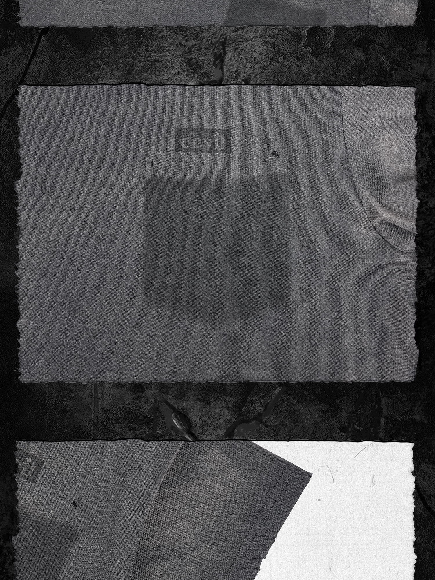 - UW slim fit silhouette crafted from lightweight, skin-friendly pure cotton fabric. The chest features a “devil” print applied with Kornit digital direct injection, resembling a dark whisper beneath the skin. The garment undergoes washing and monkey enzyme treatment, leaving a naturally faded chest pocket imprint like a searing brand welded into the flesh, symbolizing an unbreakable covenant. Irregular hand-made distressing and knife-cut marks across the fabric serve as scars of battle—each rip revealing a rebellious soul. The overall piece feels like a rebirth from ruins, balancing softness with sharpness, everyday wear with defiance.