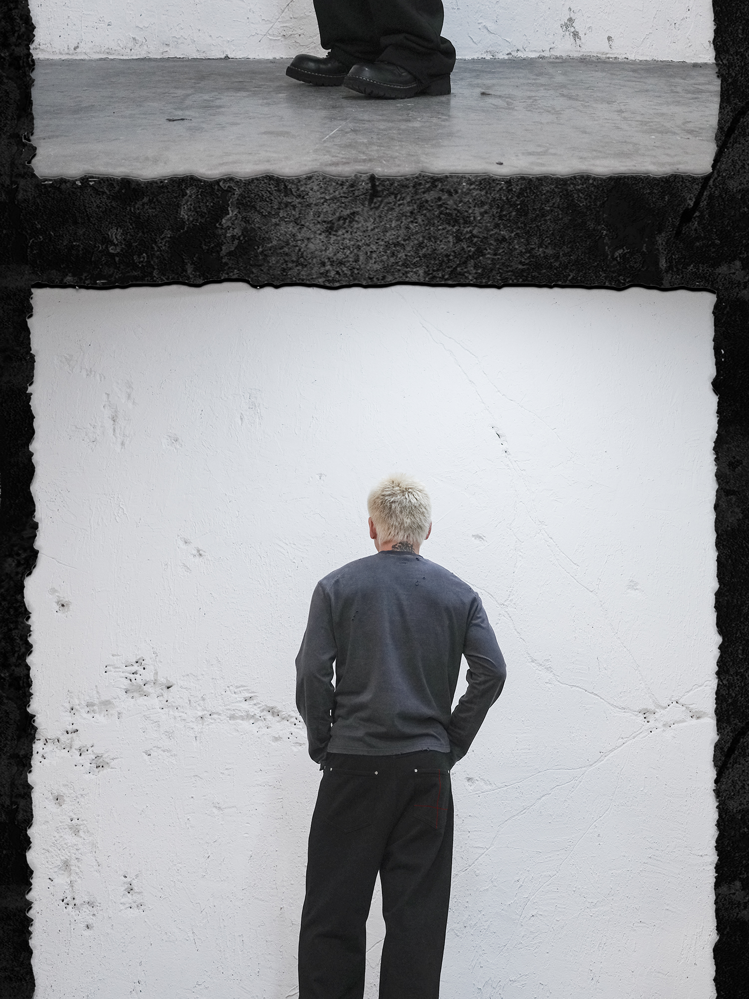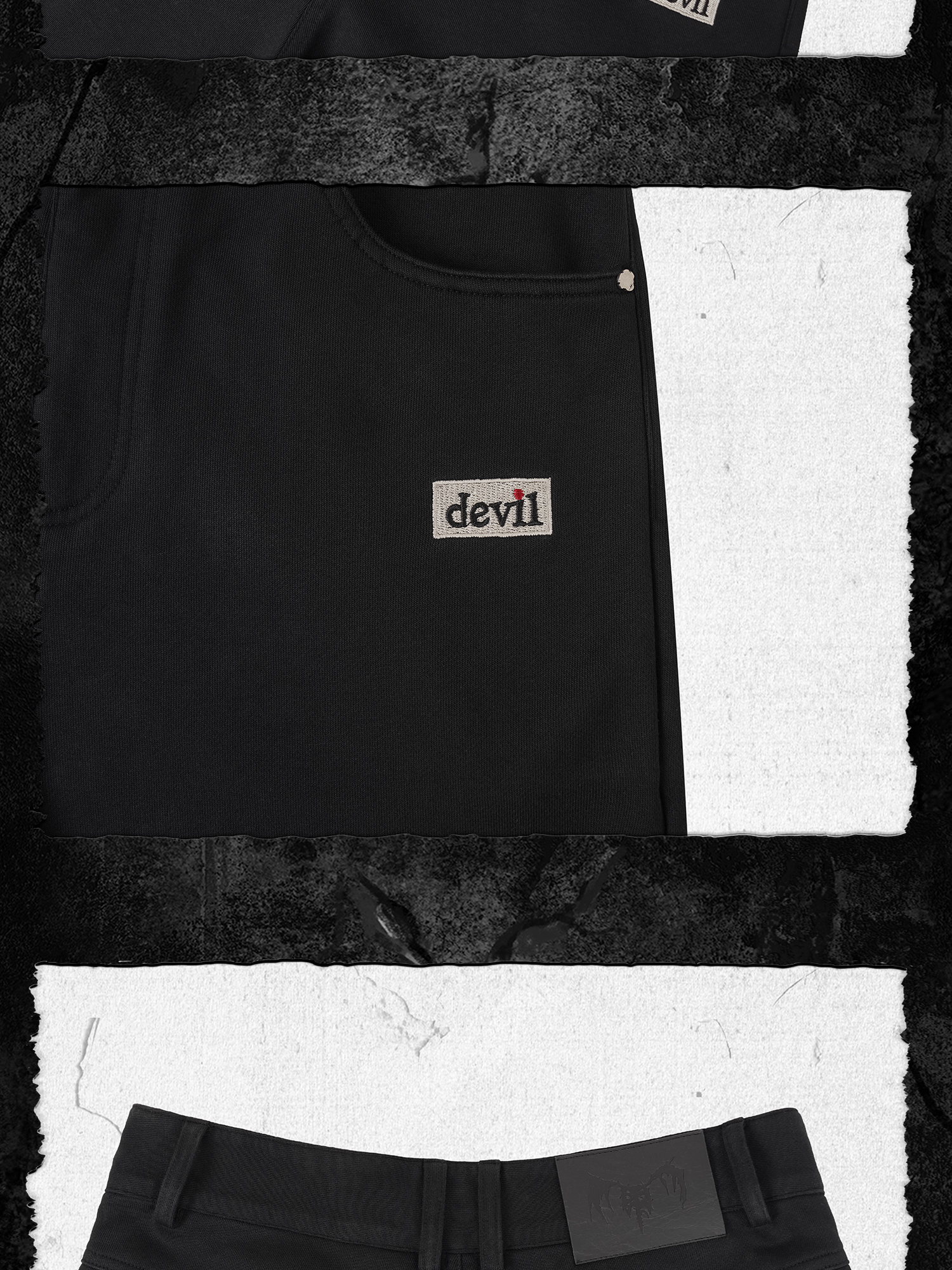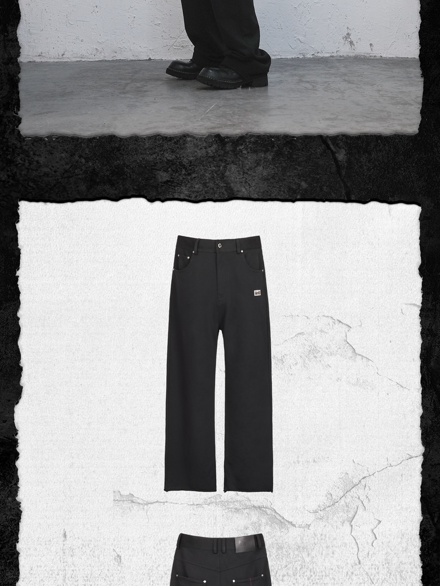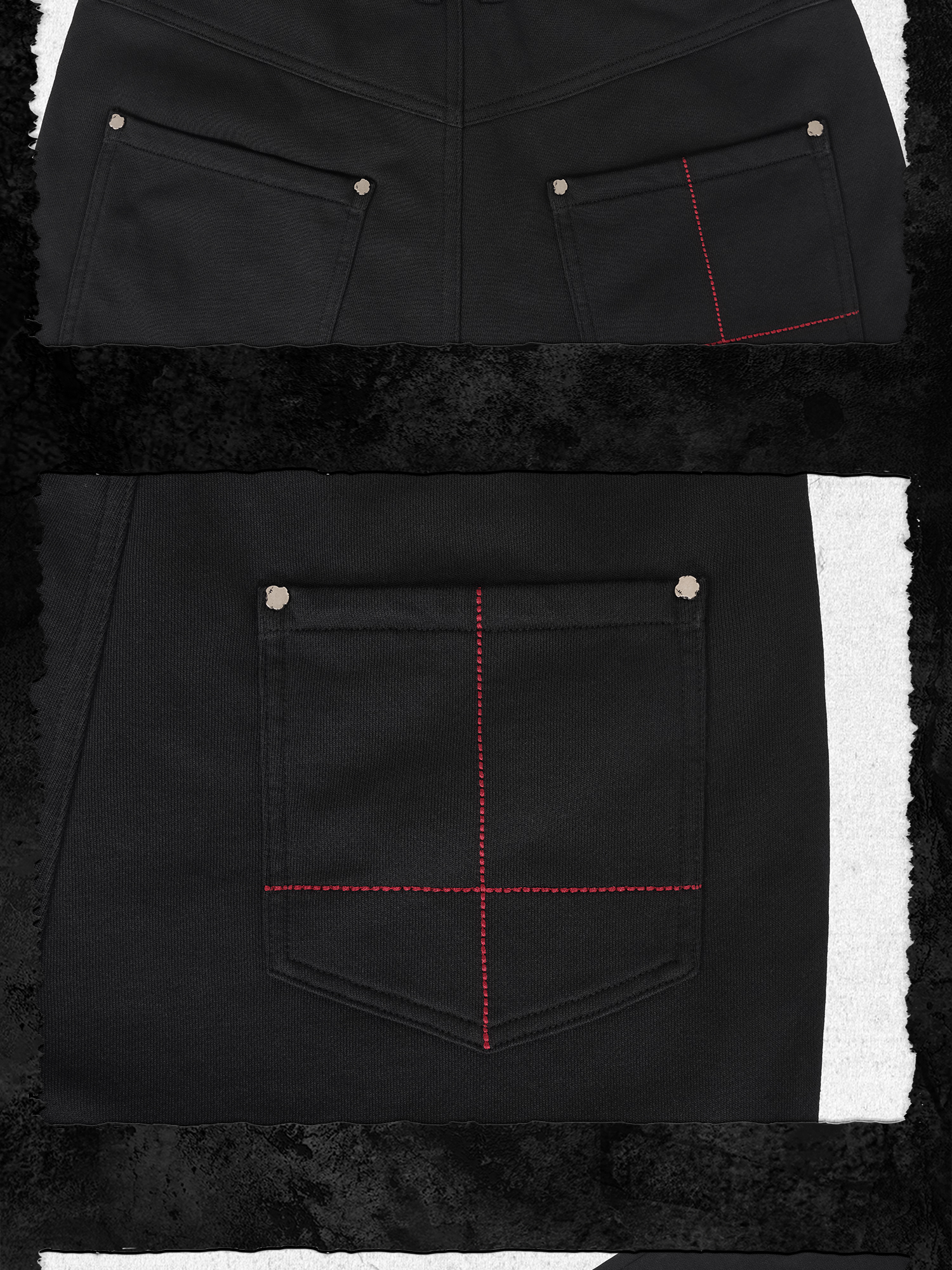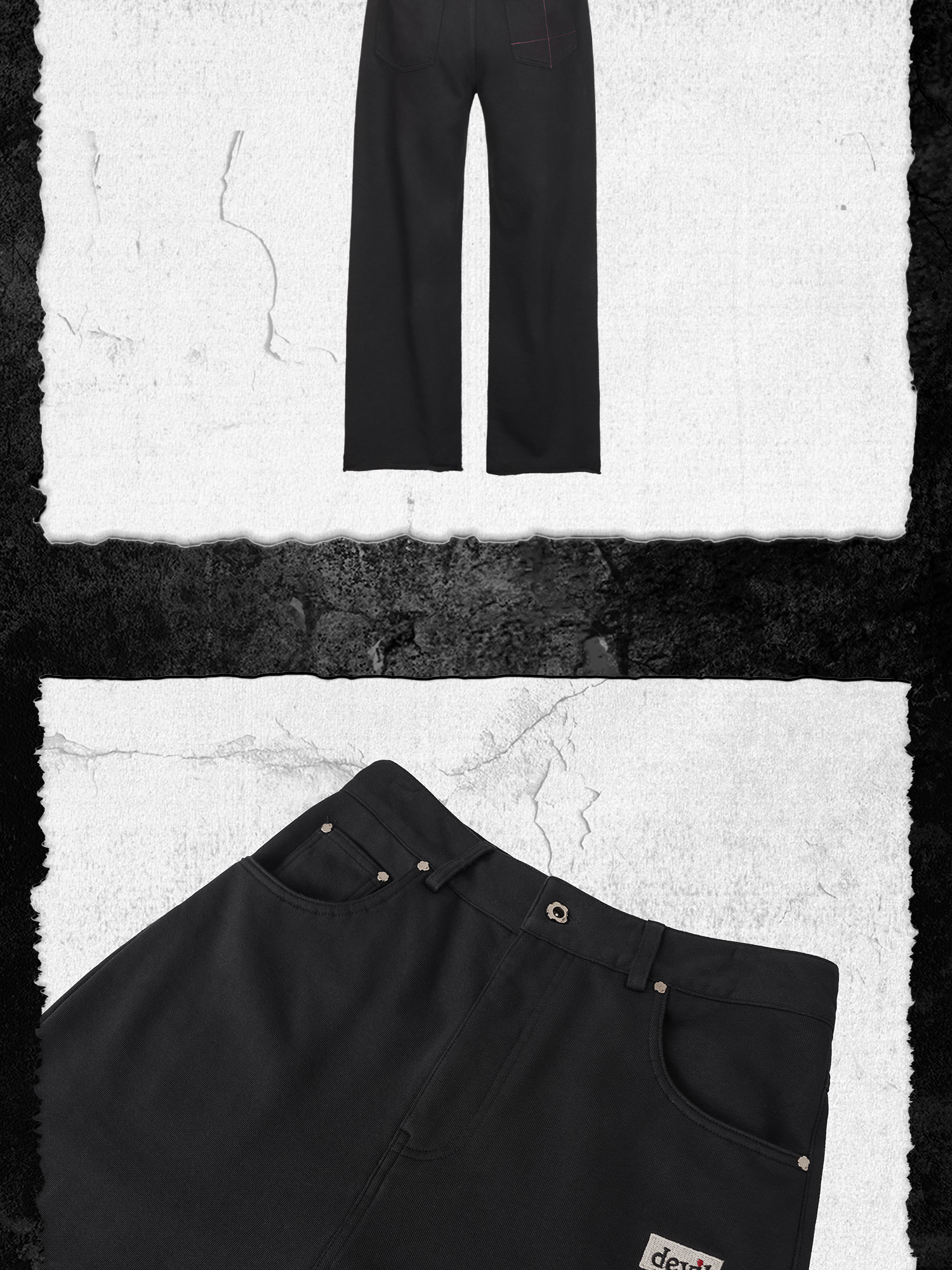 - UW slim straight fit crafted from brushed fleece that mimics the firm structure of denim. The silhouette retains the sharp lines of classic jeans while keeping the softness and ease unique to sweatpants. A red inverted-cross micro-embroidery on the back pocket strikes like a silent blood mark, awakening a darker faith. The raw-cut hems naturally curl, echoing traces of a battlefield that continues to stretch forward in defiance.