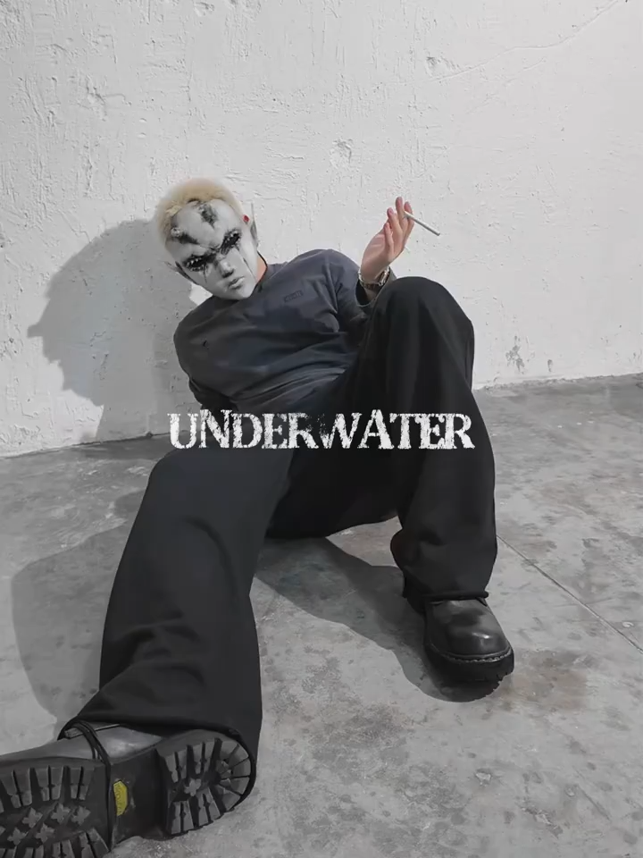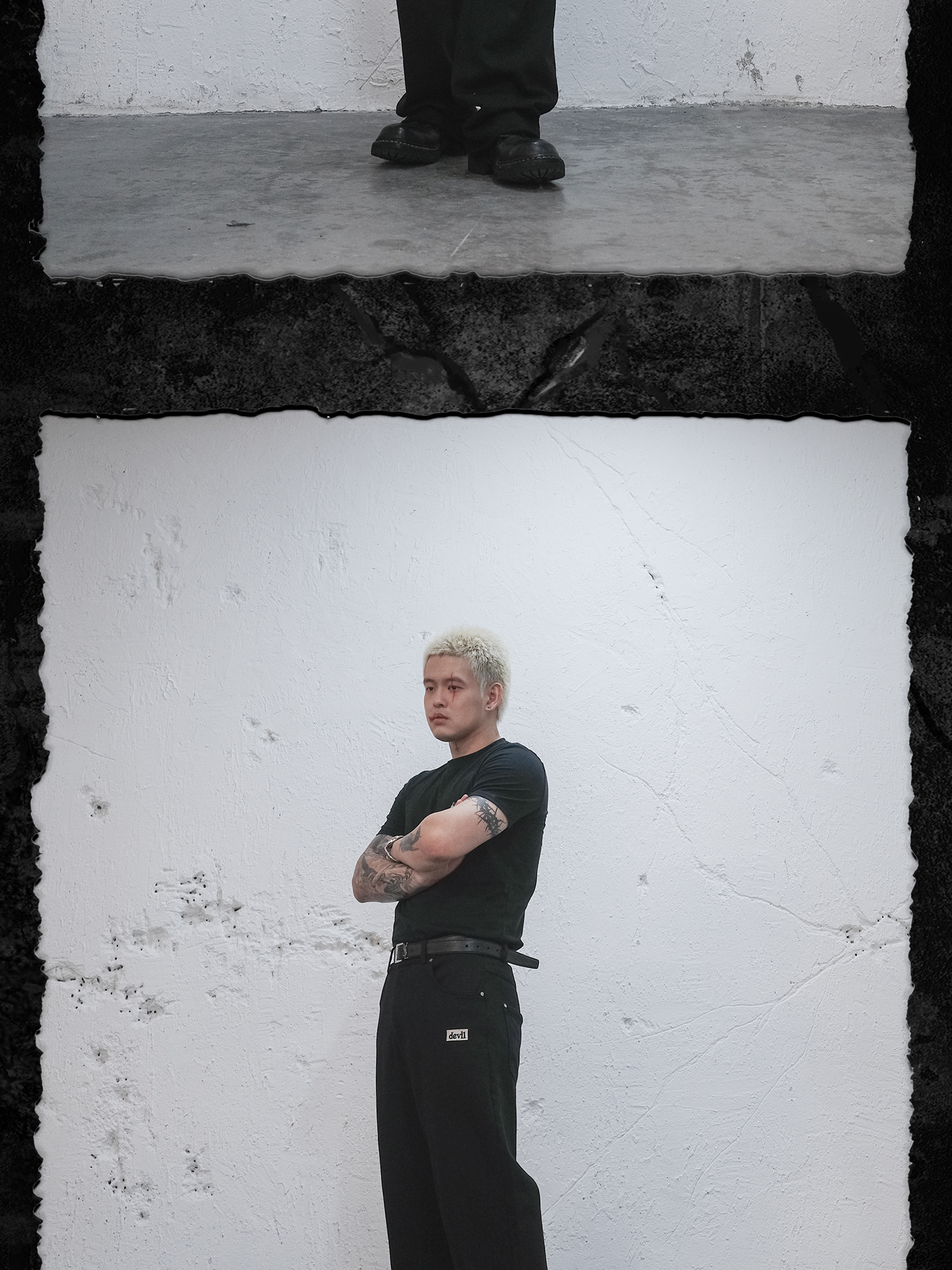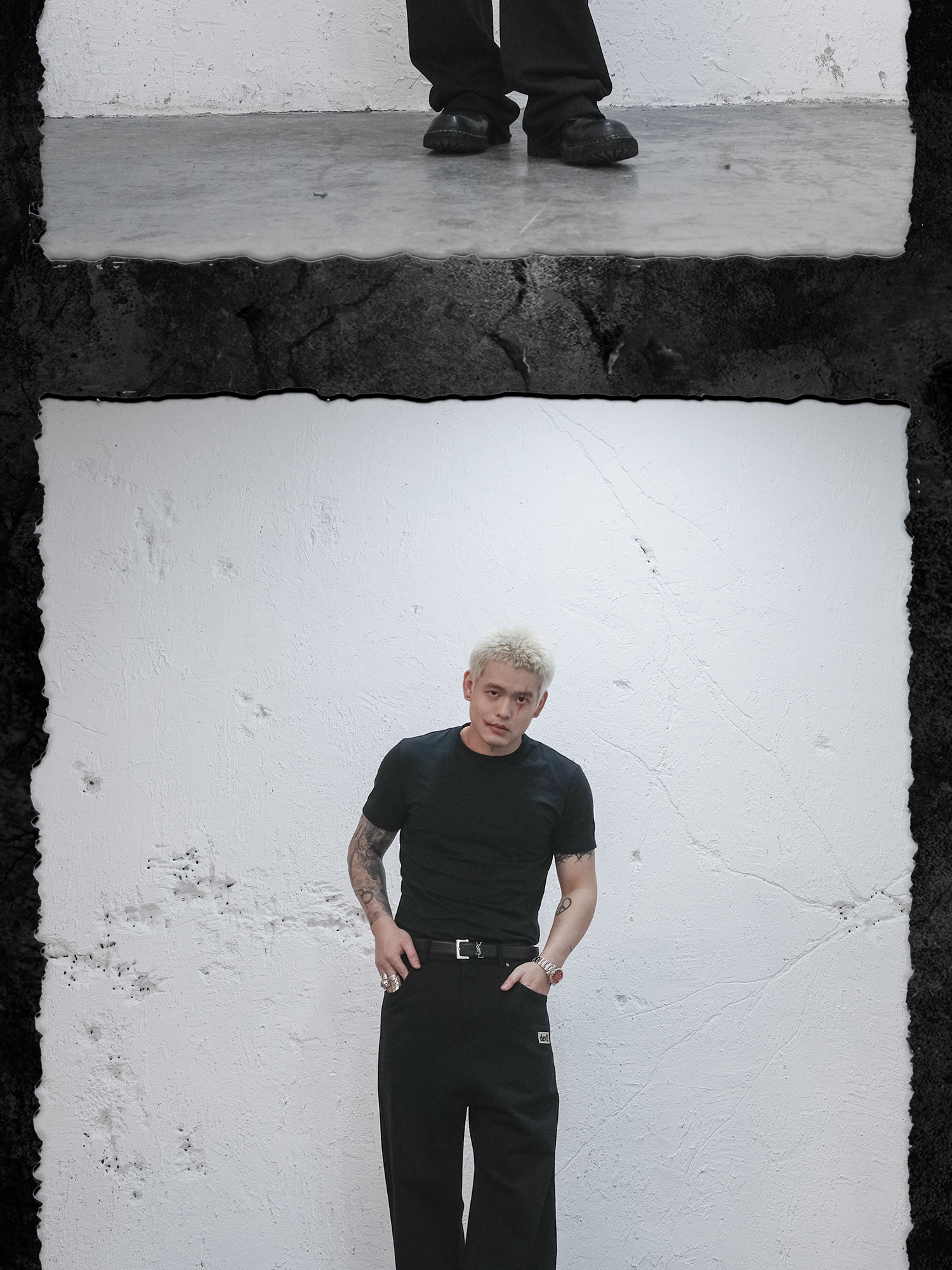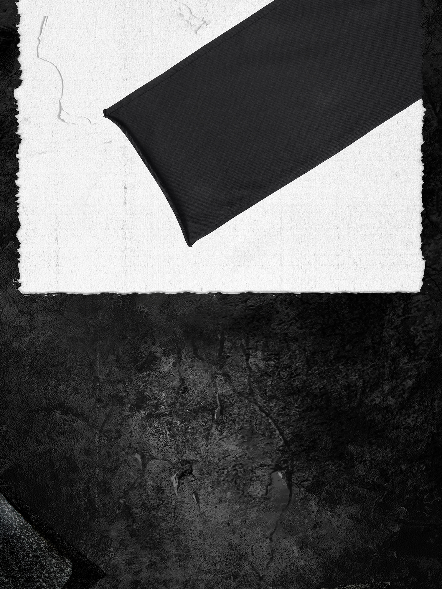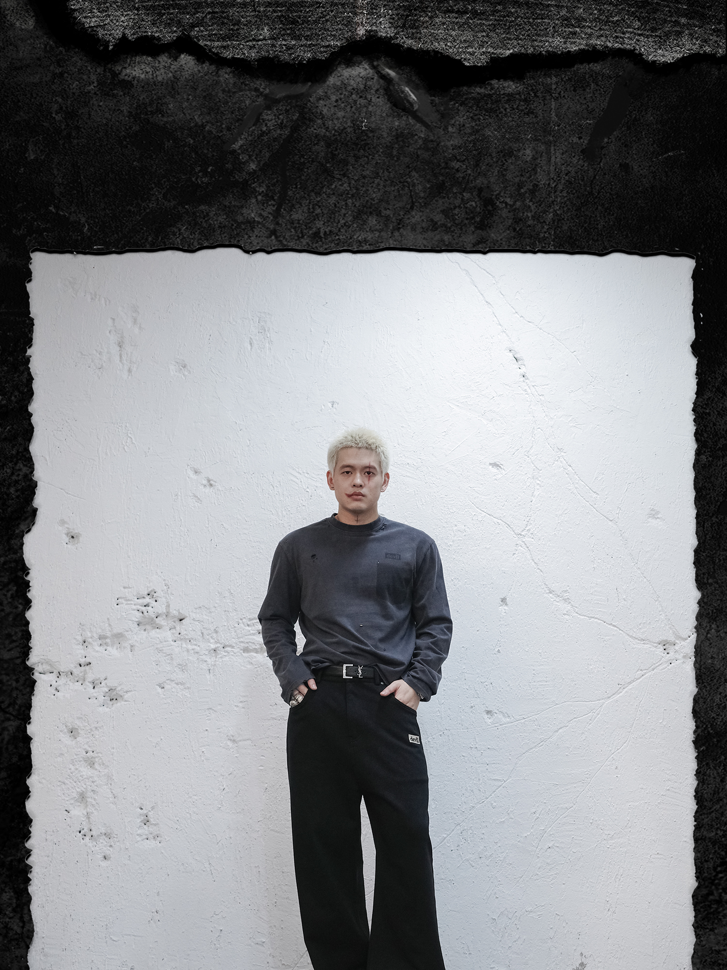 - UW slim straight fit crafted from brushed fleece that mimics the firm structure of denim. The silhouette retains the sharp lines of classic jeans while keeping the softness and ease unique to sweatpants. A red inverted-cross micro-embroidery on the back pocket strikes like a silent blood mark, awakening a darker faith. The raw-cut hems naturally curl, echoing traces of a battlefield that continues to stretch forward in defiance.