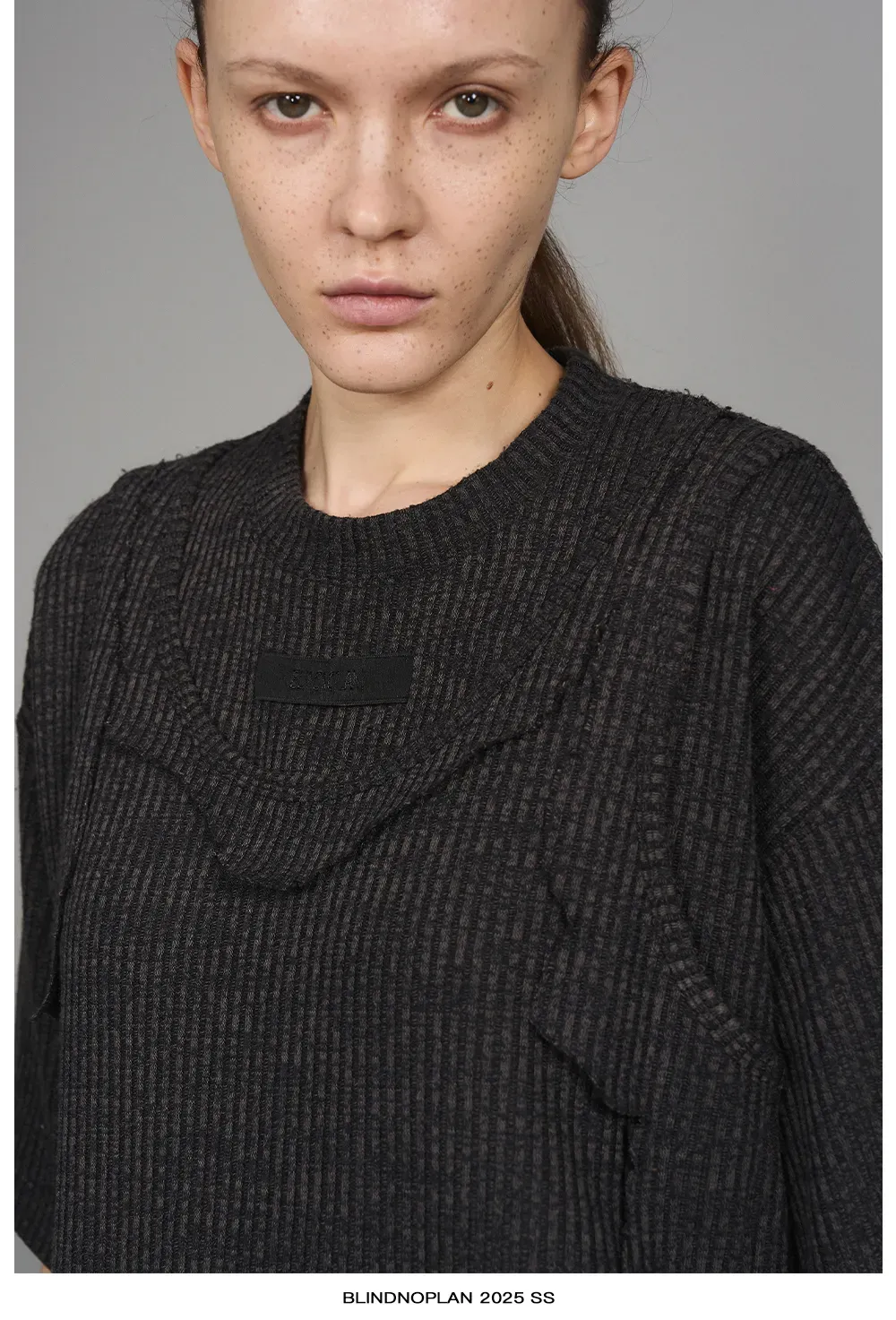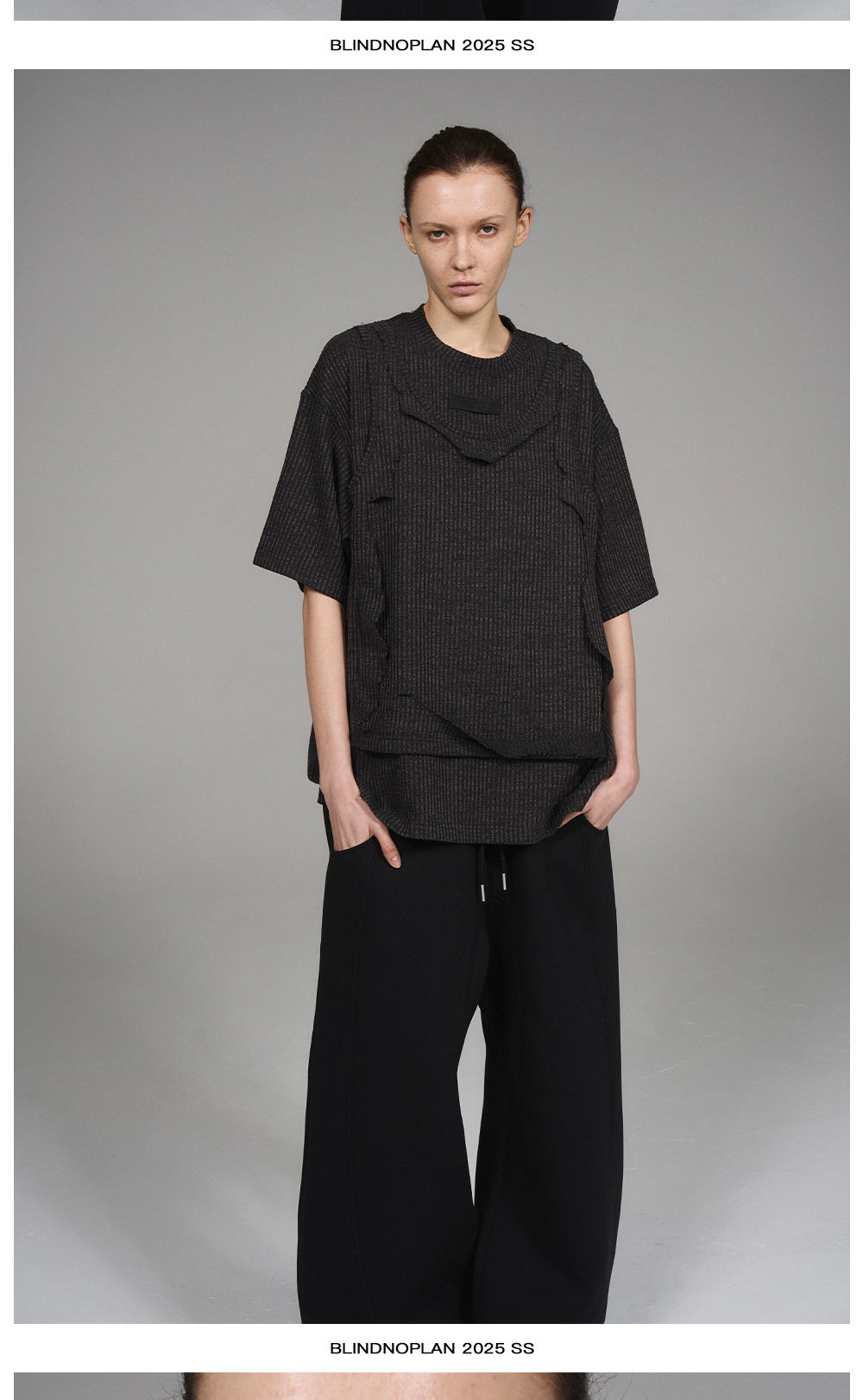 - This loose-fit T-shirt features a faux two-piece spliced front panel, paired with distressed detailing to enhance its visual edge. The design offers versatile wear, blending casual comfort with a bold street-inspired look.