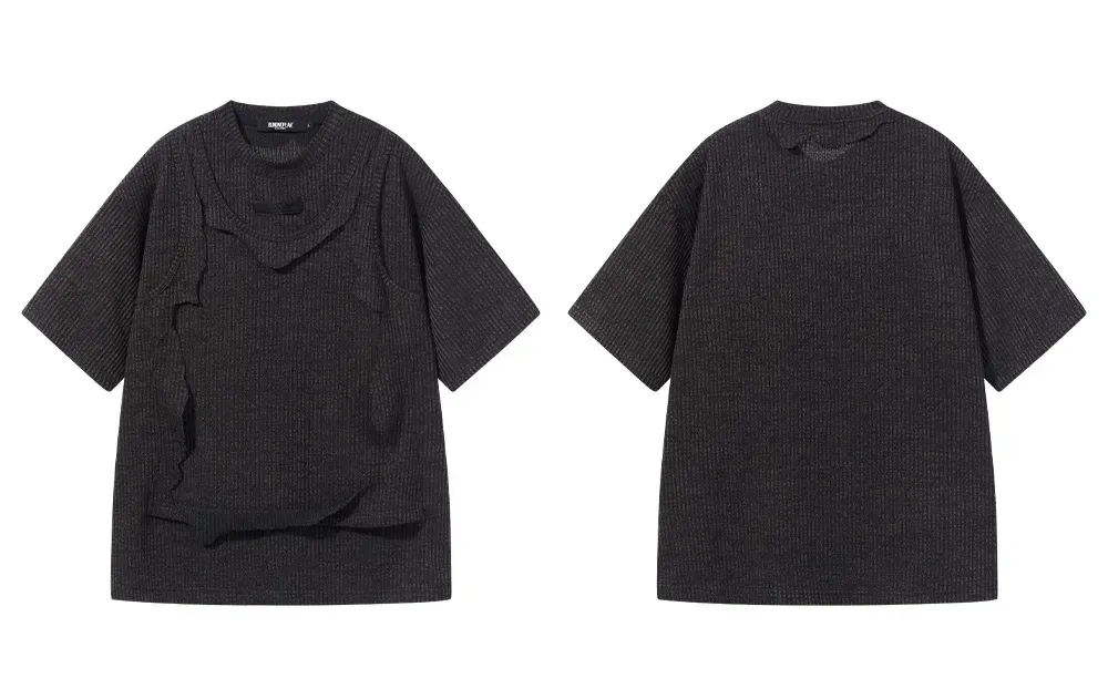 Design Details: This loose-fit T-shirt features a faux two-piece spliced front panel, paired with distressed detailing to enhance its visual edge. The design offers versatile wear, blending casual comfort with a bold street-inspired look.