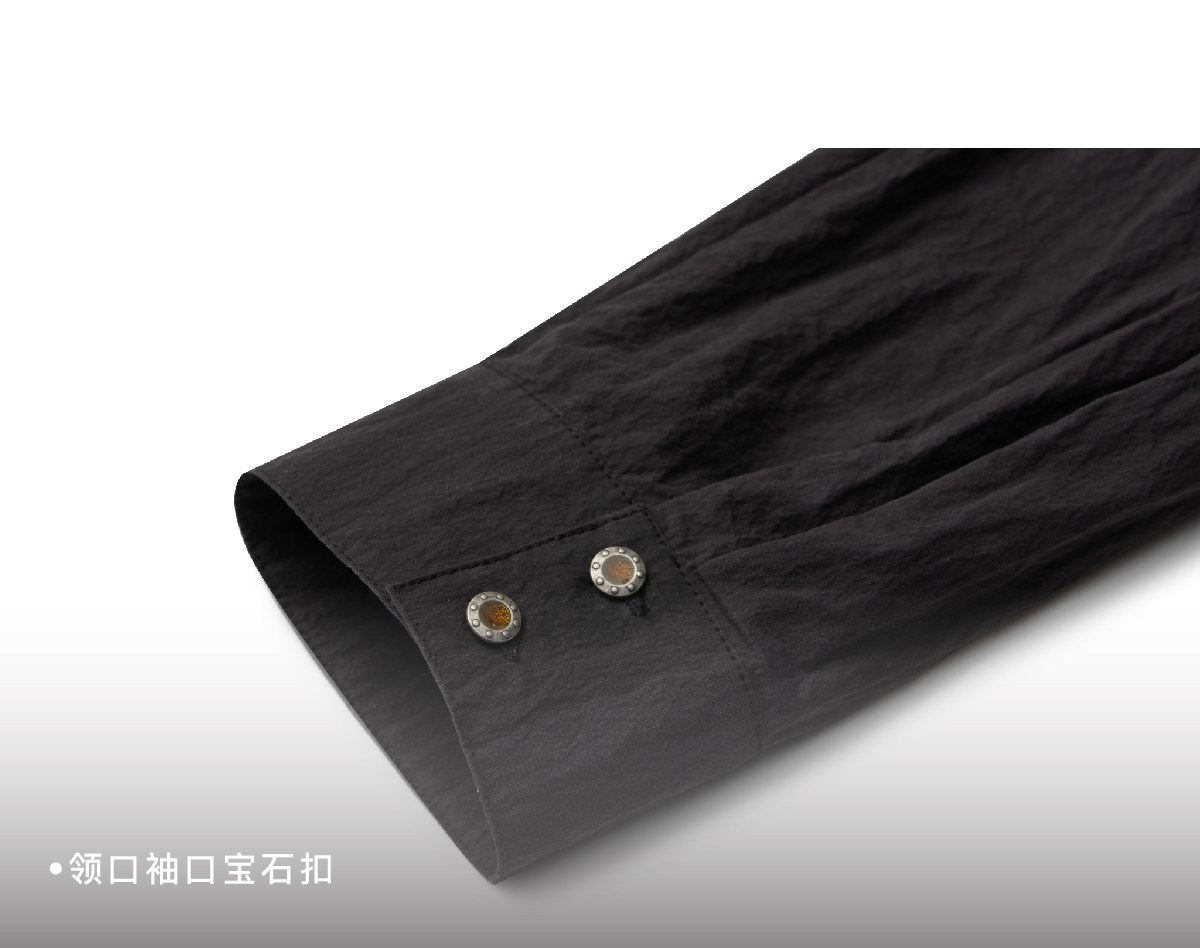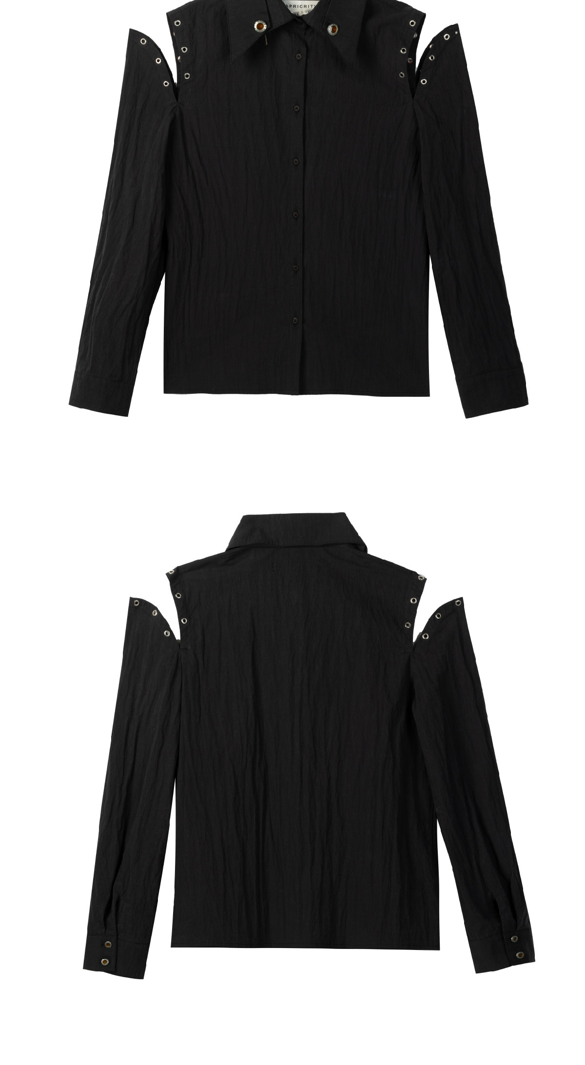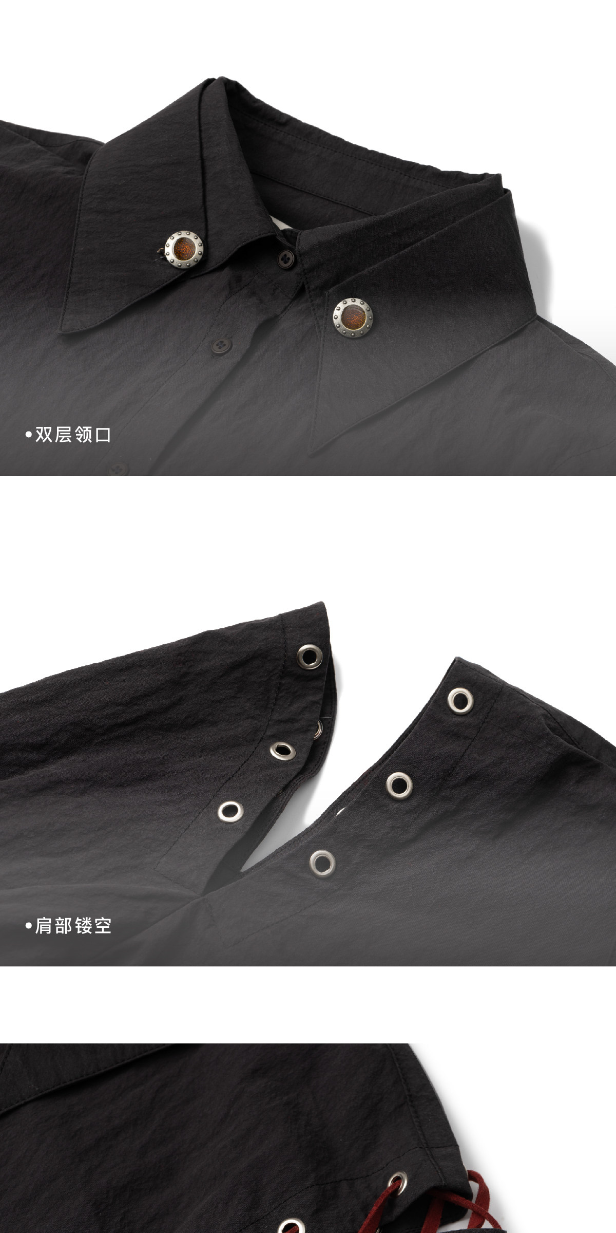 Design Details: Double-layer collar design. Shoulder cut-outs with detachable burgundy velvet straps. 24 silver grommets at shoulders. Gemstone button accents at collar and cuffs.