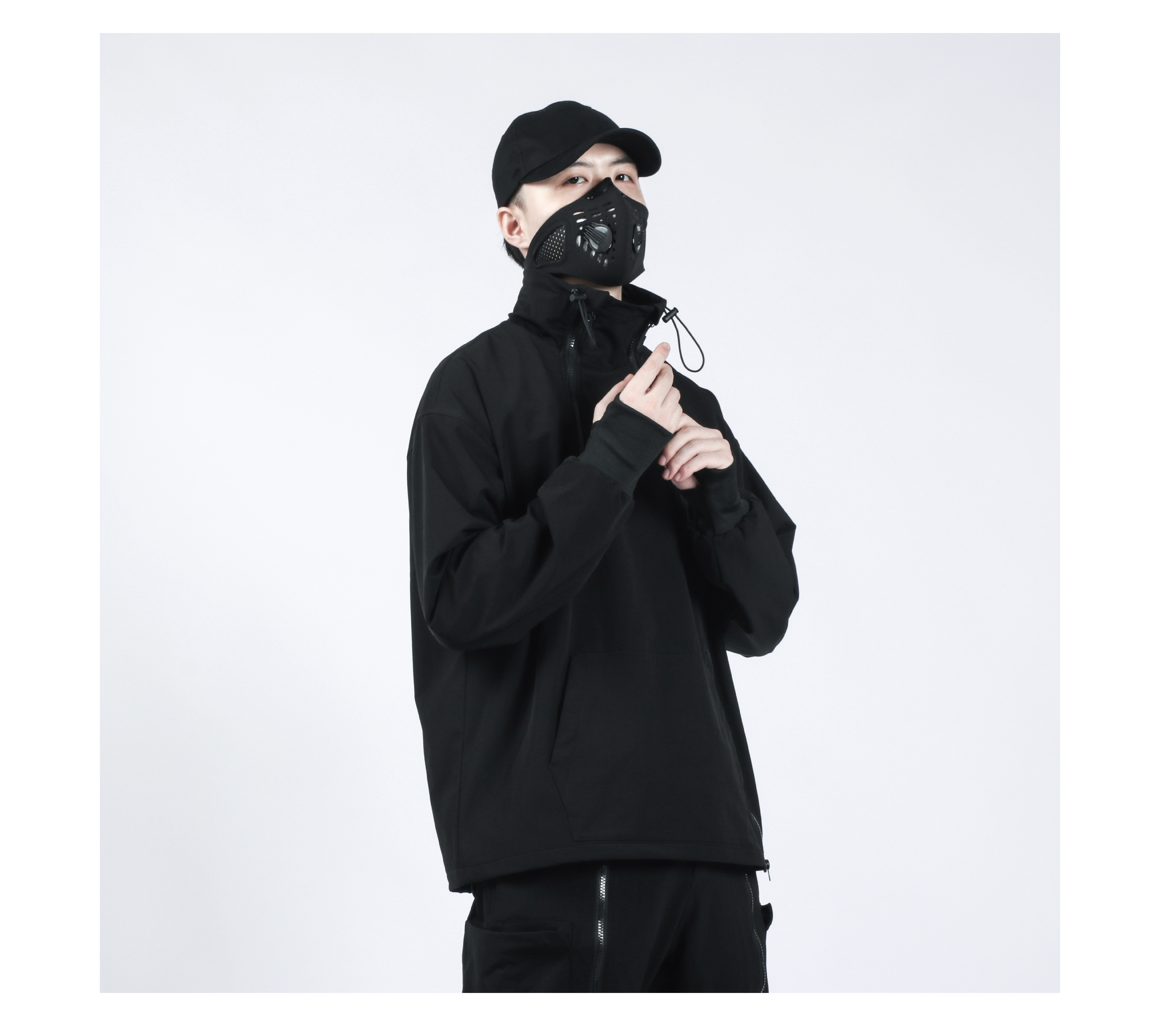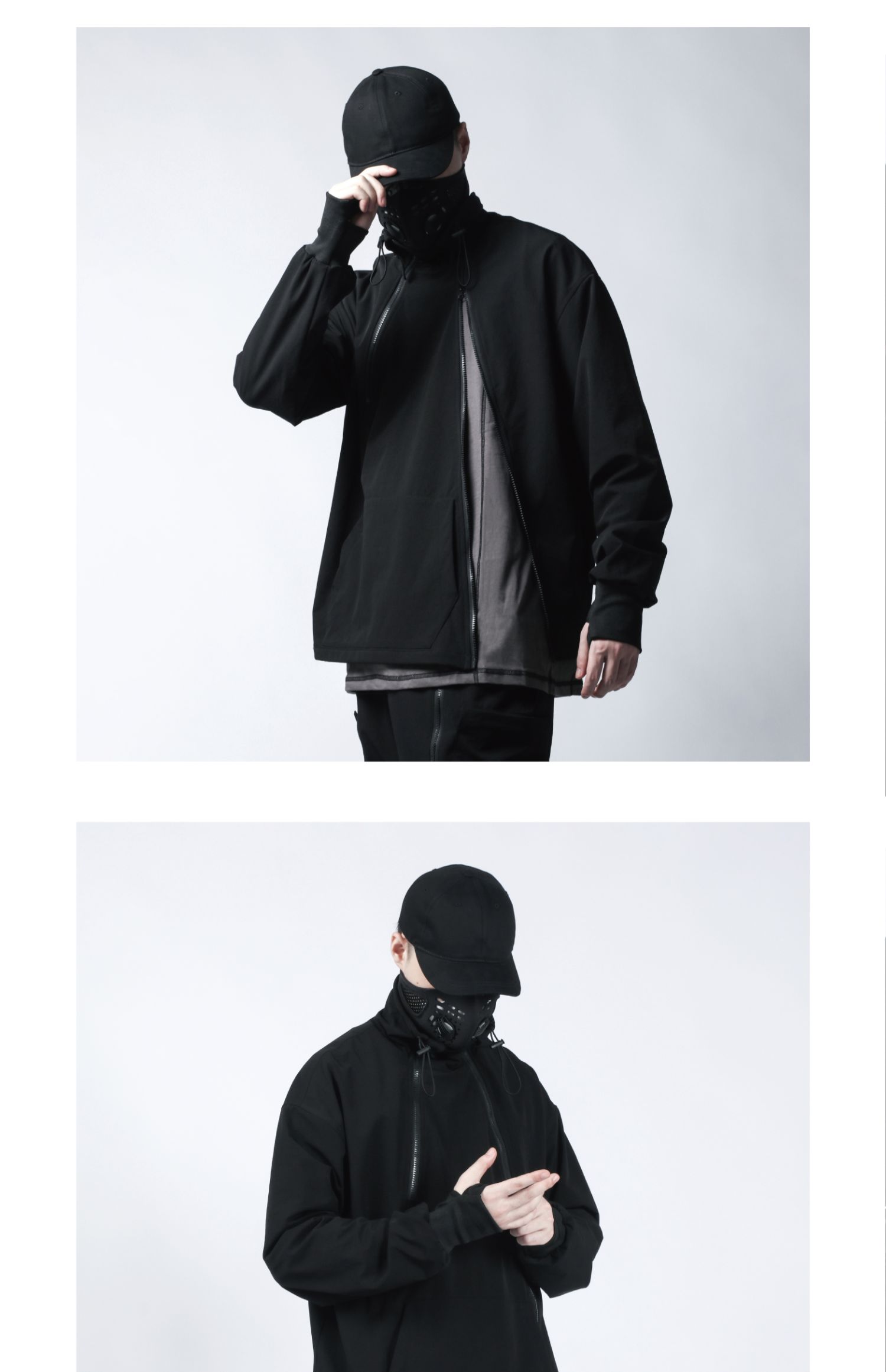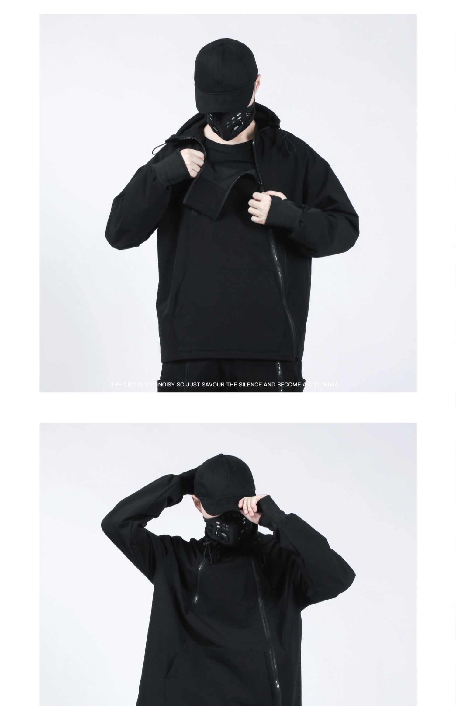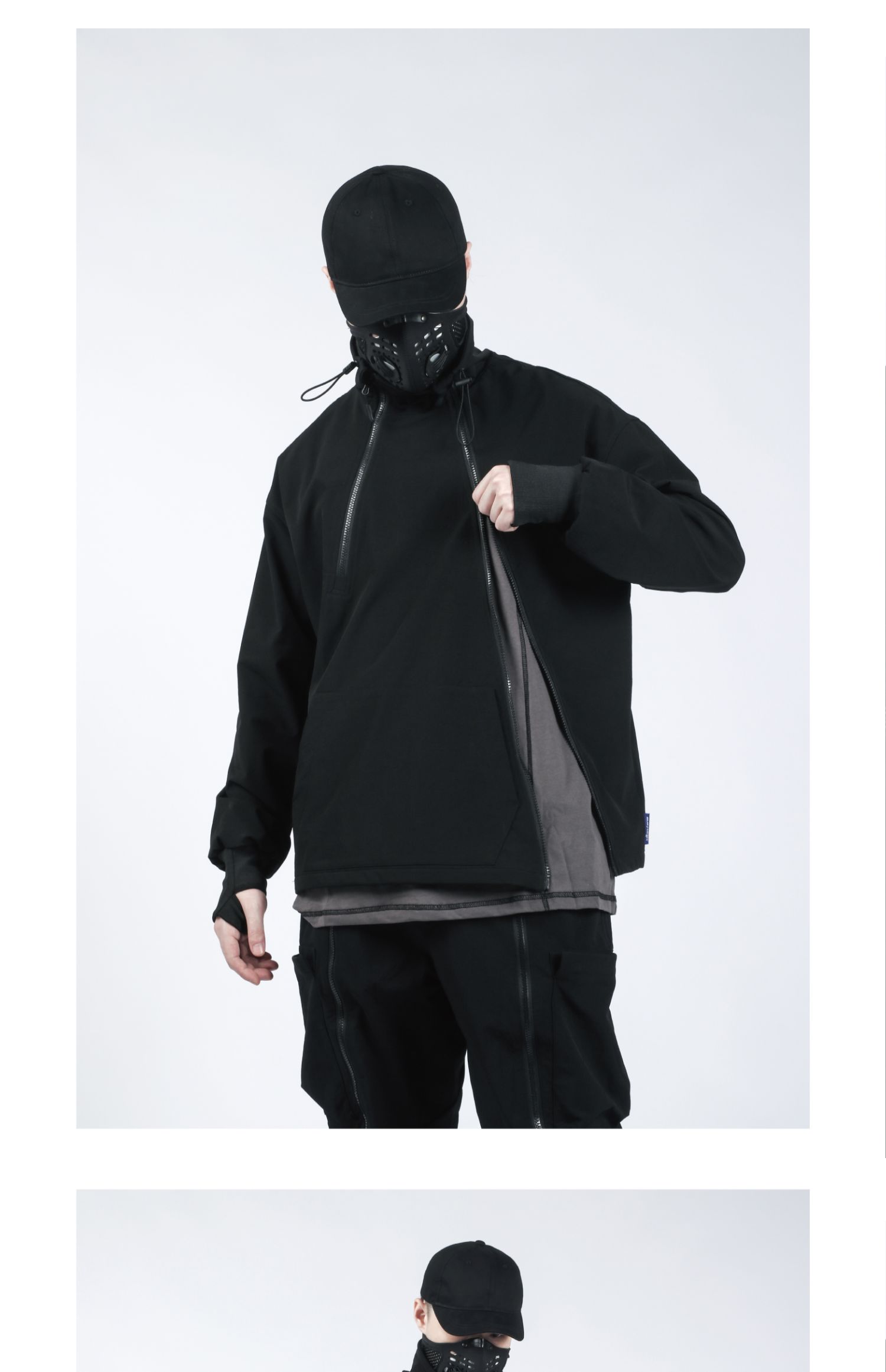 Design Details: Crafted from nylon stretch mountaineering fabric with four-way elasticity, this hoodie offers excellent drape, breathability, moisture-wicking, water resistance, and durability for a comfortable wear. It redefines the conventional hoodie silhouette with a relaxed fit and multi-layered structural details. Featuring dual resin zippers, the hoodie can be worn and adjusted in multiple configurations, allowing seamless switching between hoodie and jacket modes. A high collar with drawstring provides wind protection while adding a bold style element. The angled left zipper echoes the right zipper, creating a functional yet visually striking asymmetry—a perfect combination of comfort, versatility, and urban style.