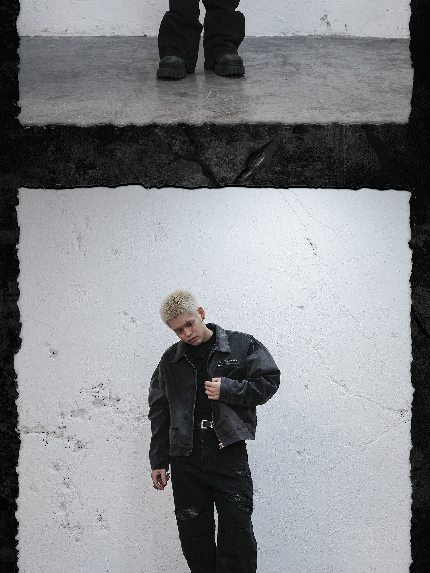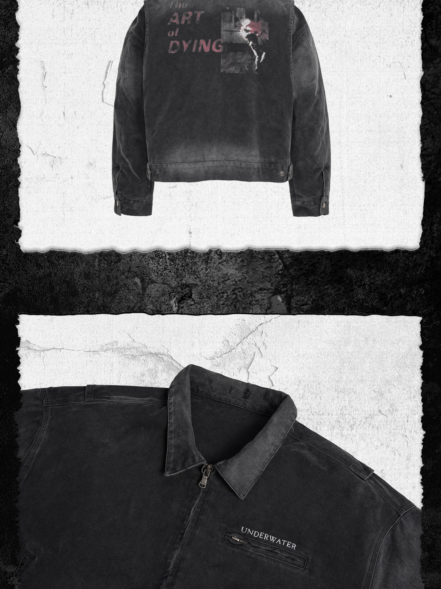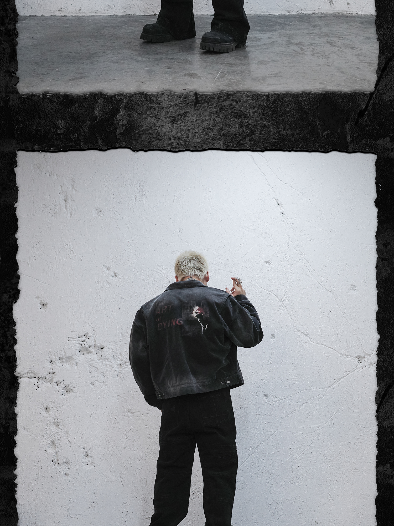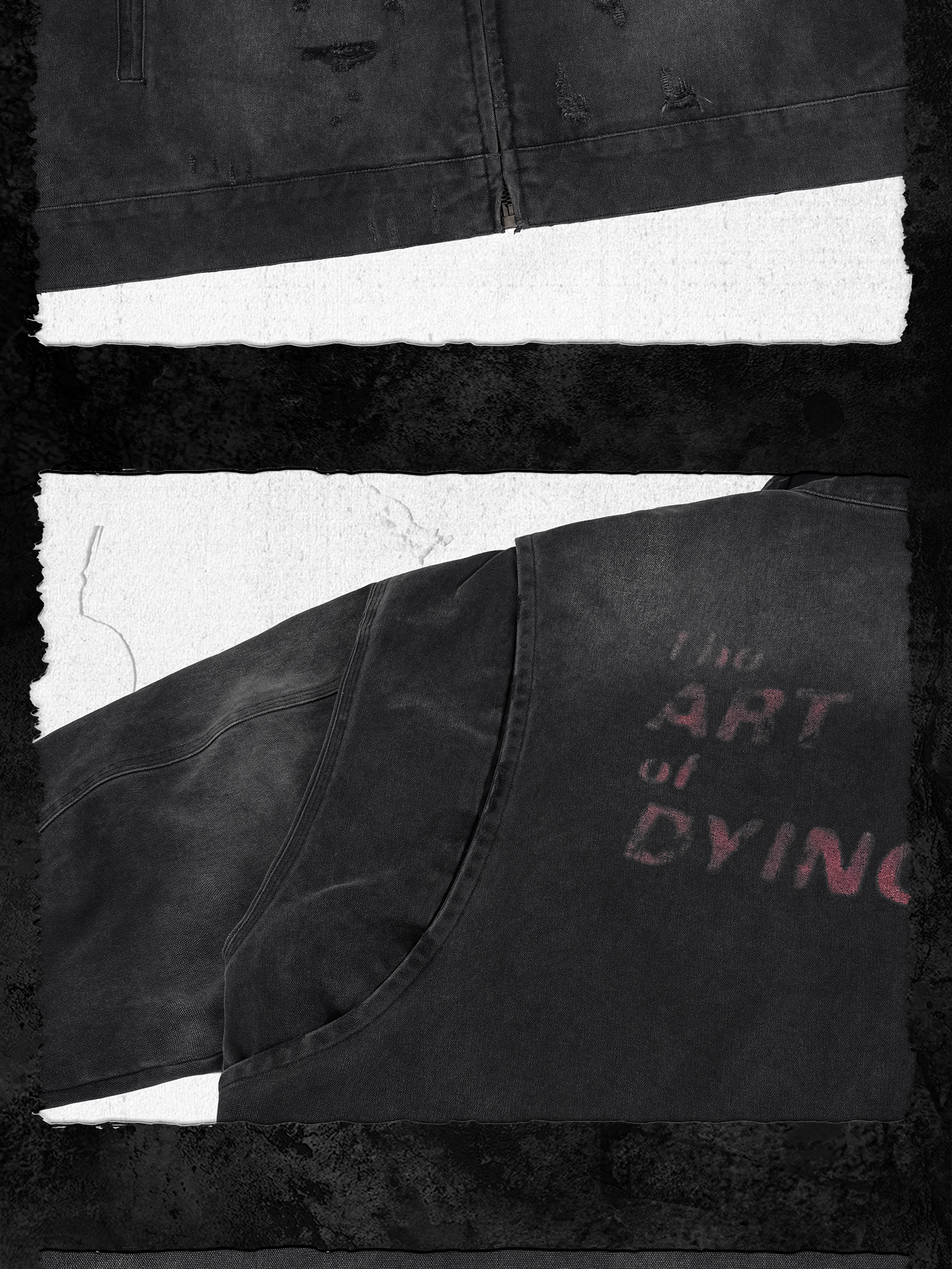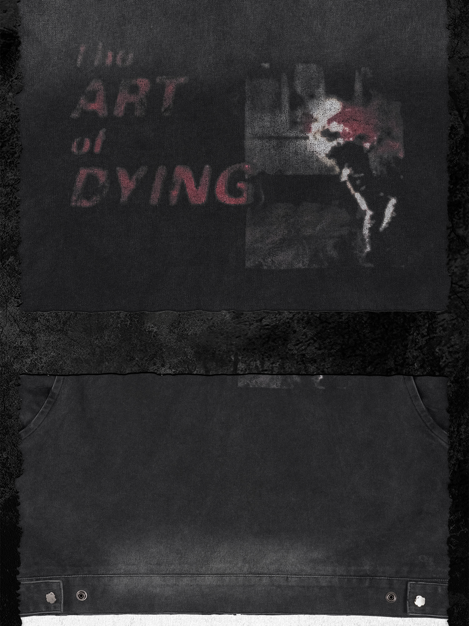 - Designed in a UW boxy tailored silhouette, this jacket is crafted from heavy, high-density double-layer canvas, delivering a structured shape while maintaining comfort and durability. The Conli direct-spray printing technique precisely presents the “Dying Art” thematic graphic, and the deconstructed flap detail on the back enhances the shoulder and back contour. Industrial washing paired with monkey-spray fading creates a gradient aged effect, while hand-applied distressing at key points adds depth. A fusion of classic workwear structure and contemporary dark aesthetics, it embodies a modern interpretation of industrial rebellion.