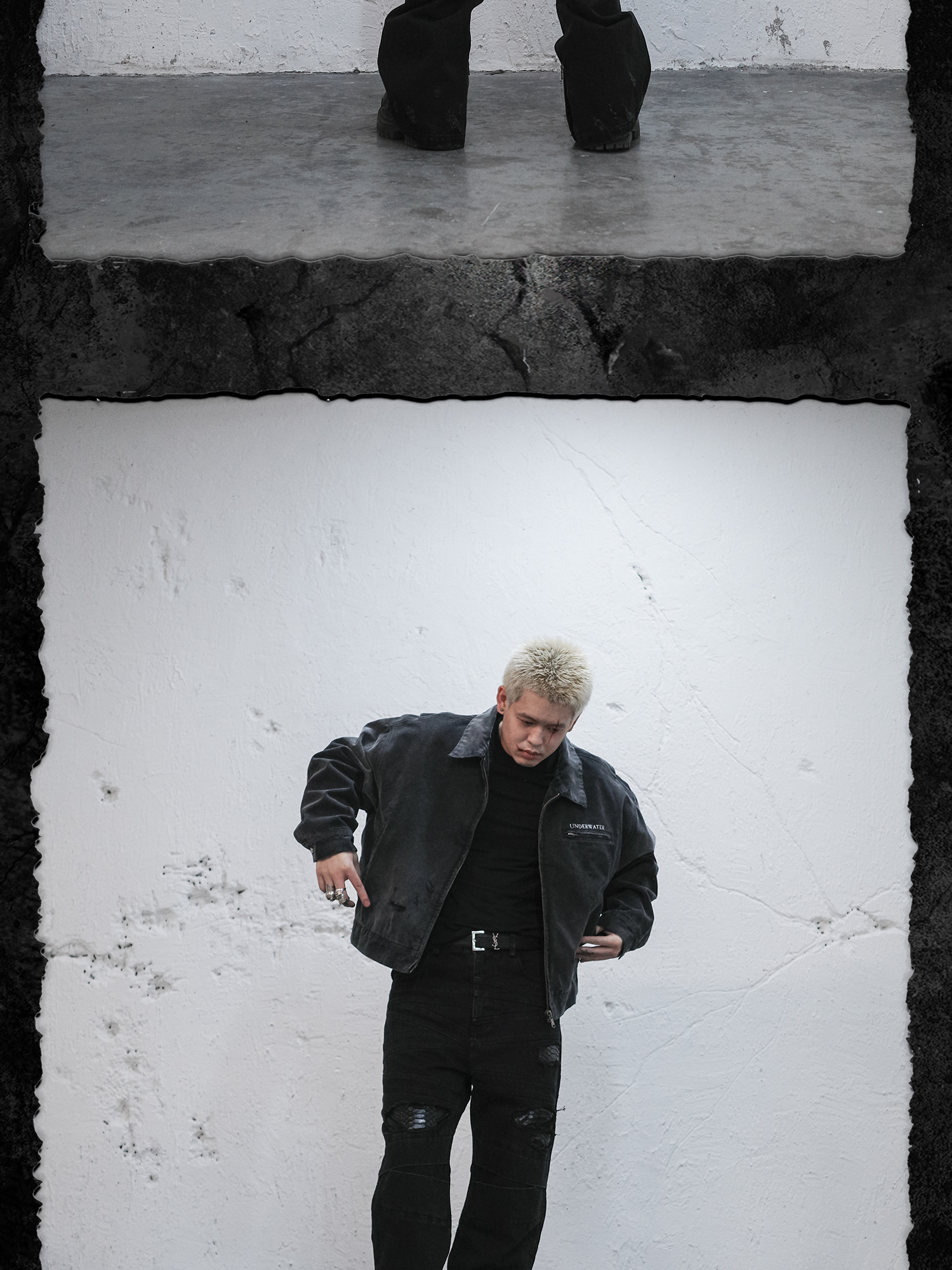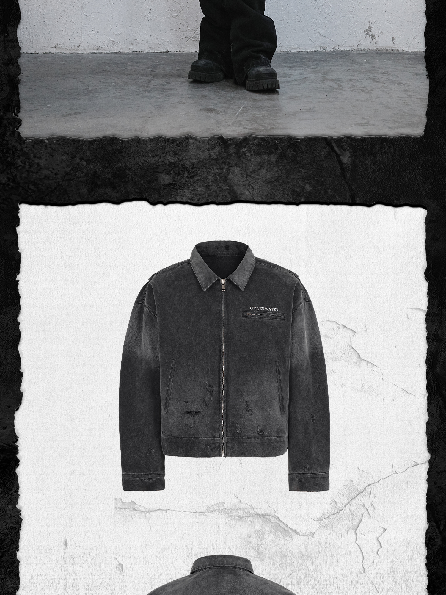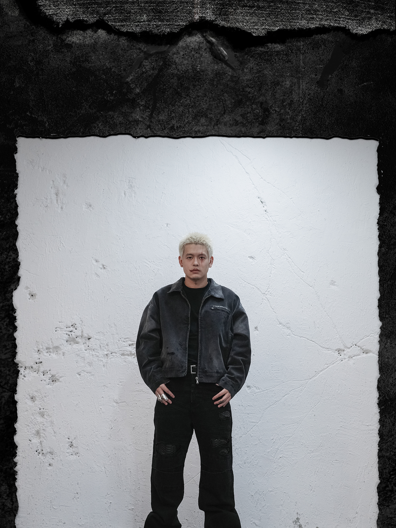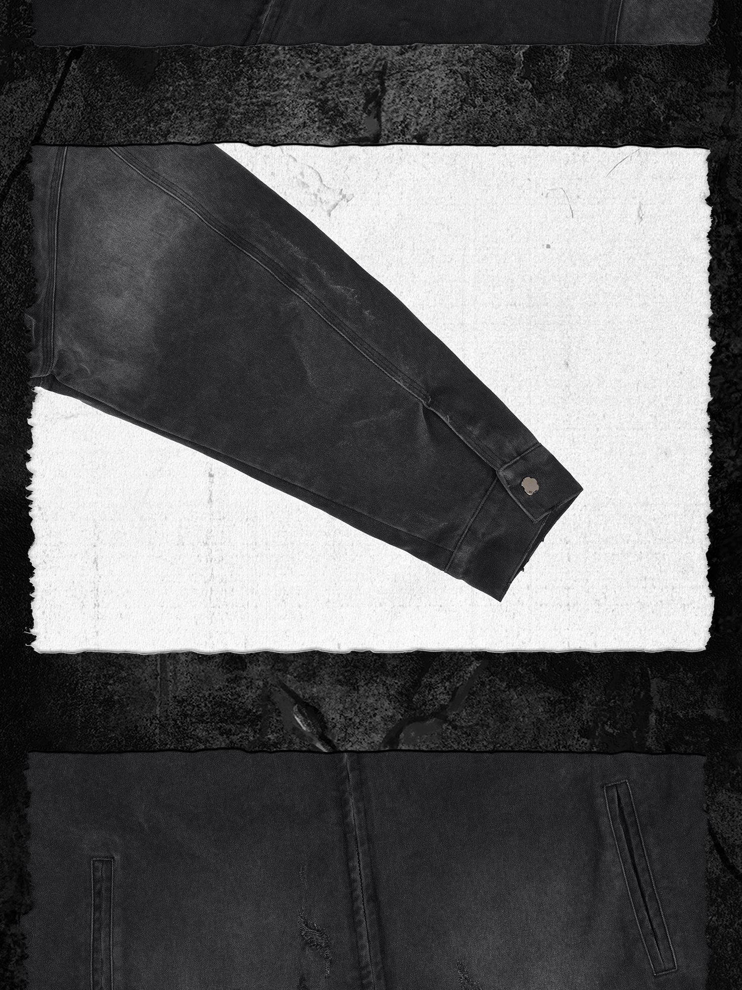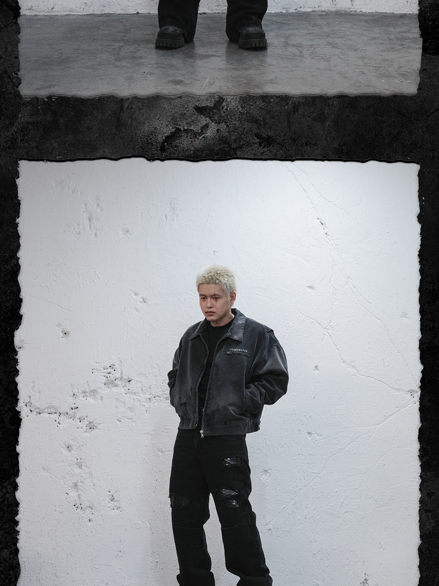 - Designed in a UW boxy tailored silhouette, this jacket is crafted from heavy, high-density double-layer canvas, delivering a structured shape while maintaining comfort and durability. The Conli direct-spray printing technique precisely presents the “Dying Art” thematic graphic, and the deconstructed flap detail on the back enhances the shoulder and back contour. Industrial washing paired with monkey-spray fading creates a gradient aged effect, while hand-applied distressing at key points adds depth. A fusion of classic workwear structure and contemporary dark aesthetics, it embodies a modern interpretation of industrial rebellion.