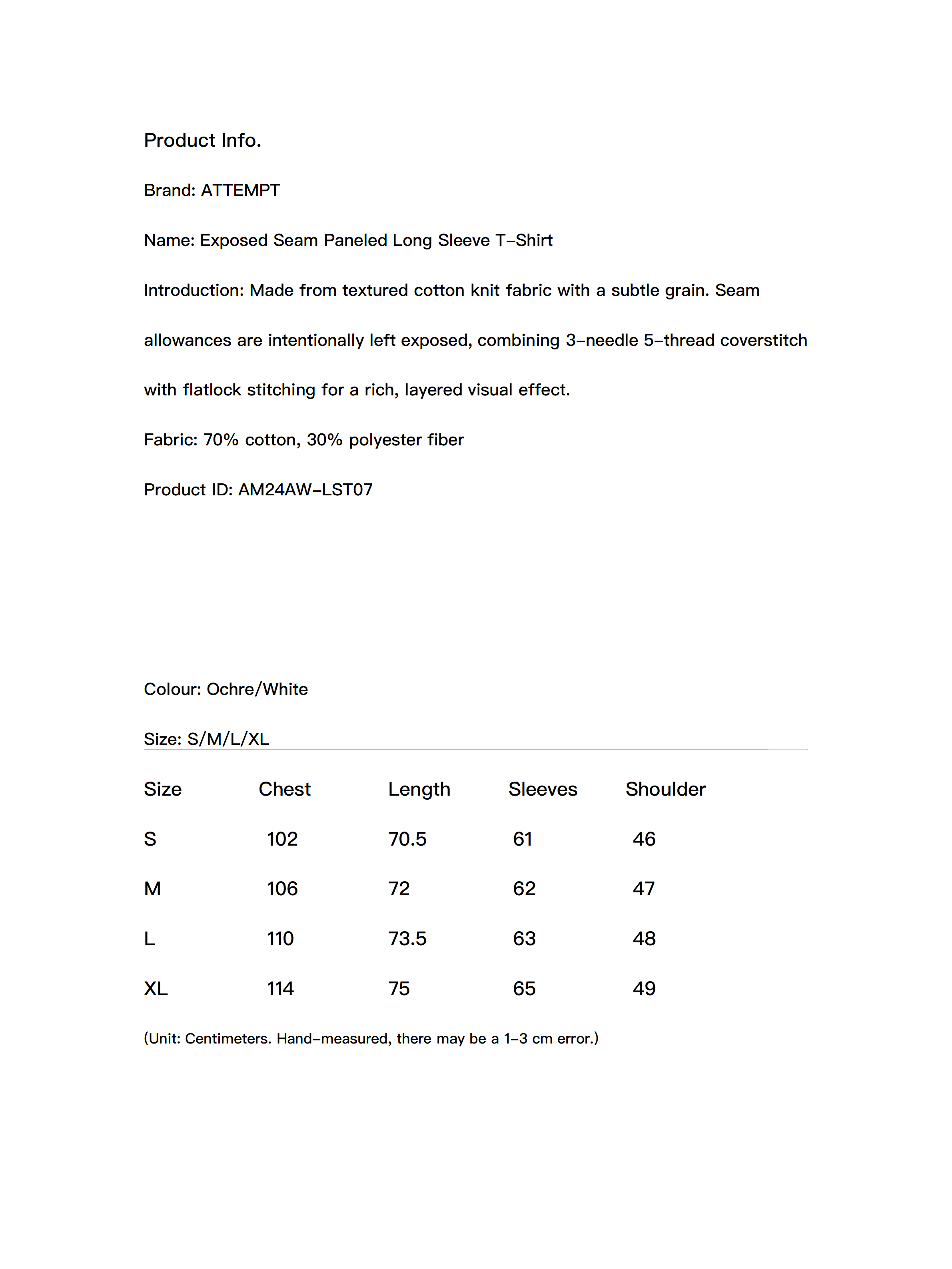 Made from textured cotton knit fabric with a subtle grain. Seam allowances are intentionally left exposed, combining 3-needle 5-thread coverstitch with flatlock stitching for a rich, layered visual effect.