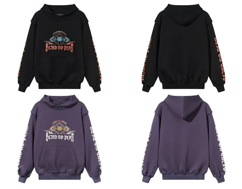 Design Details: Fake two-piece design with silk screen printing on the body and sleeves, embroidered detailing on the back collar, and ribbed hem for enhanced quality.