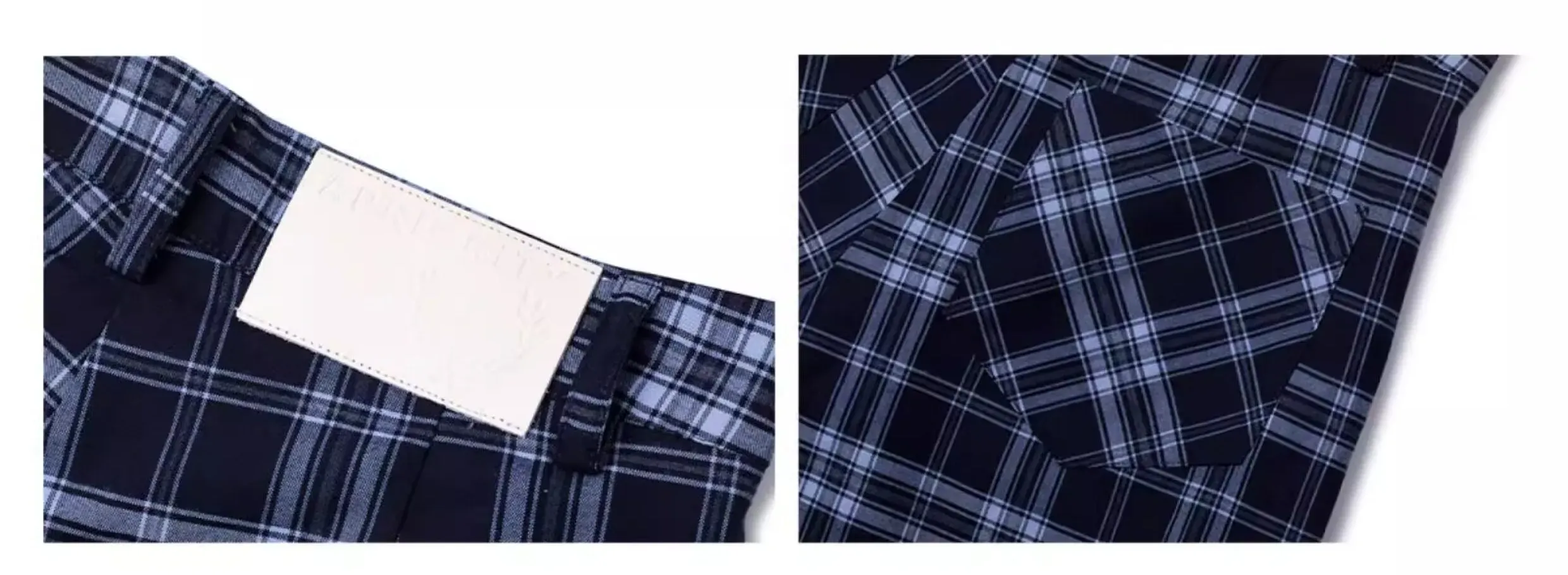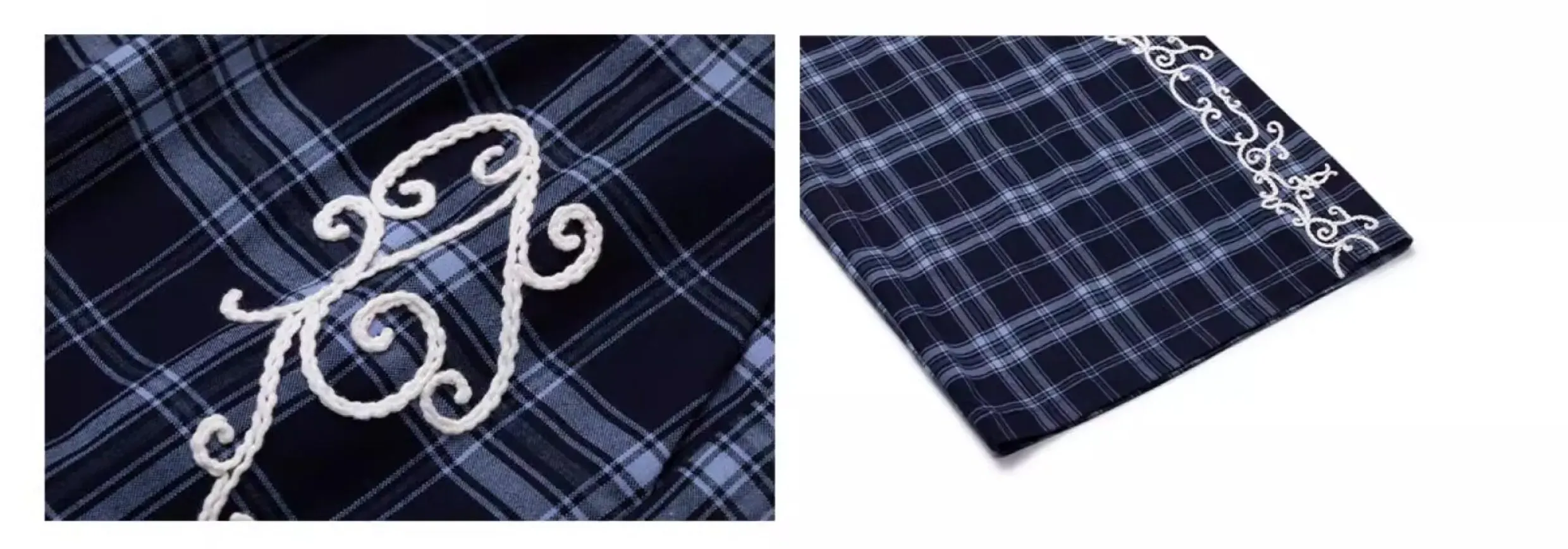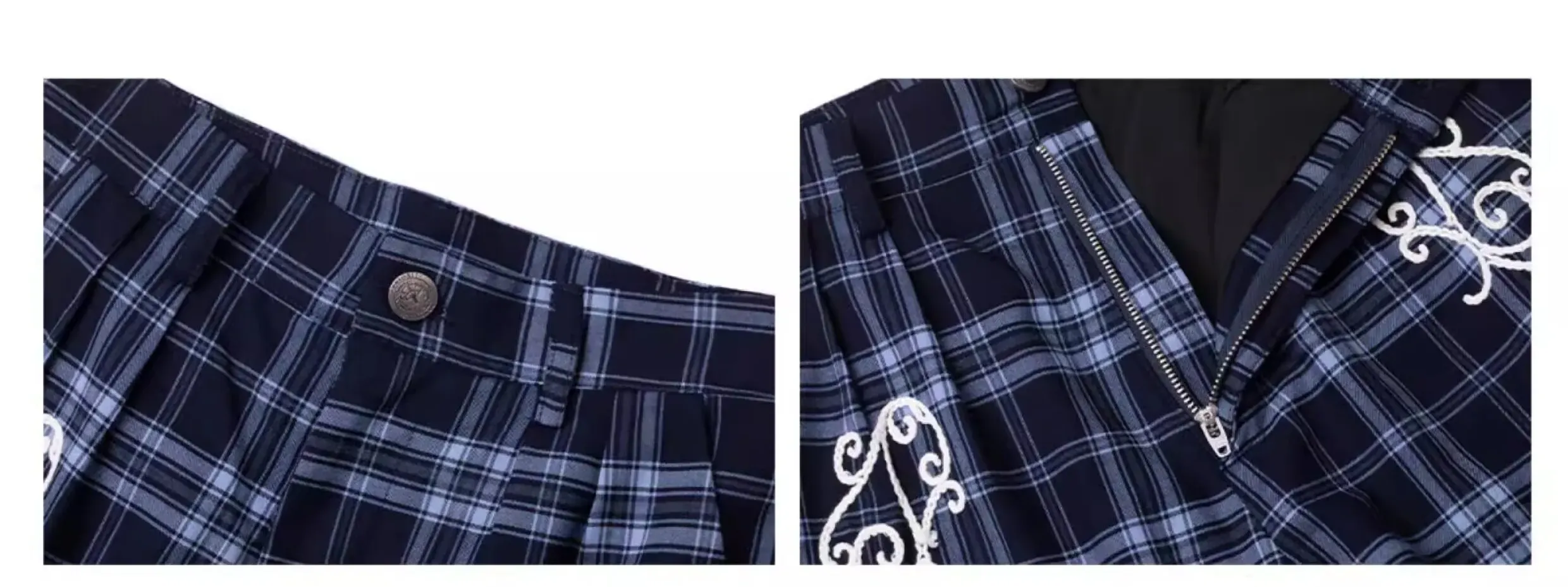 Design Details: YKK metal zipper; custom metal buttons at waist. Chenille embroidery technique; custom genuine leather patch at back waist. Original embroidered graphic design; large-scale embroidery on both leg sides. Blue check fabric; relaxed loose silhouette.
