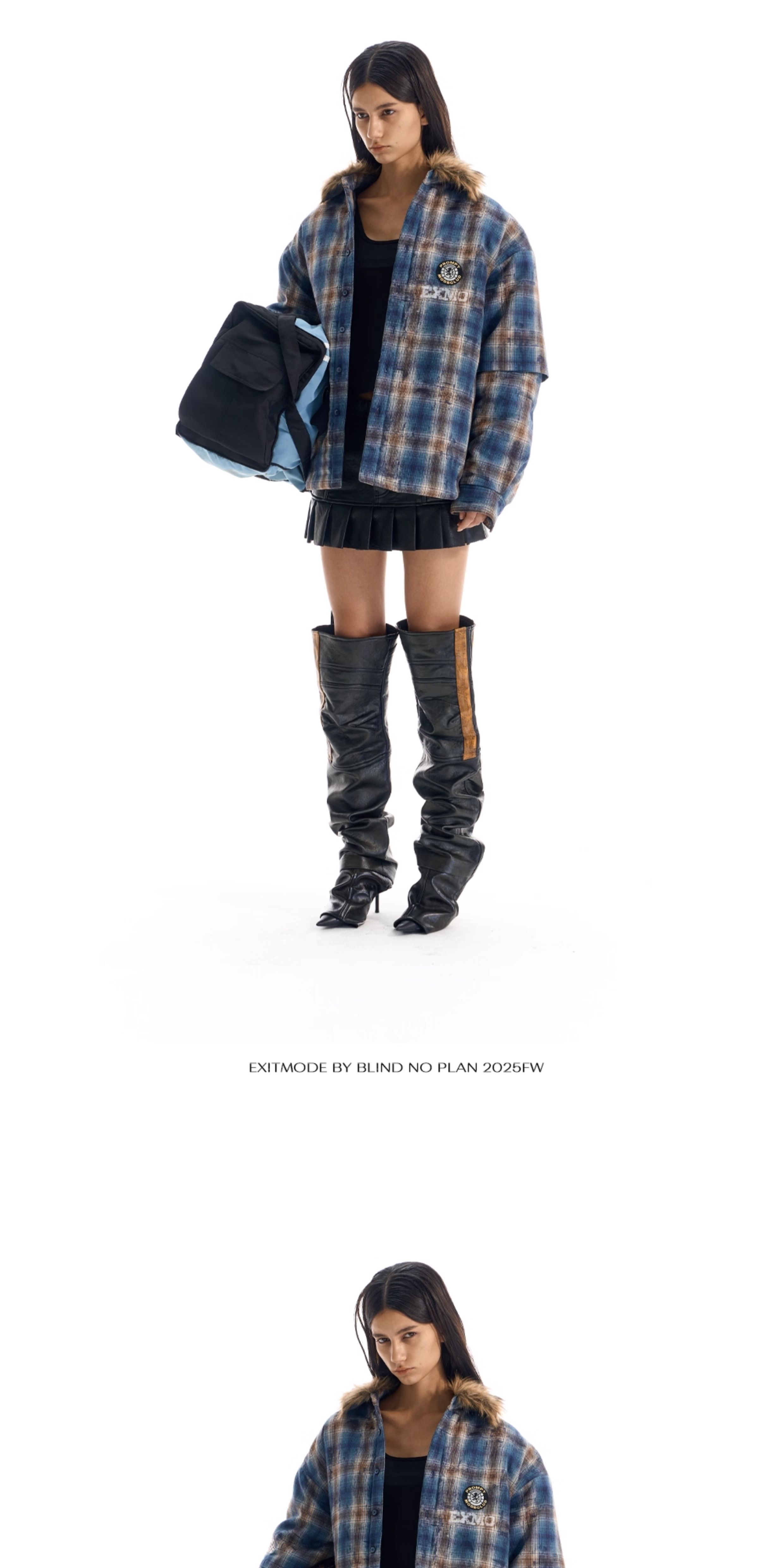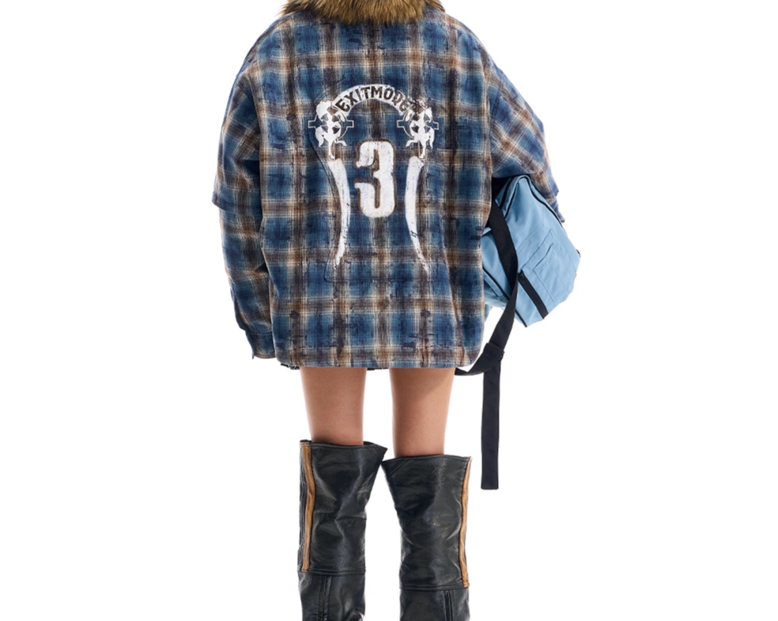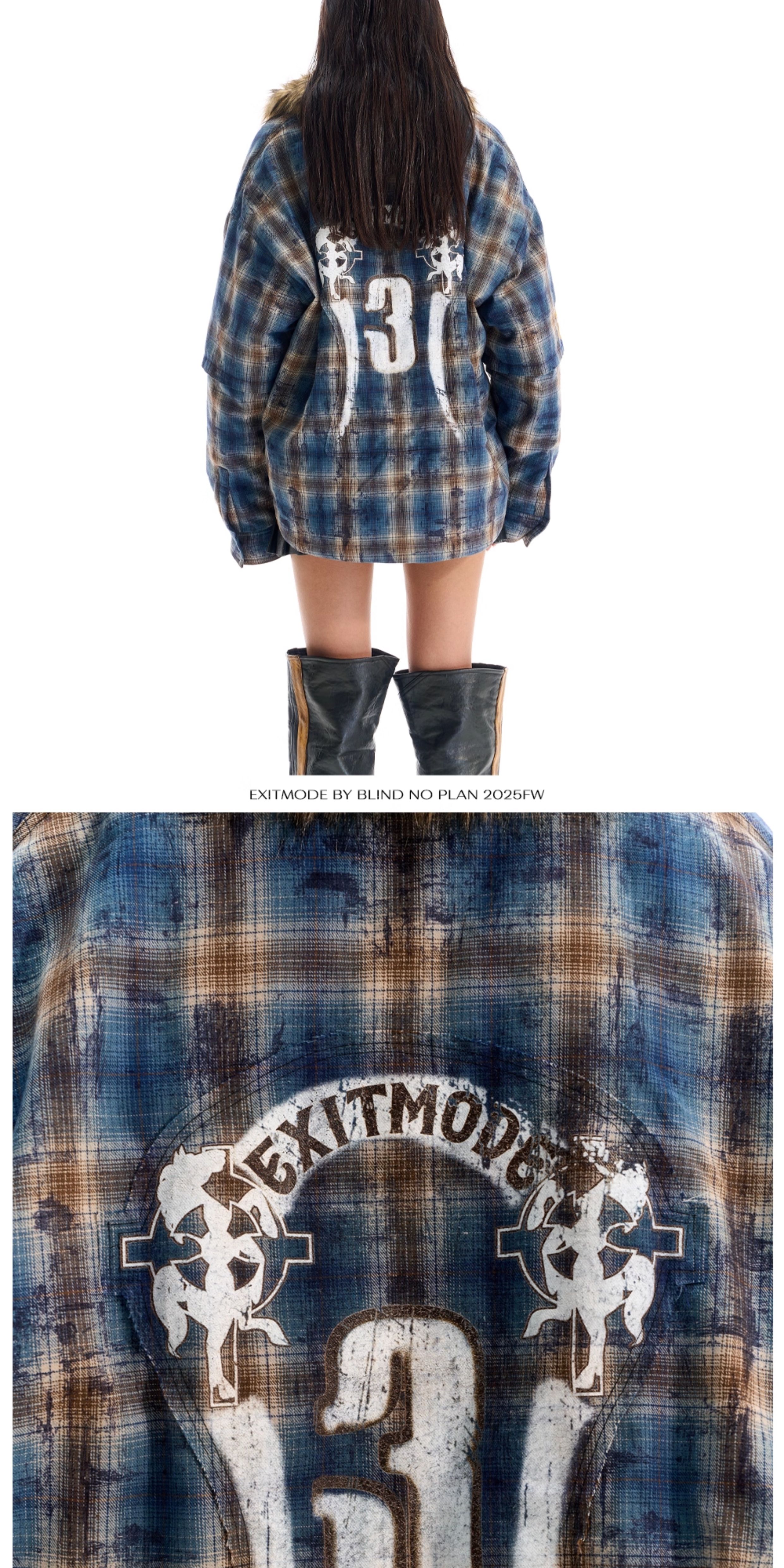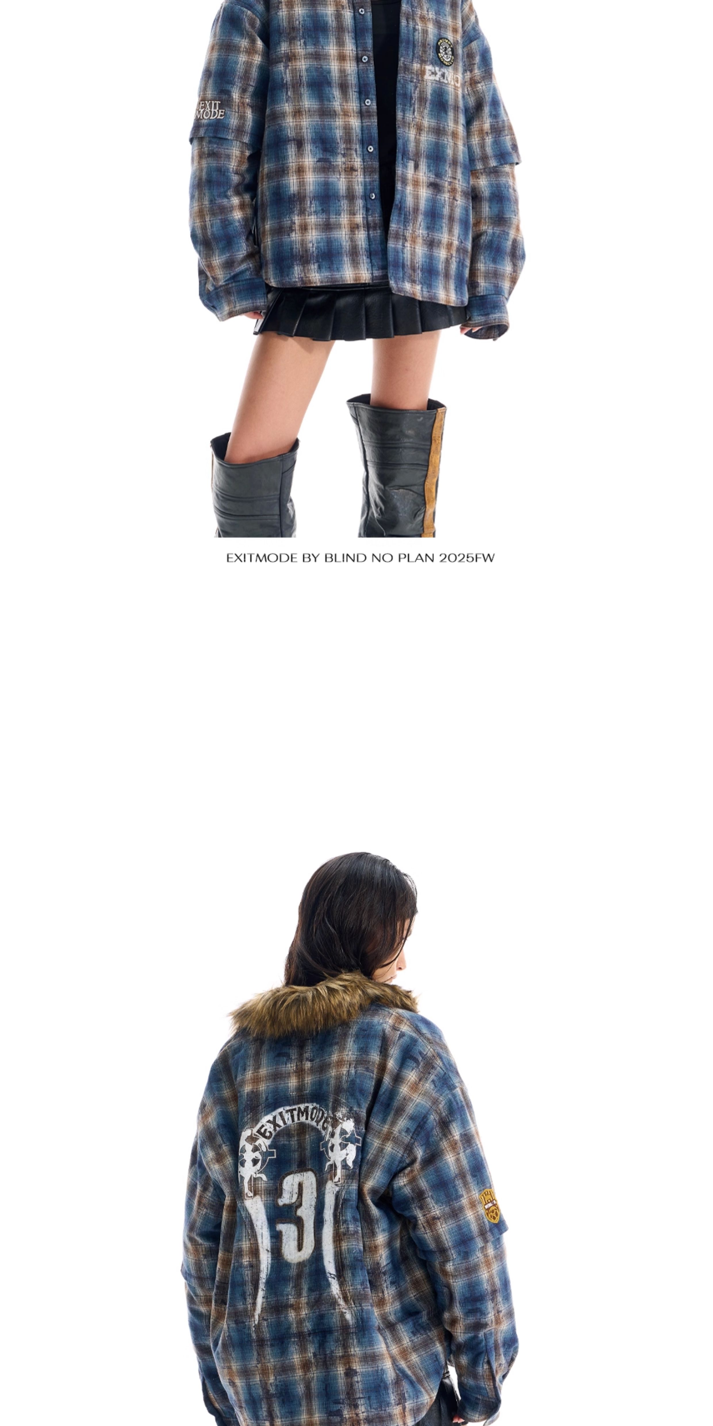 - This jacket features a loose fit, reimagining the traditional plaid shirt with a plush fur collar for added warmth and style. The body is enhanced with printed and embroidered details, while the back showcases patch embroidery, bringing depth and a unique layered aesthetic.