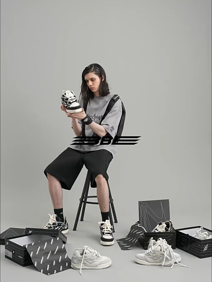 - In terms of the craftsmanship of the sneakers, we adopt an "avant-garde" approach while retaining the "retro" texture. We apply bordering treatment to the toe joint, using a dripping method to apply a small amount of bordering, creating a layered and optimized aesthetic for the toe joint. The side of the shoe is made of double-layer flame-shaped leather, with a hot-cut 1.5mm, and the main logo "FAME" (B) is embossed with TPU, achieving a sculptural three-dimensional visual effect on the side through high-pressure technology and high-frequency hot wave cutting. The tongue and heel of the shoe incorporate TPU with crystal jelly wrapping, creating an organic combination with the shoe body that is avant-garde and adds diversity to the "ele-ment."