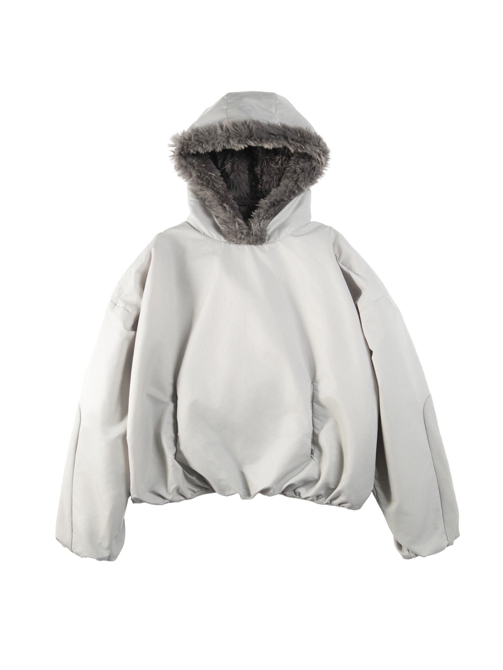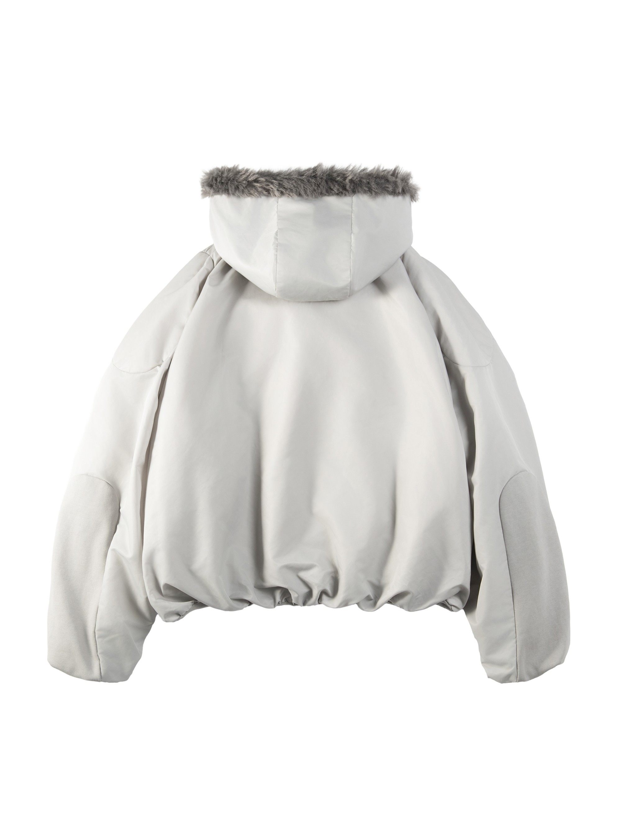 • Featuring a cropped wide silhouette with rounded design lines that create a cocoon-like fit. The sand‑grey nylon shell is water‑resistant, windproof, and offers a smooth, refined hand‑feel. The hood is lined with a graded shearling collar. Filled with medium‑weight washed cotton for lightweight warmth. Sleeve panels are contrasted with custom‑knit ribbed fabric.
